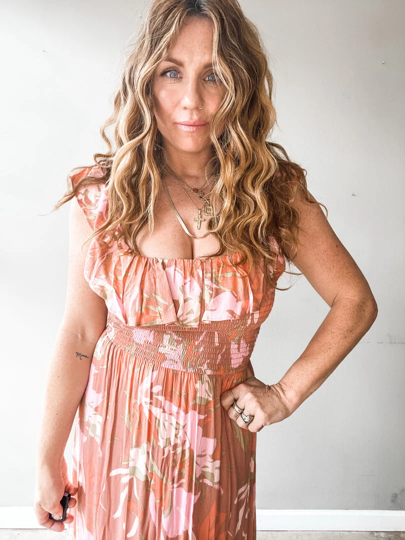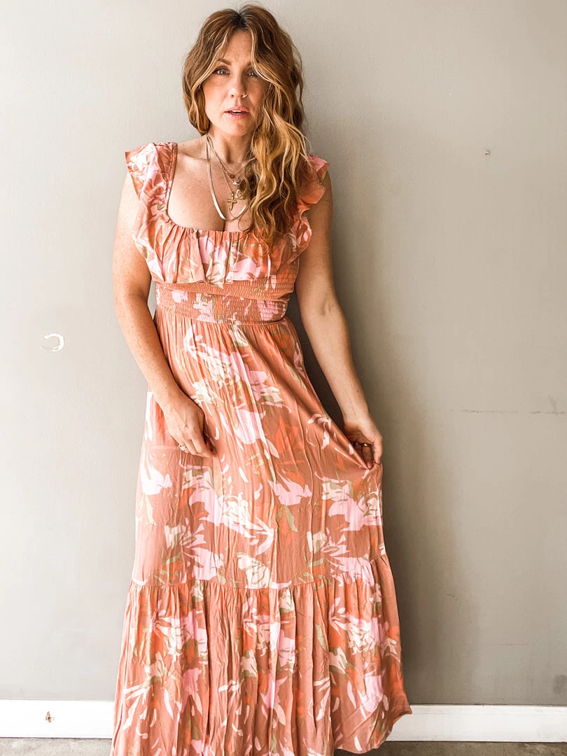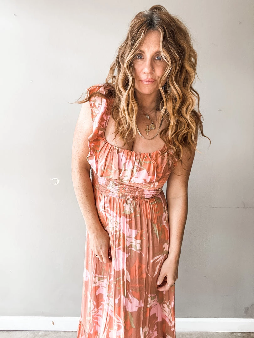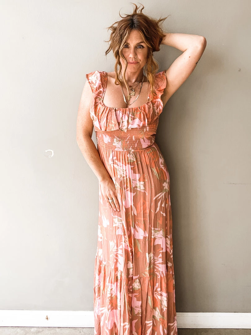 The California Blooming Maxi Dress is a silhouette we just can’t get enough of!!! This flattering maxi dress has a smocked top (great for all bust sizes), ruffle sleeve, and open tie back details. An easy, comfortable fit and perfect for all your spring and summer events and vacations!