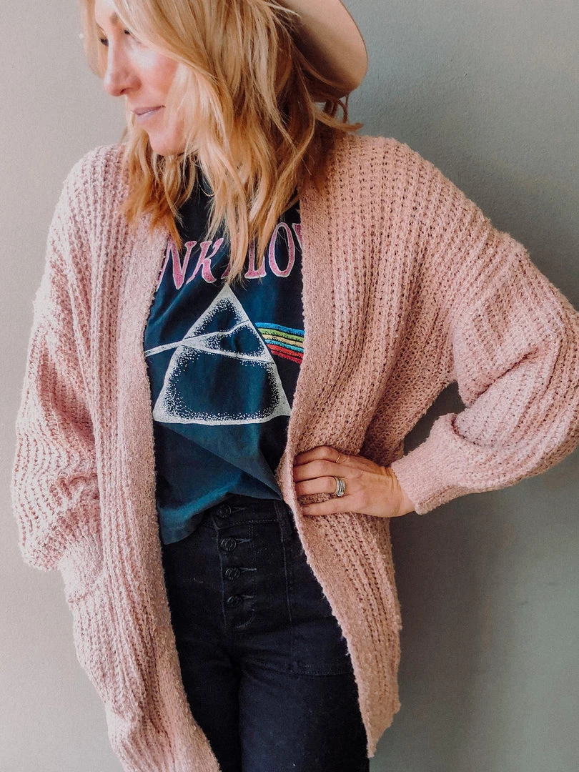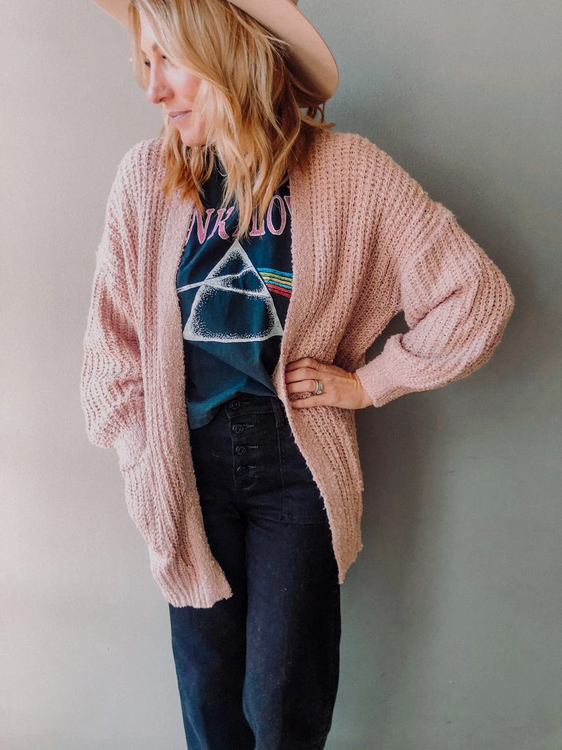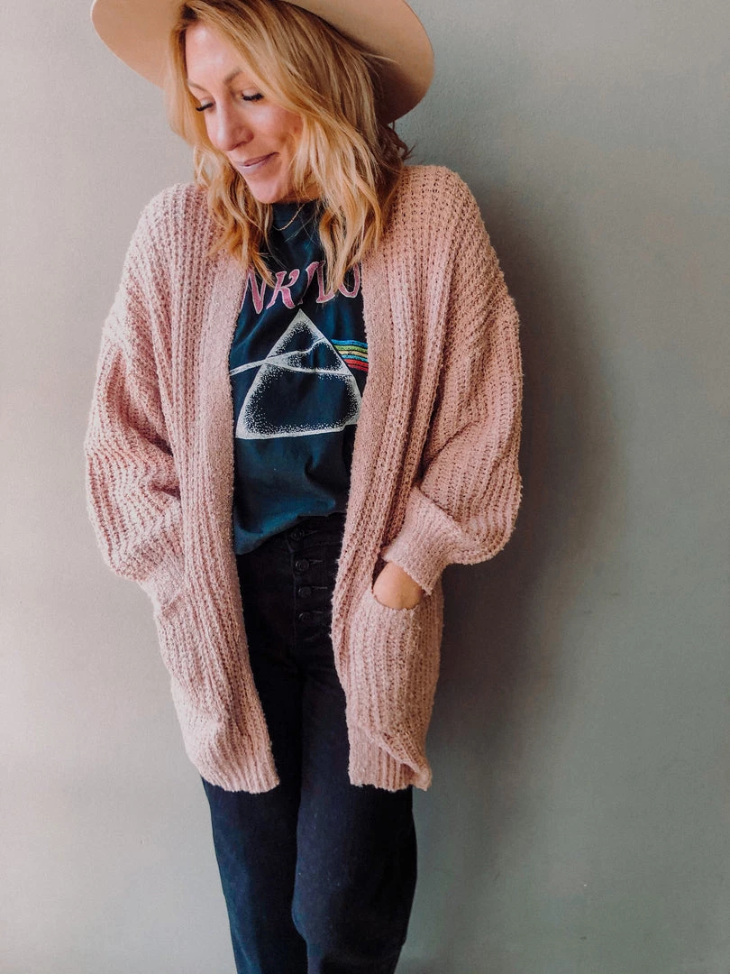 The Cammie Cardigan is a shop fav and immediate bestseller in a new colorway!!! This SUPER cozy cardigan is a chunky knit with deep side pockets and the prettiest blush tone. Love this paired with a basic white tee and denim or dresses up!!!