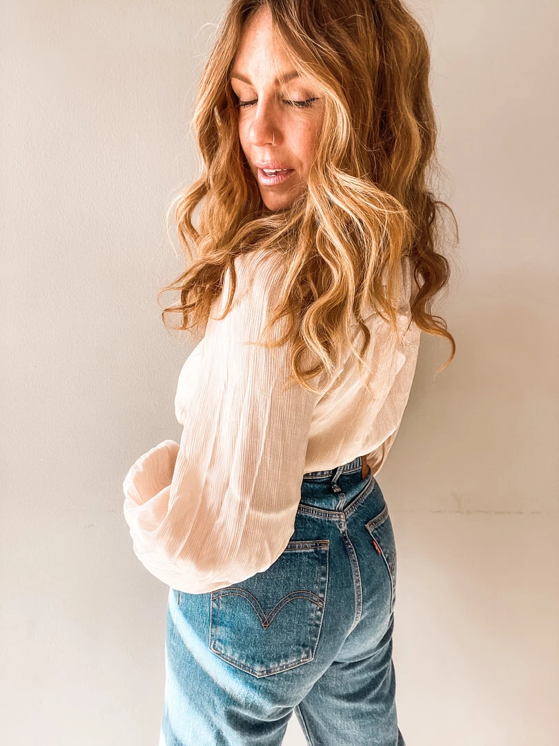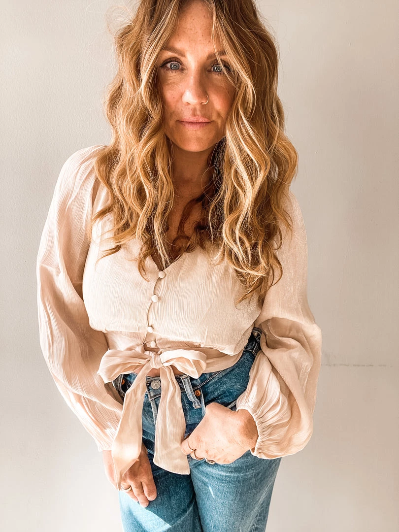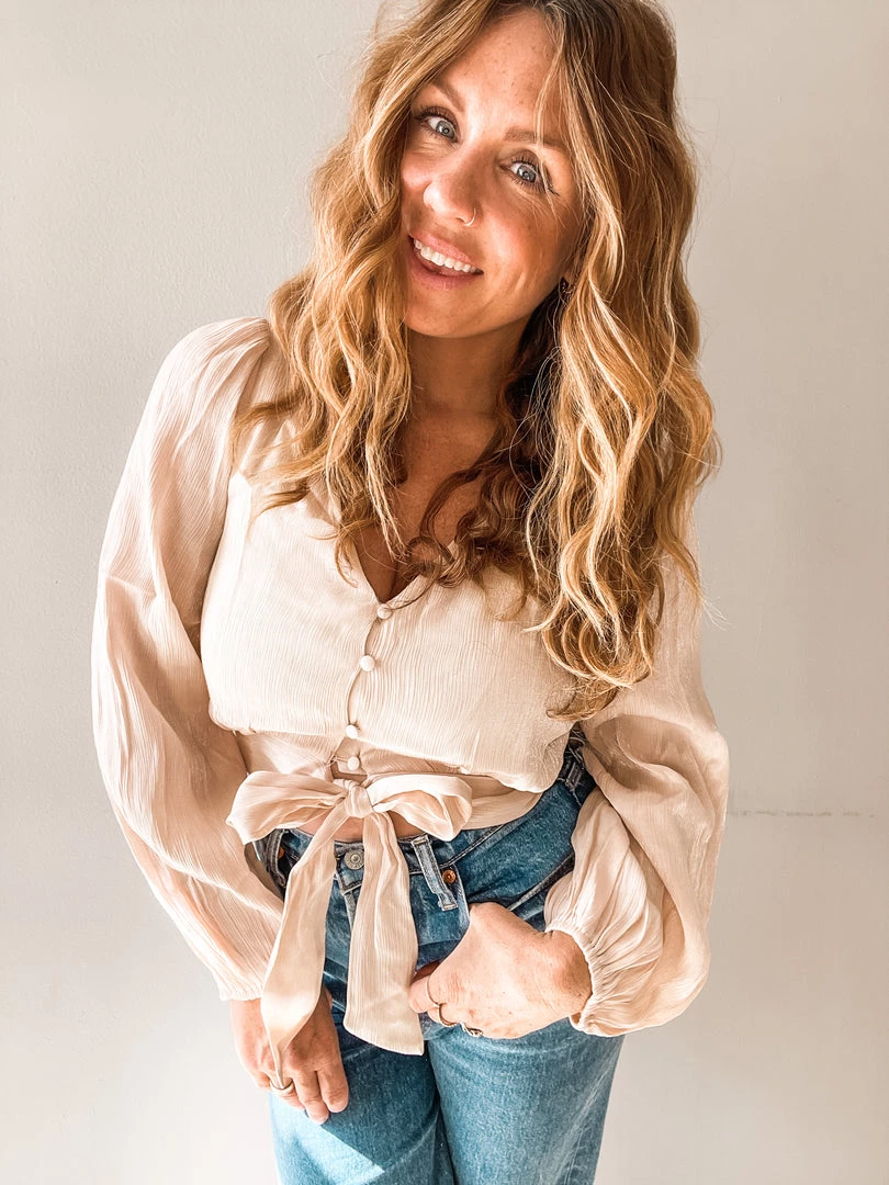 The Champagne Toast Button Up is a chic, slightly cropped button front blouse with a fun flowy sleeve that gathers at the wrist and a tie front (no elastic at the waist, a band). We love this blouse for day or night, fancy or casual outings. Looks so cute paired with high wasited denim, midi skirts, cutoffs, or under your favorite pair of overalls!