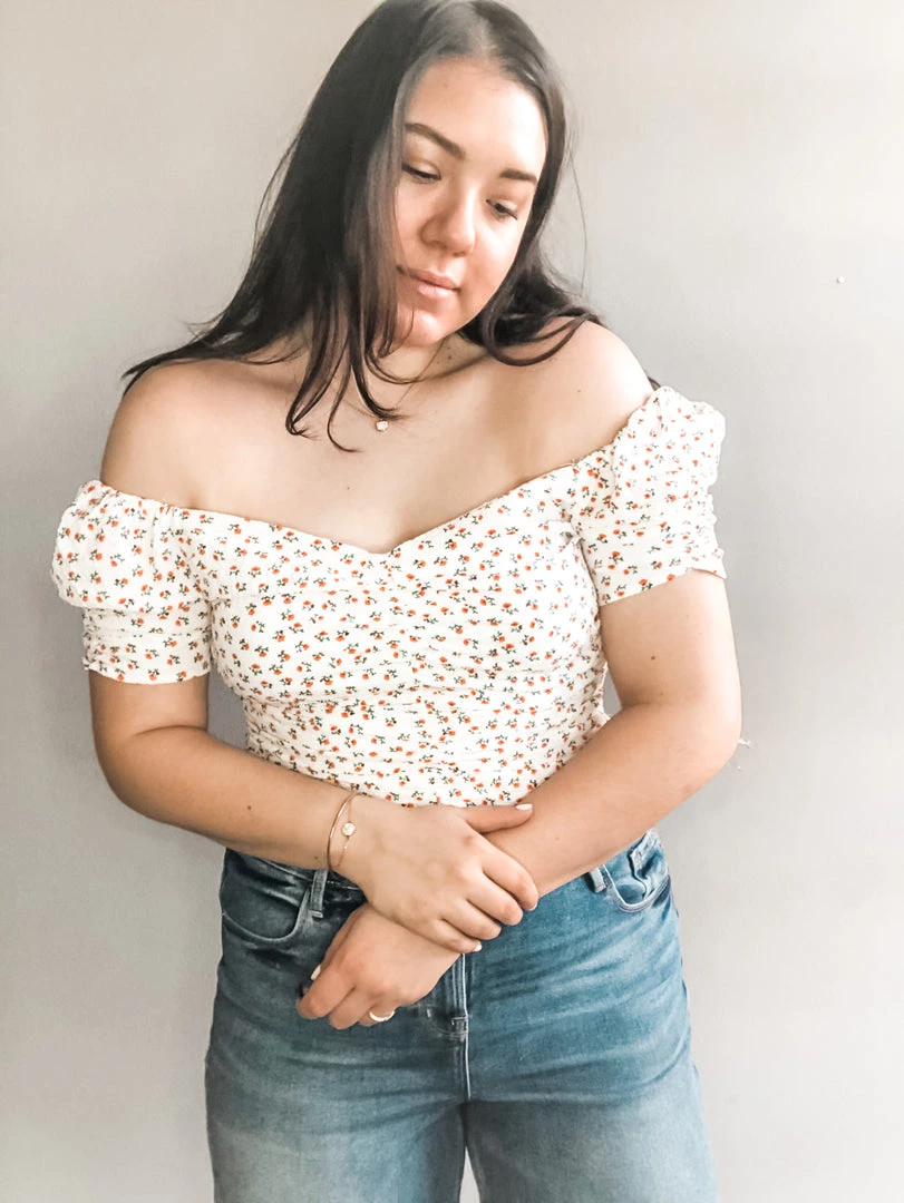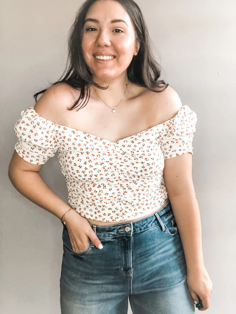 The Clementine Top is a SUPER flattering, stretchy little floral top with fun puff sleeve details that can be worn up or off the shoulder. We love the dainty floral pattern of this sweet little top (slightly cropped, perfect length for tucking into a high rise). Its a great fitted silhouette with a v neckline and rouching details for a very flattering fit .