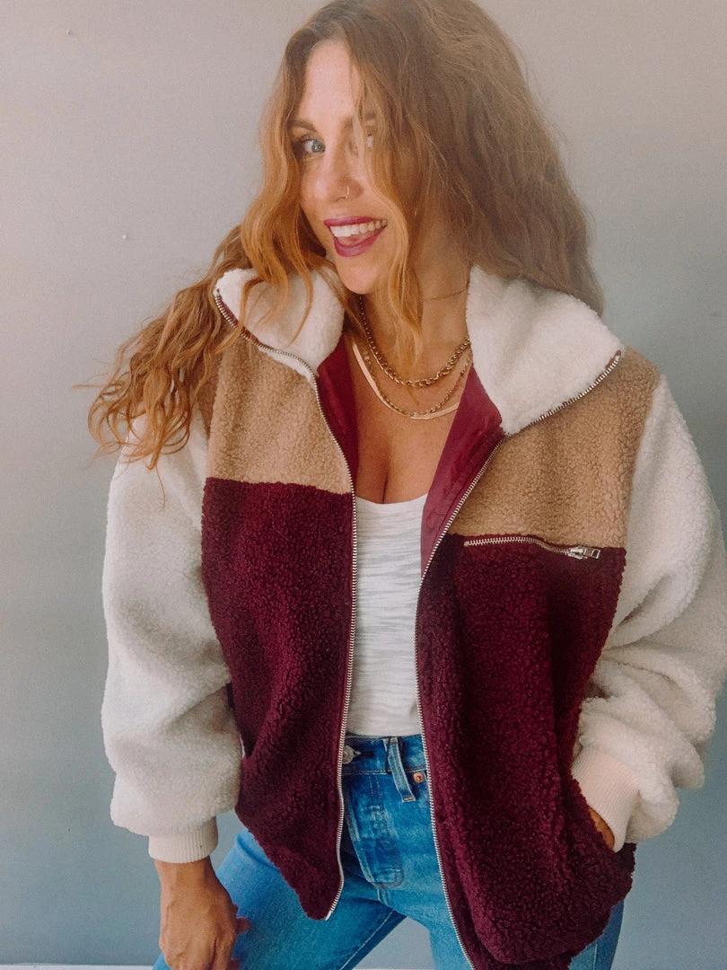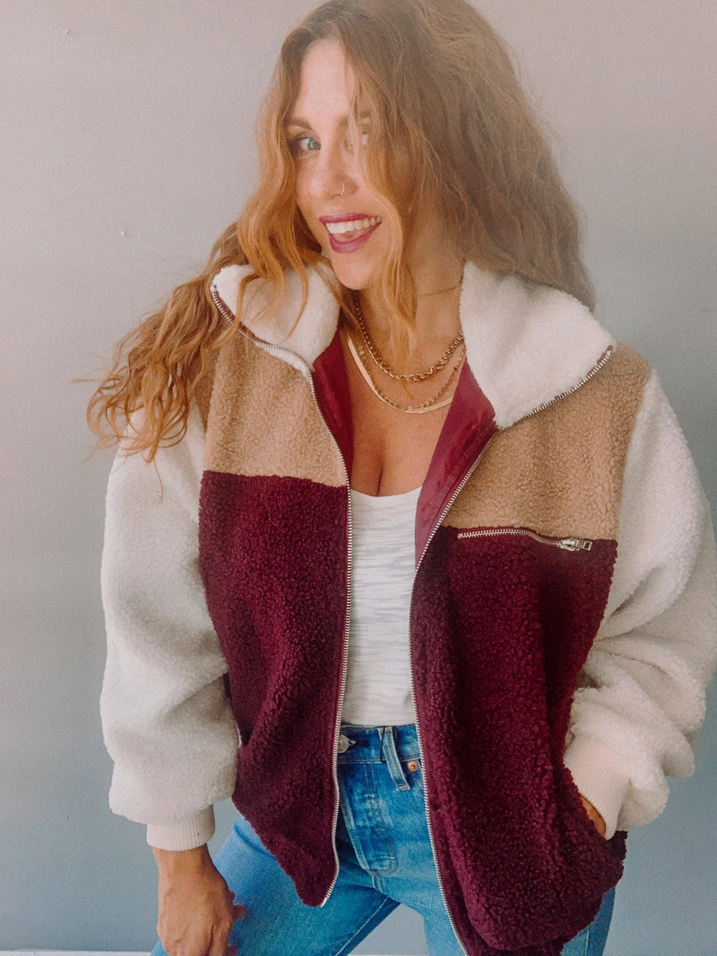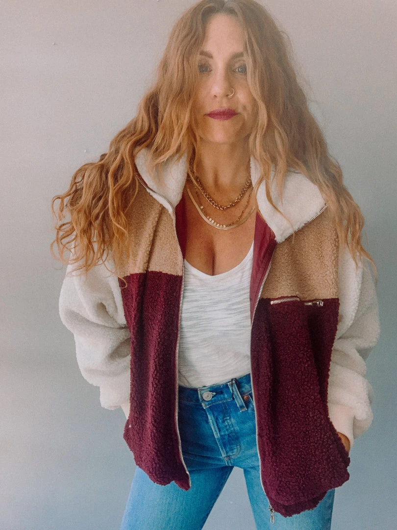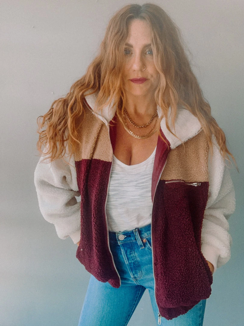The Colorblock Zip Up Jacket is a glorious mash up of some of our favorite vintage tones! We love this fuzzy teddy bomber style zip up with cozy pockets and a boxy, loose fit.
