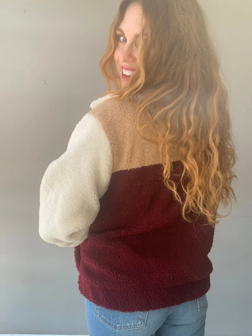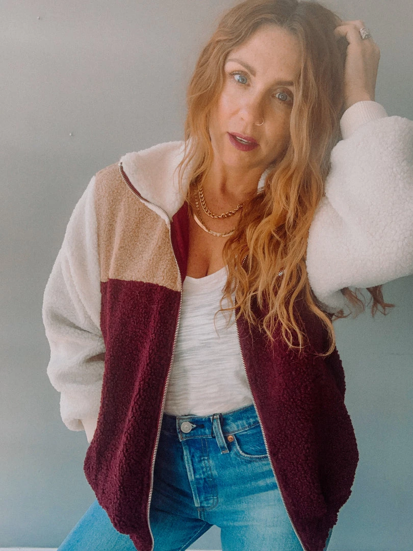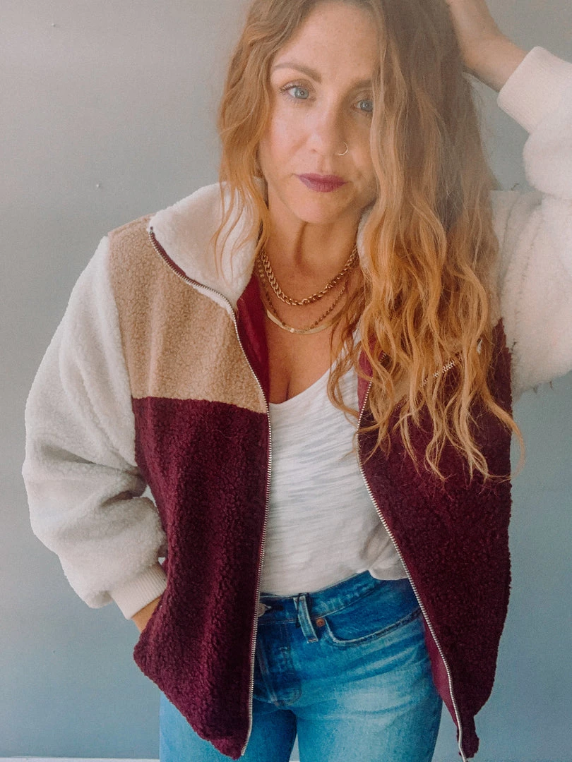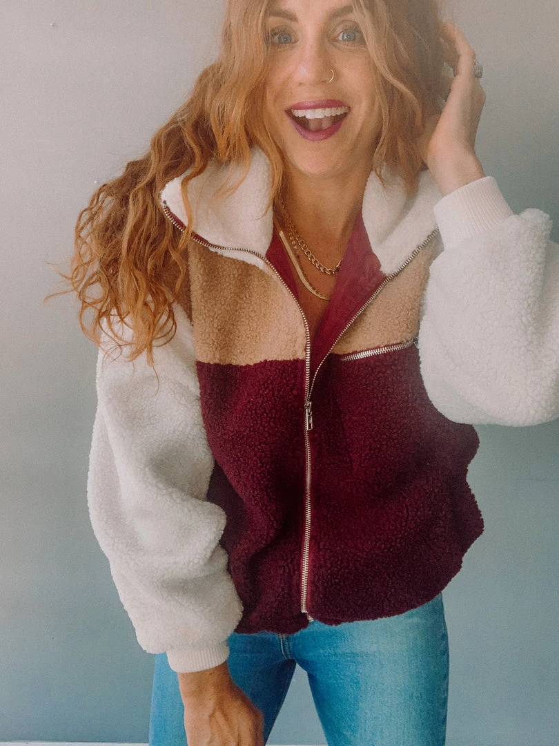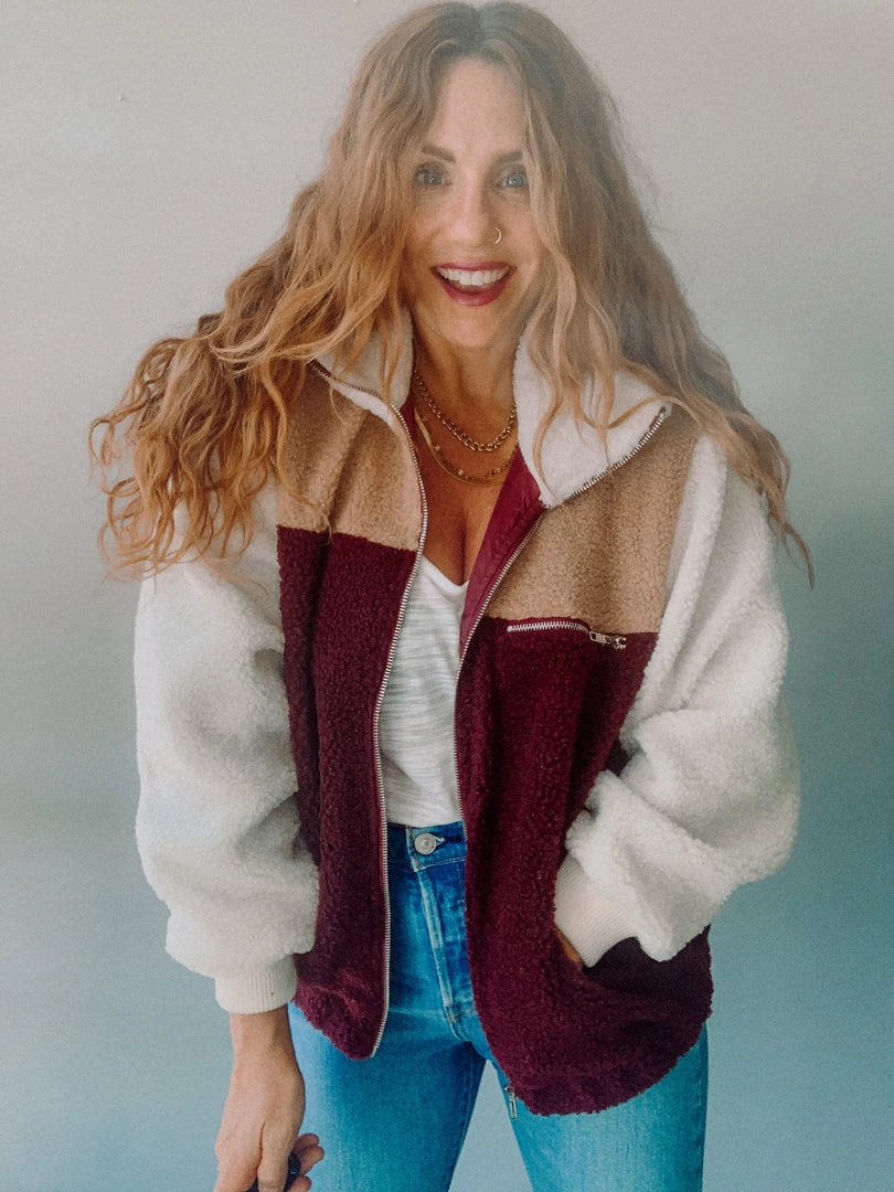 The Colorblock Zip Up Jacket is a glorious mash up of some of our favorite vintage tones! We love this fuzzy teddy bomber style zip up with cozy pockets and a boxy, loose fit.