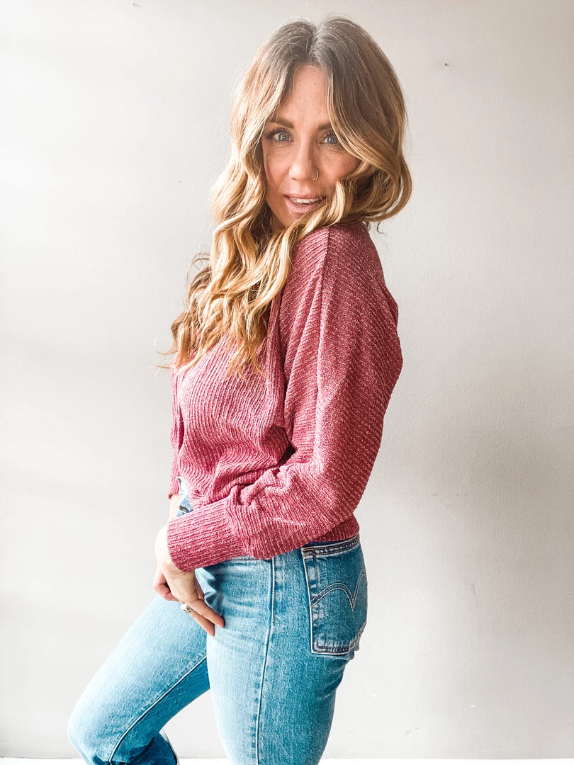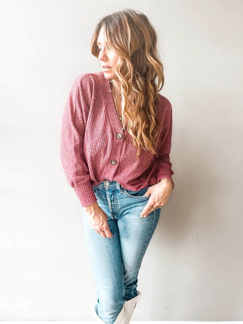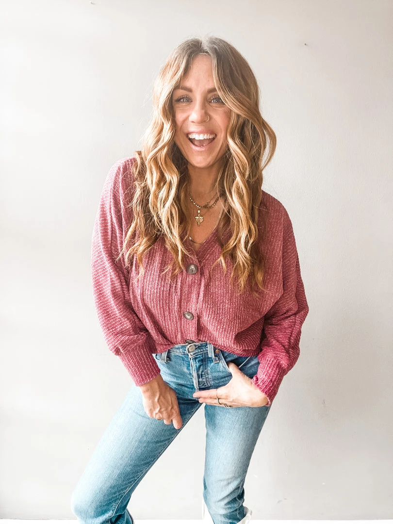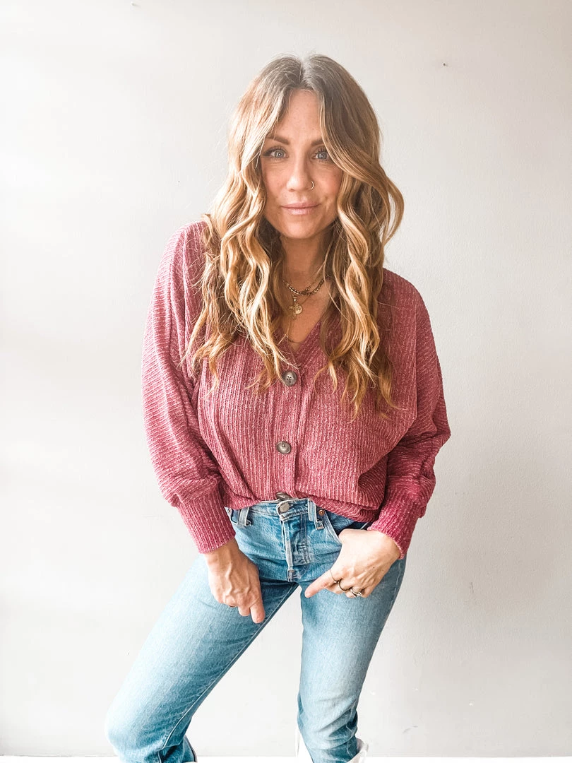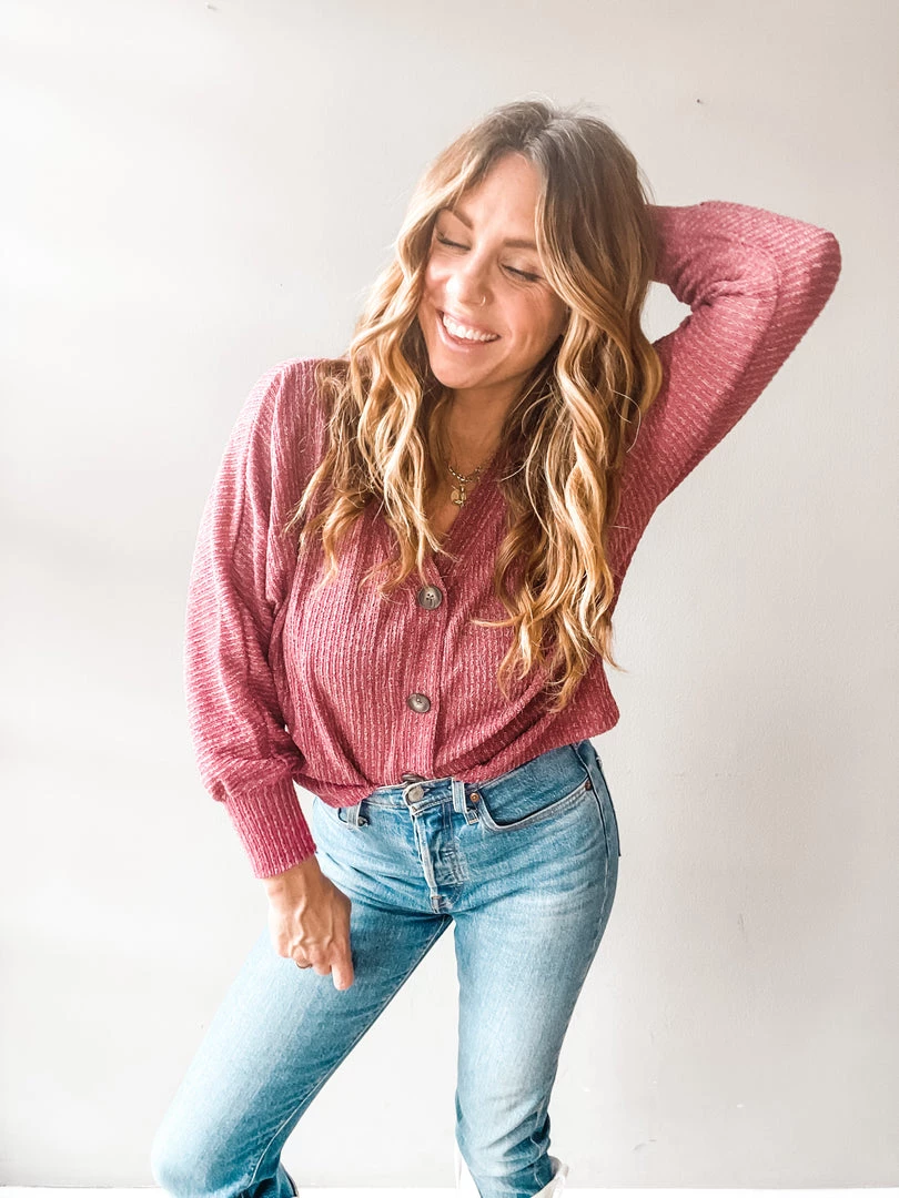 This bestseller is back!!!! Love the pretty berry tone of this super soft button front cardigan. A great oversized easy fit for layering tees and tanks underneath or wearing buttoned up and tucked in for a complete look!