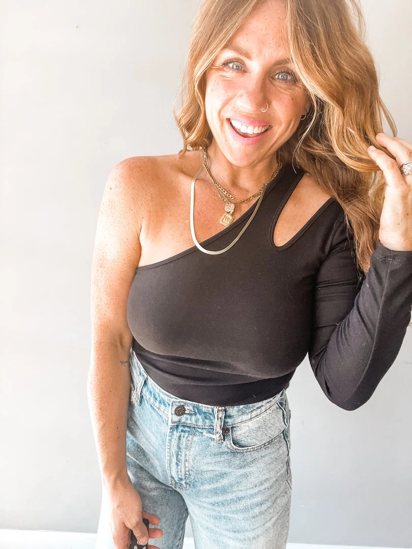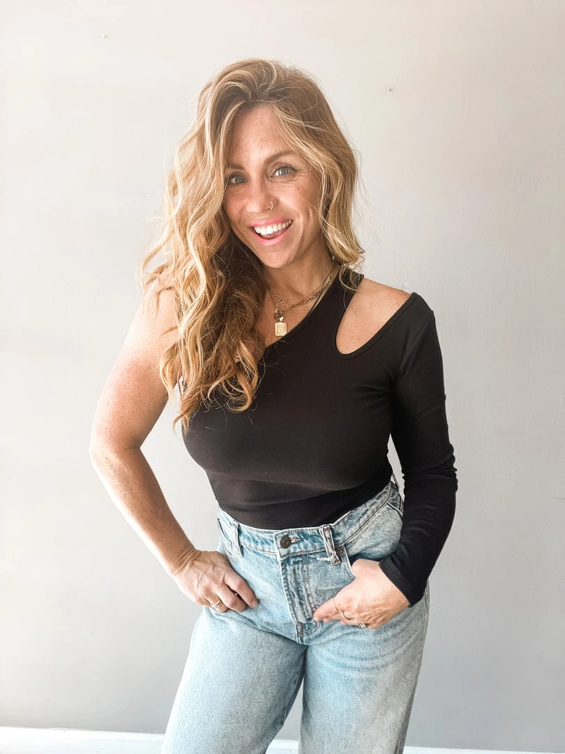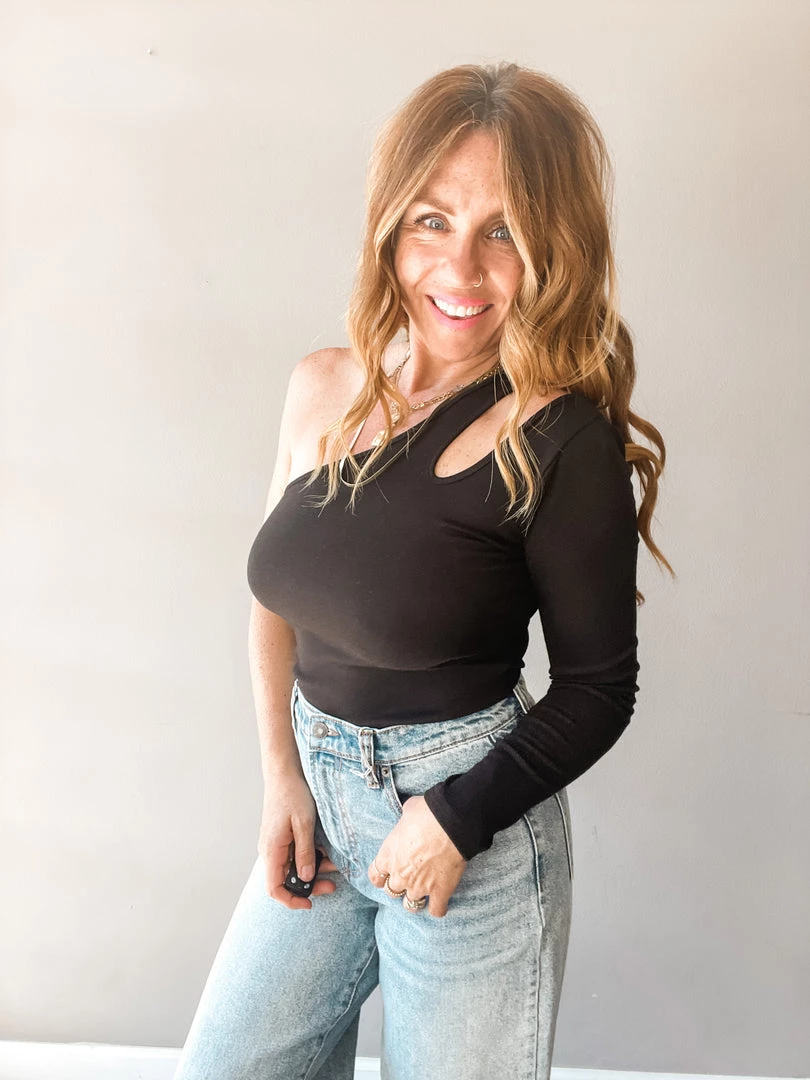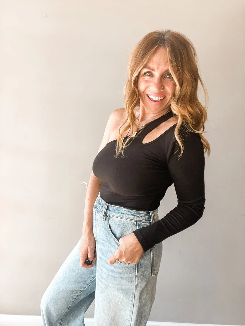 This sultry little top has us absolutely buzzing in the shop. It’s flirty in all the right places and looks and feels amazing on. A fitted long sleeve with asymmetrical cut and peak-a-boo cut out in the shoulder. This LBT…little black top…is cut slightly shorter in the hem and hits at the top of most high rise jeans. A yummy and lightweight fabric that feels like you’ve got nothing on. Perfect for a night out or a weekend away!
