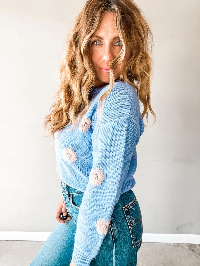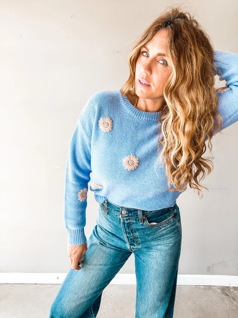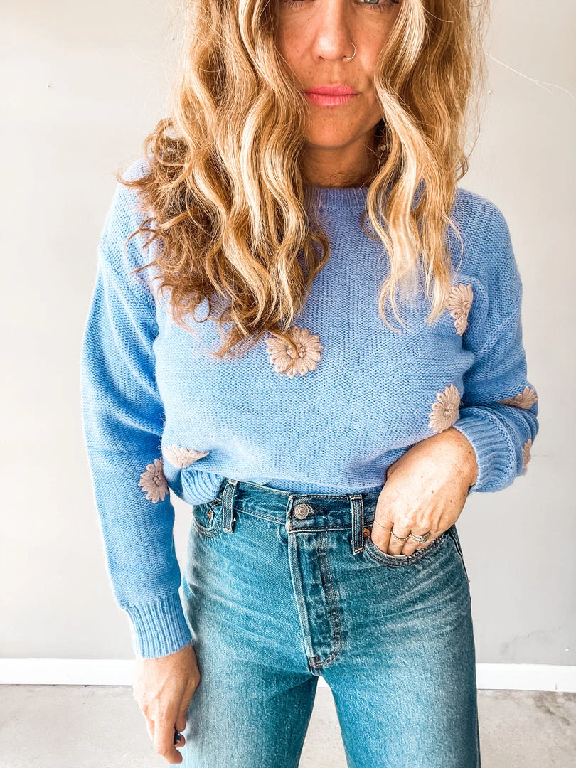 A beautiful new sweater that will surely sell fast!! The sweetest cornflower blue with delicate floral embroidered throughout the sweater. This long sleeve pullover is an easy staple to wear all season long. A classic crewneck sweater with ribbed neckline, hemline and wrists. Pair it with some simple gold chains, a pair of great denim jeans and booties for a sweet look we love.