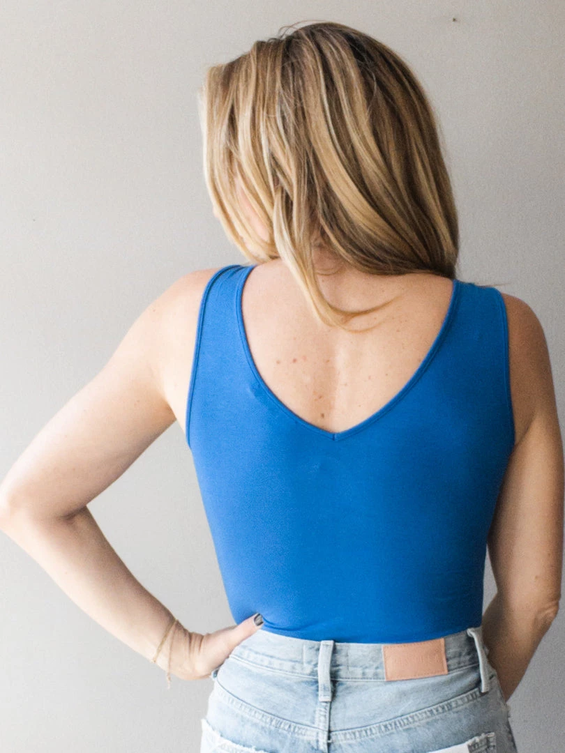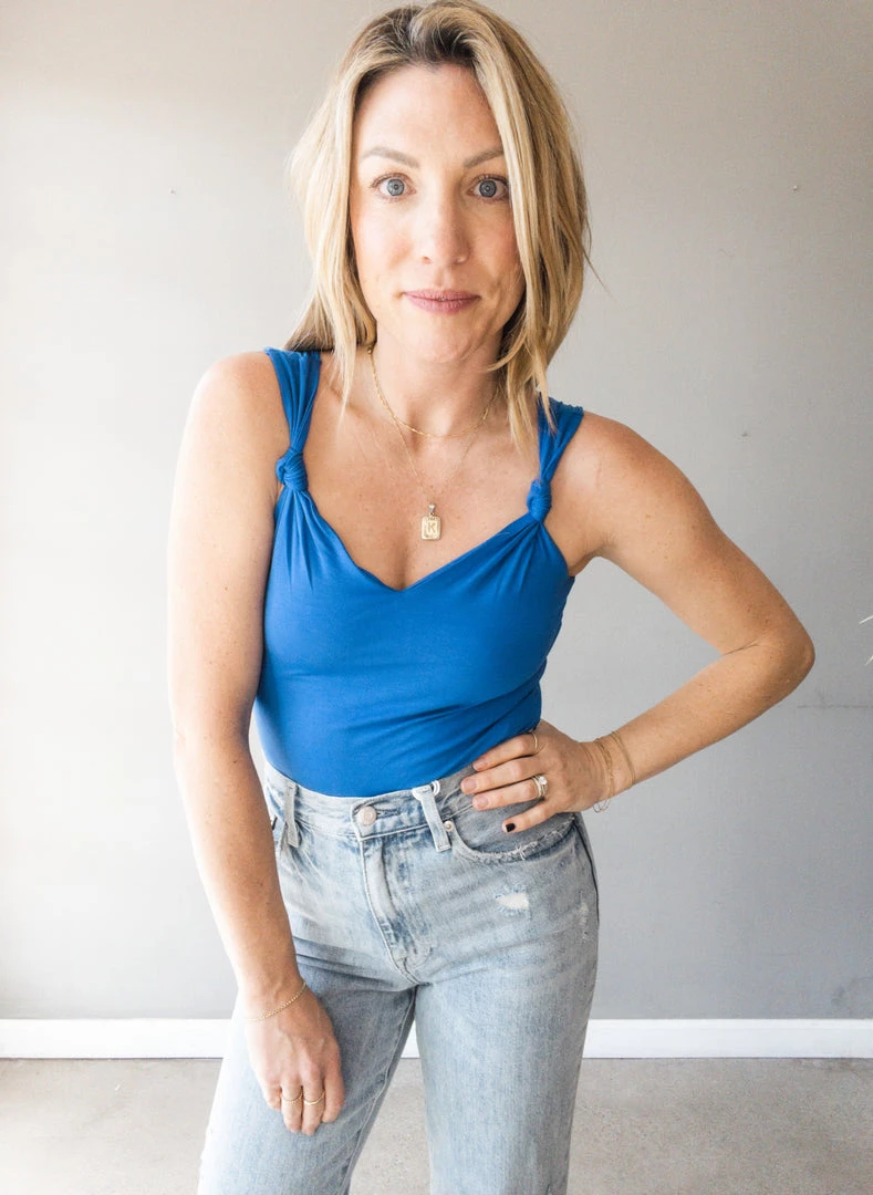 A royal blue bodysuit with v neck and knotted strap detail. This bodysuit is a fun twist on a basic tank. Pair with jeans or a midi skirt to complete the look. Thong cut with button snap closure.