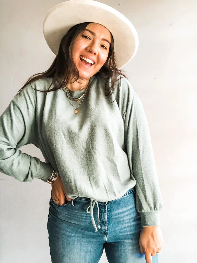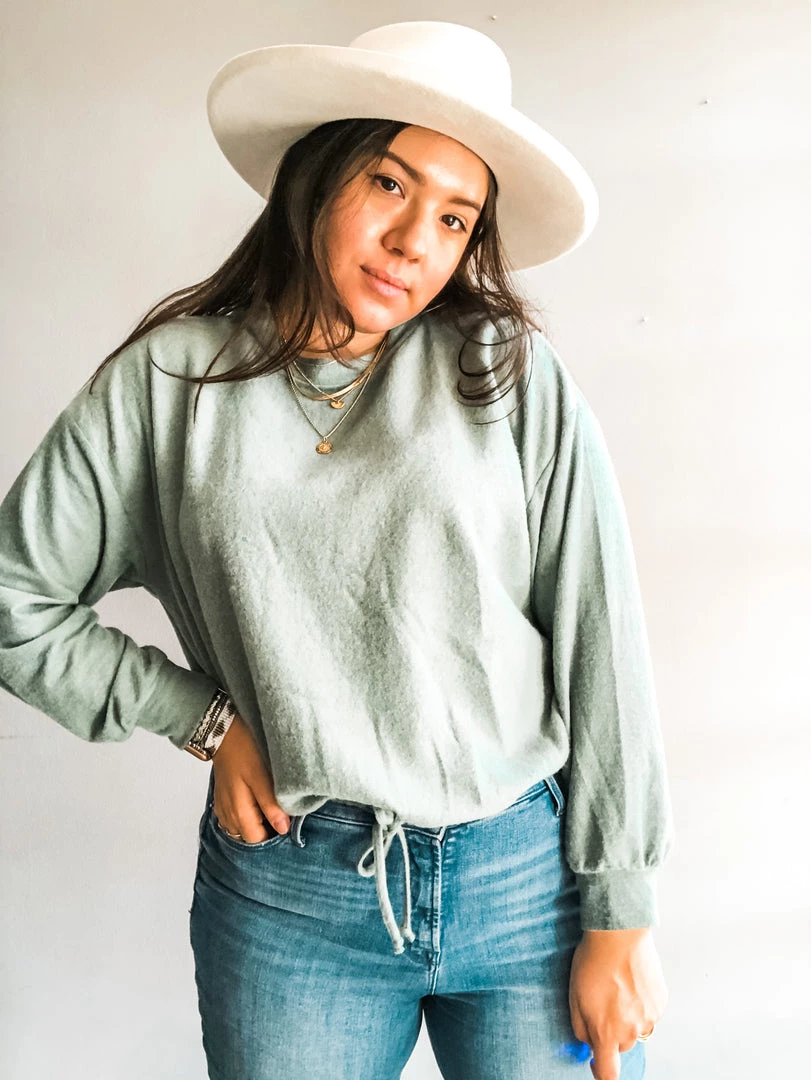 This sweatshirt couldn’t be any softer!! A perfect-for-Fall fleece that you’ll love to live in and live to lounge in. A loose body that hits slightly cropped with an elasticated waistband and adjustable front tie. Wear it alone with high waisted Levi’s and a hat or make it a matching set with the equally comfy Double Back Sweatpants.