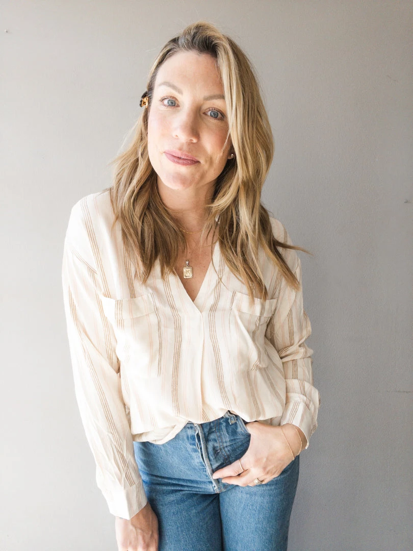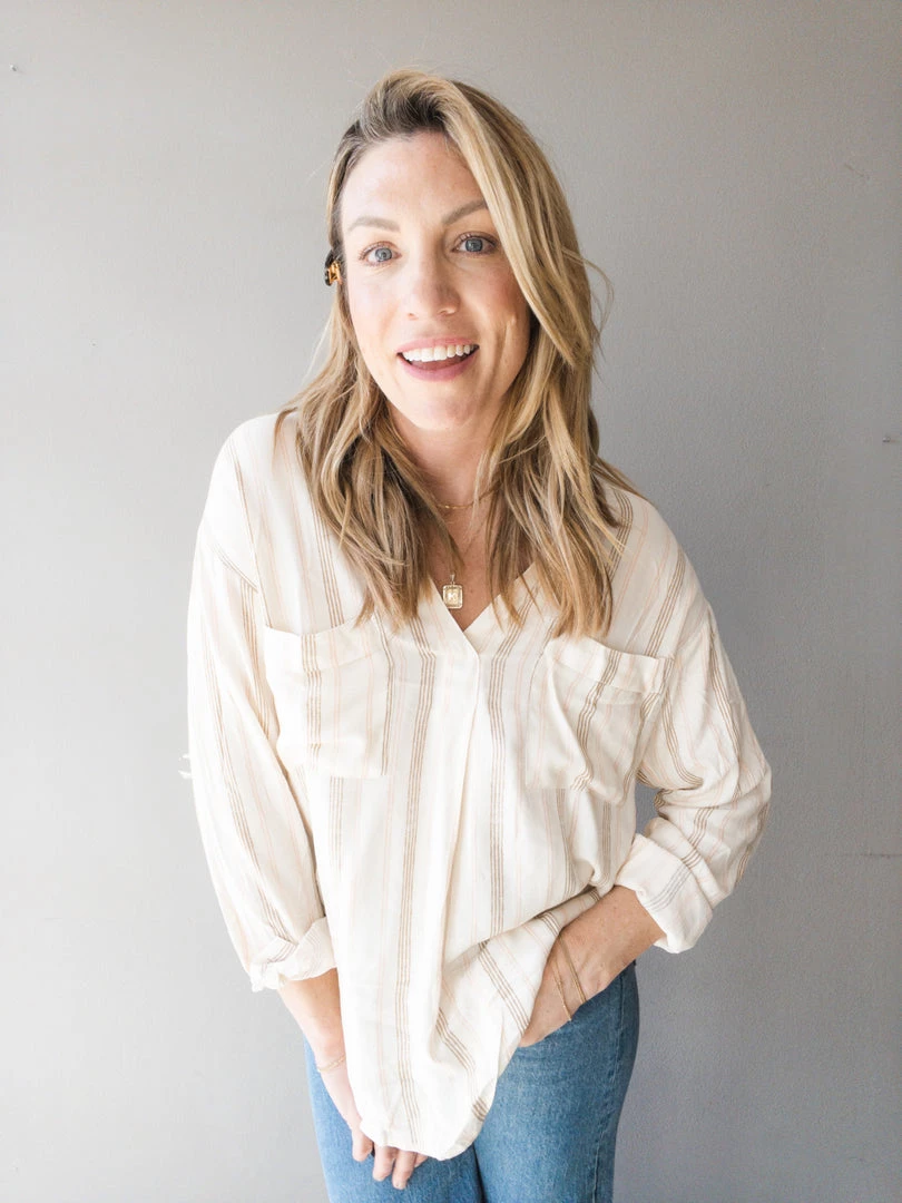 The perfect year round blouse for any girl, whether she is taken to the office or for every day wear. A long sleeve pull on top with button closure at the wrist, collared v neck and two front chest pockets. A cream silhouette with mauve and tan vertical stripes, these earthy tones are easy to pair with any outfit.