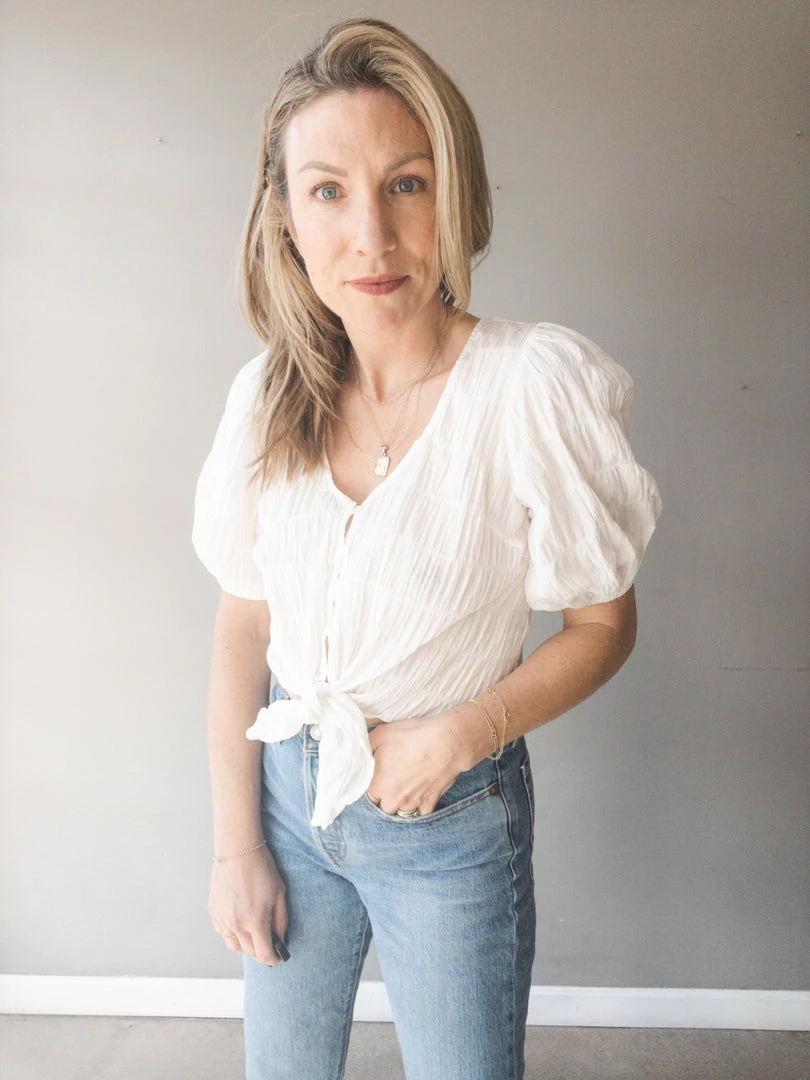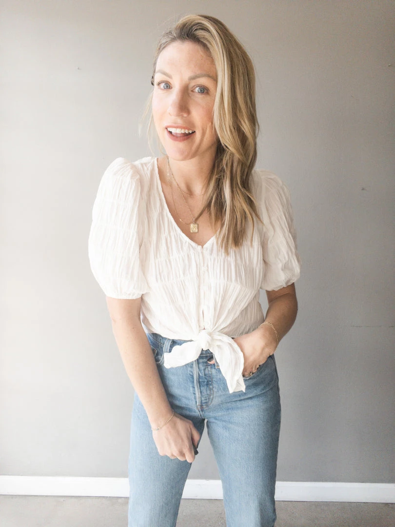 All is fine and dandy with this cute spring-ready button front blouse. With smocking throughout, balloon sleeves, a vneck, button front with center tie closure. Slightly cropped and perfect with your high waisted denim, this blouse is an easy piece to wear on the daily or to dress up with a skirt. Light weight and super feminine, a sweet add to any wardrobe.