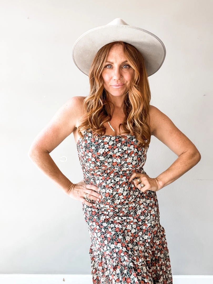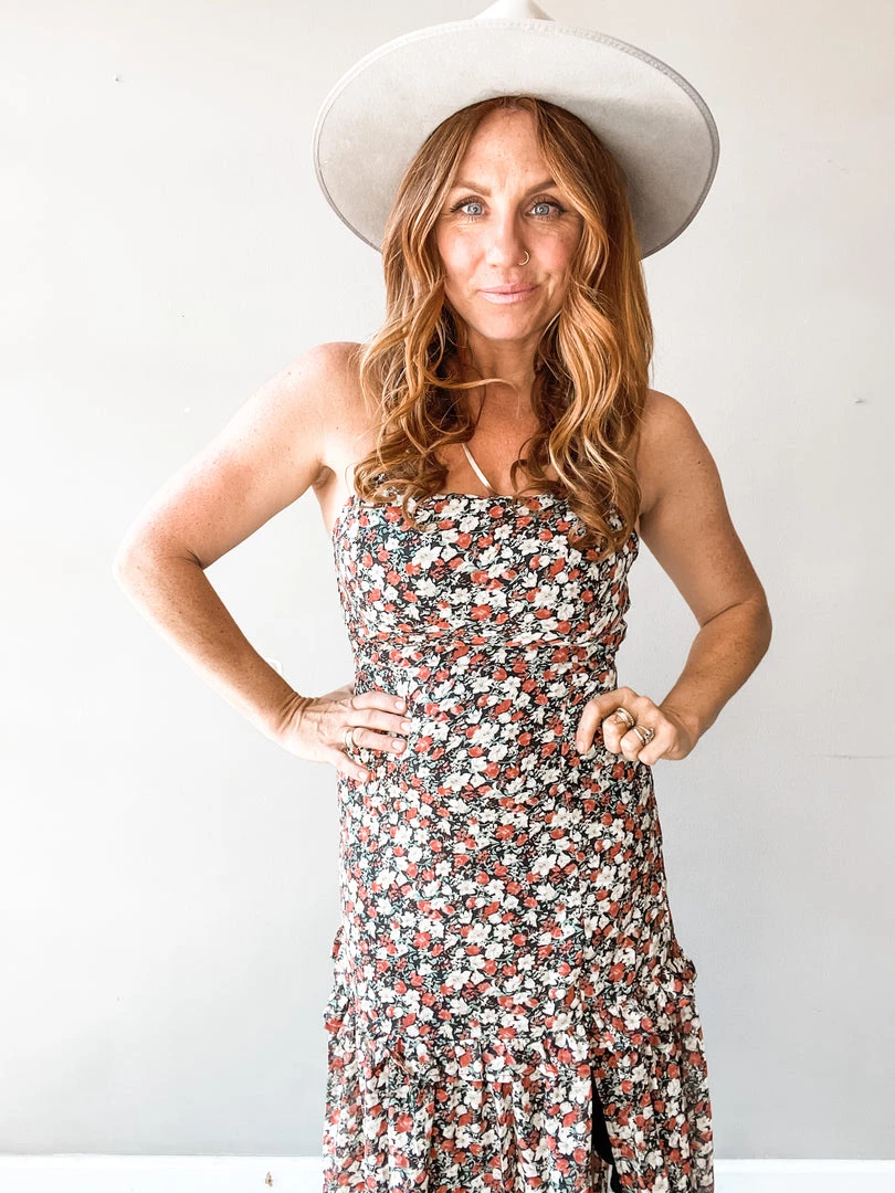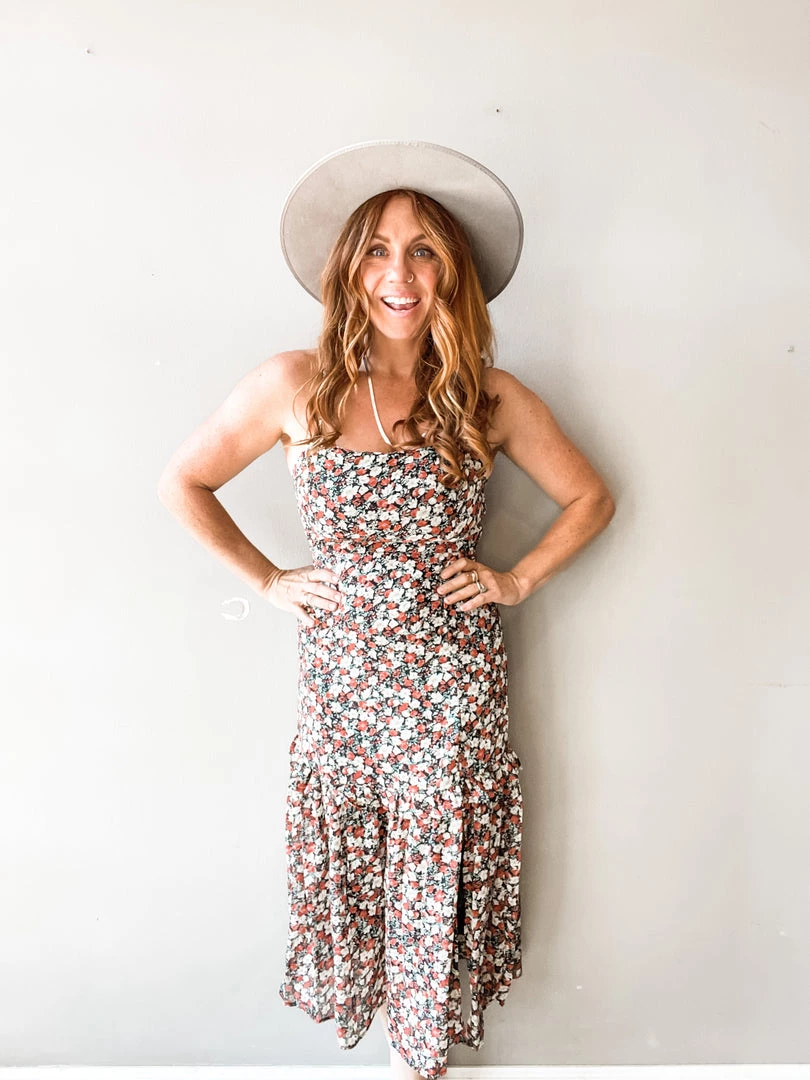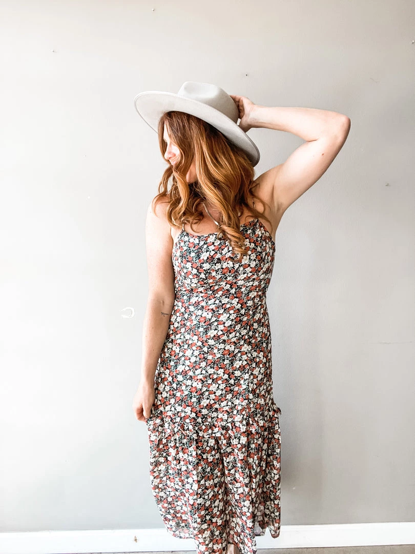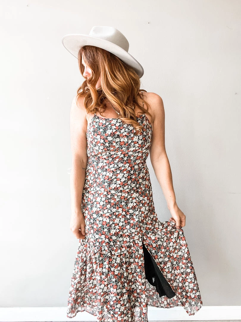 This floral midi dress has an adjustable strappy open back, adjustable shoulder straps, and a hidden zipper to get you the perfect fit. It’s lined and has a ruffle skirt detail with a slit up to the mid-thigh. We love it and will be wearing all spring and summer long.