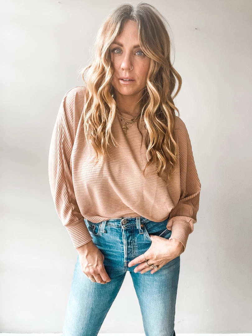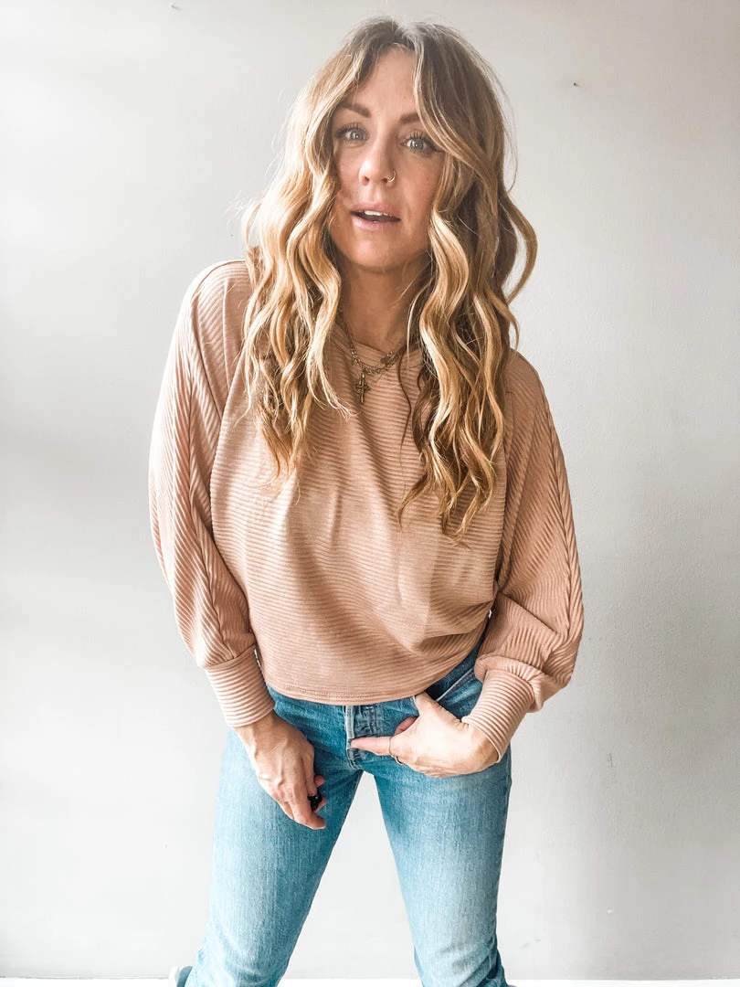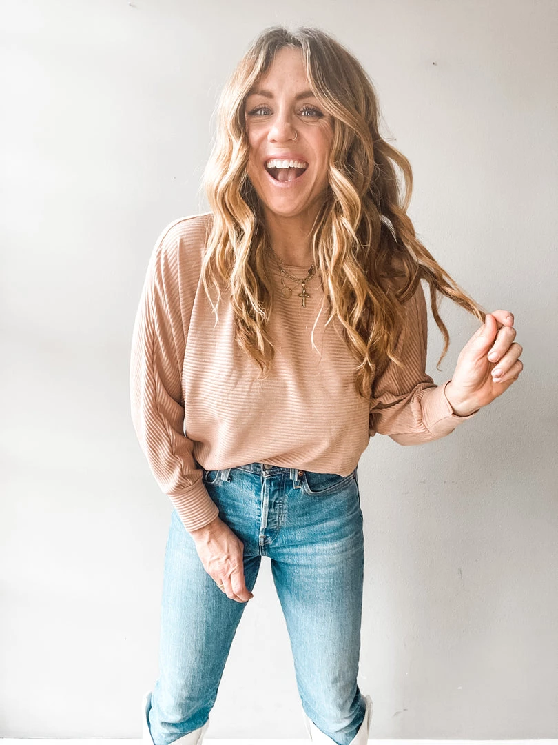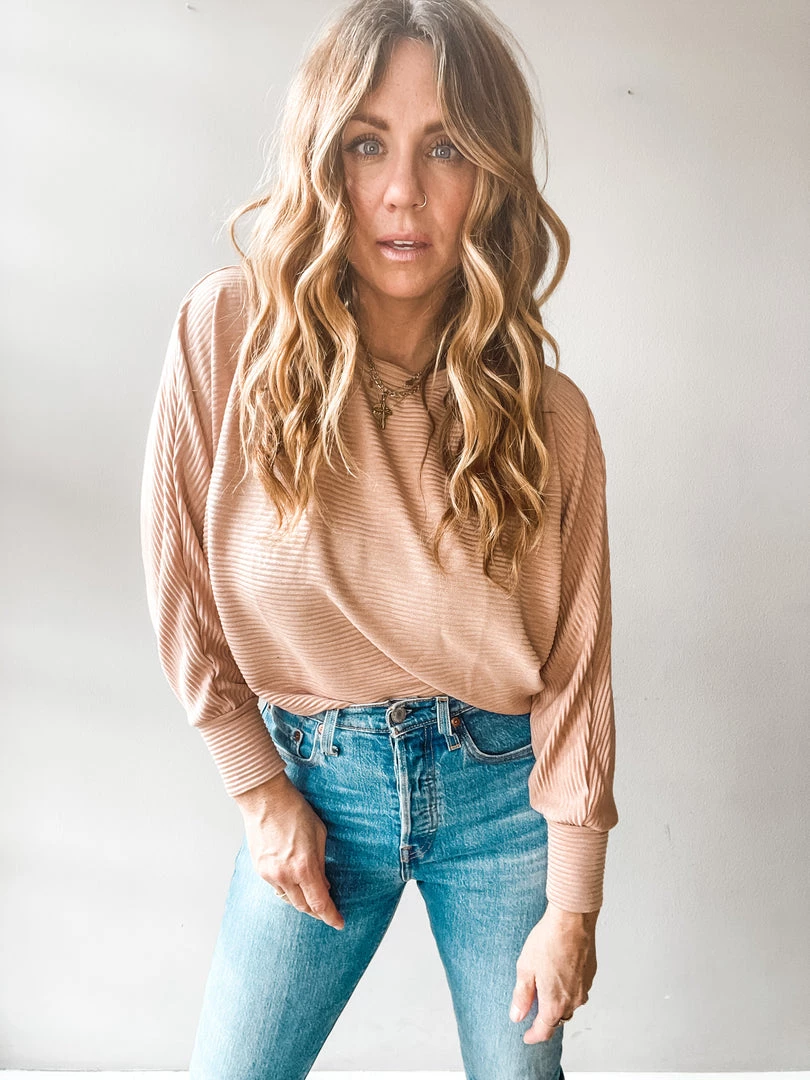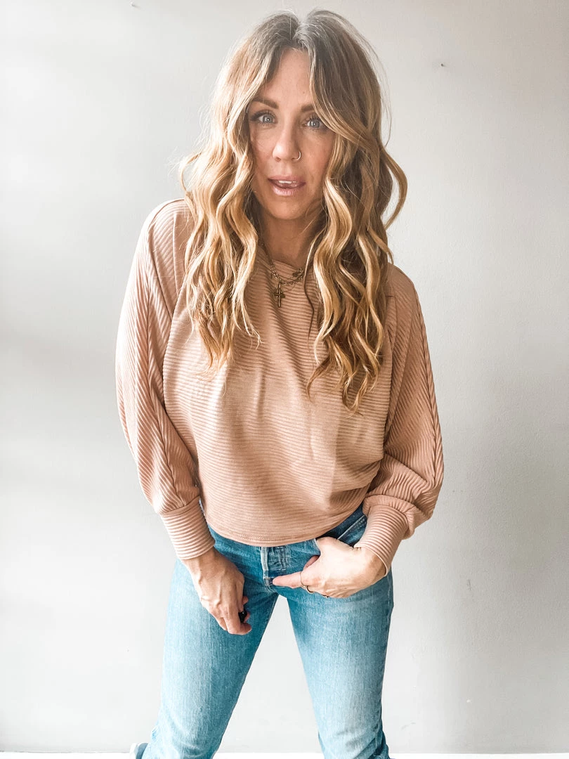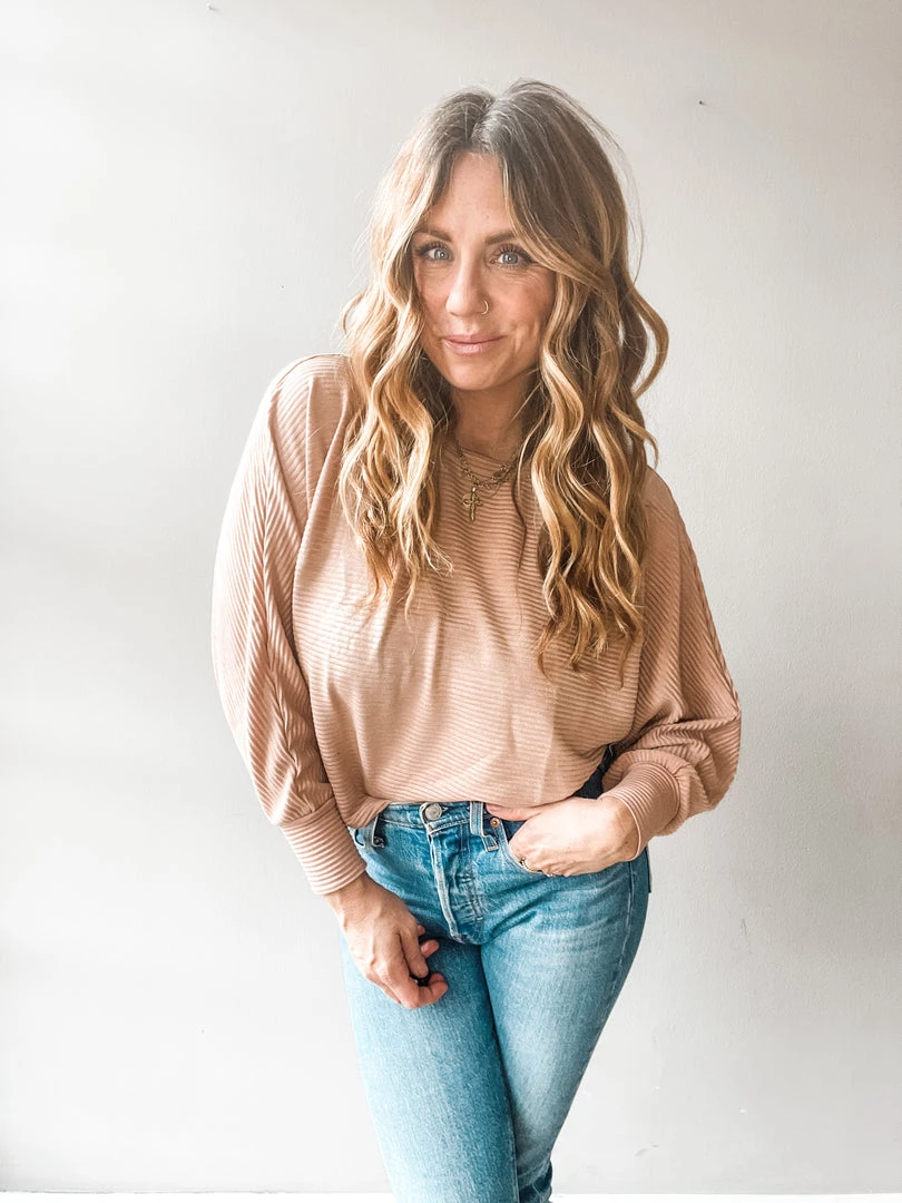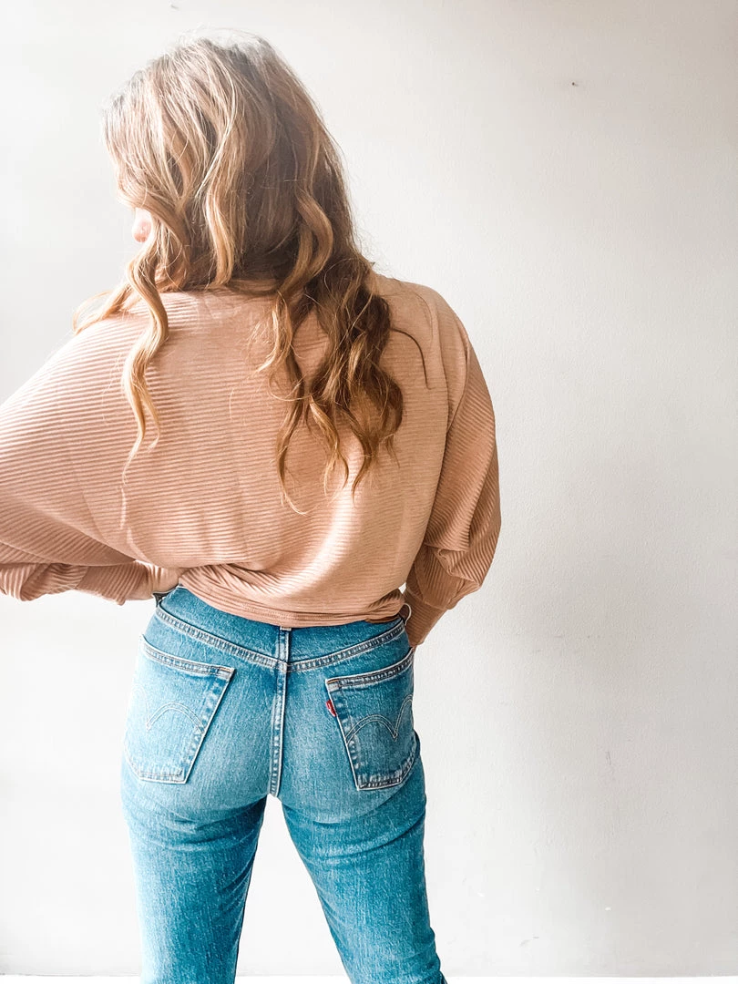 The Gingerbread Sweater is a sweet little sweater top that has loose and flowy arms with a mildly cropped fit. A great option for high waisted denim that is easy and effortless any time of year!