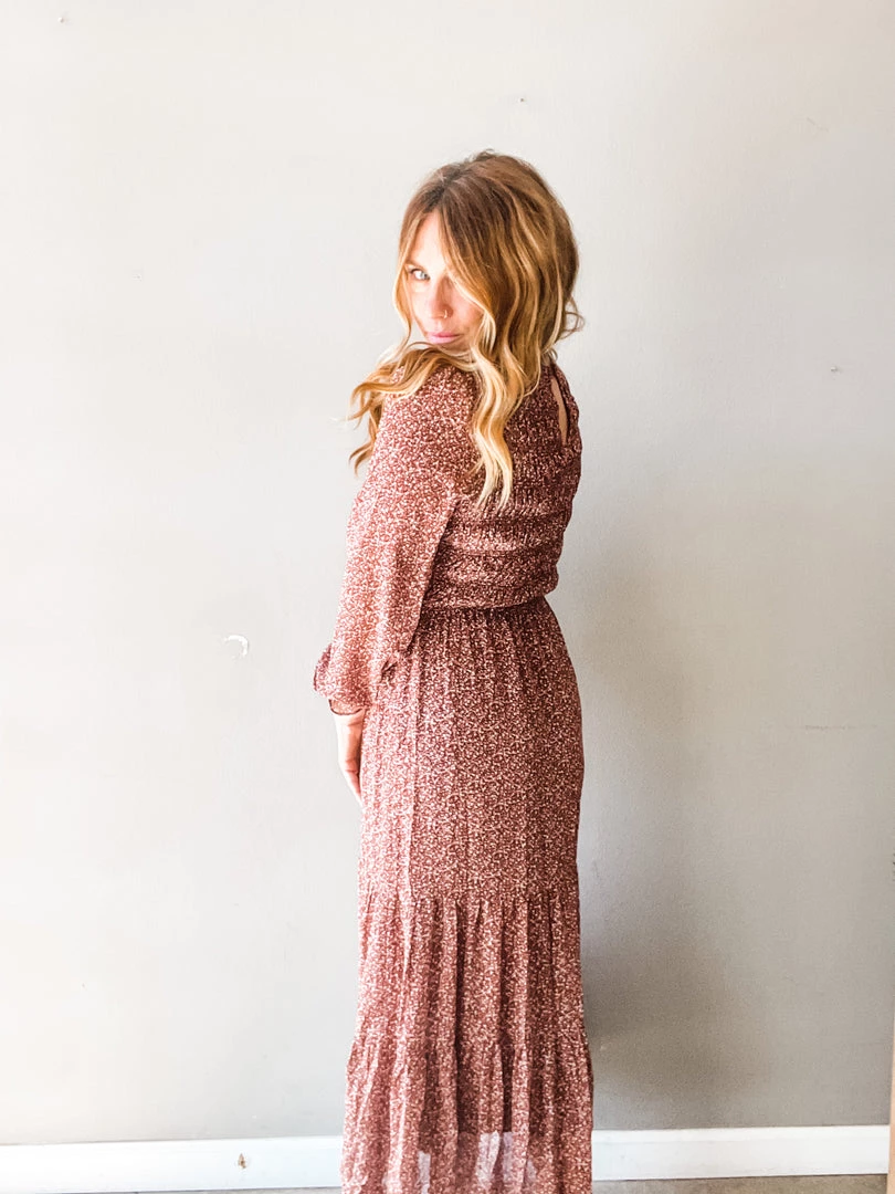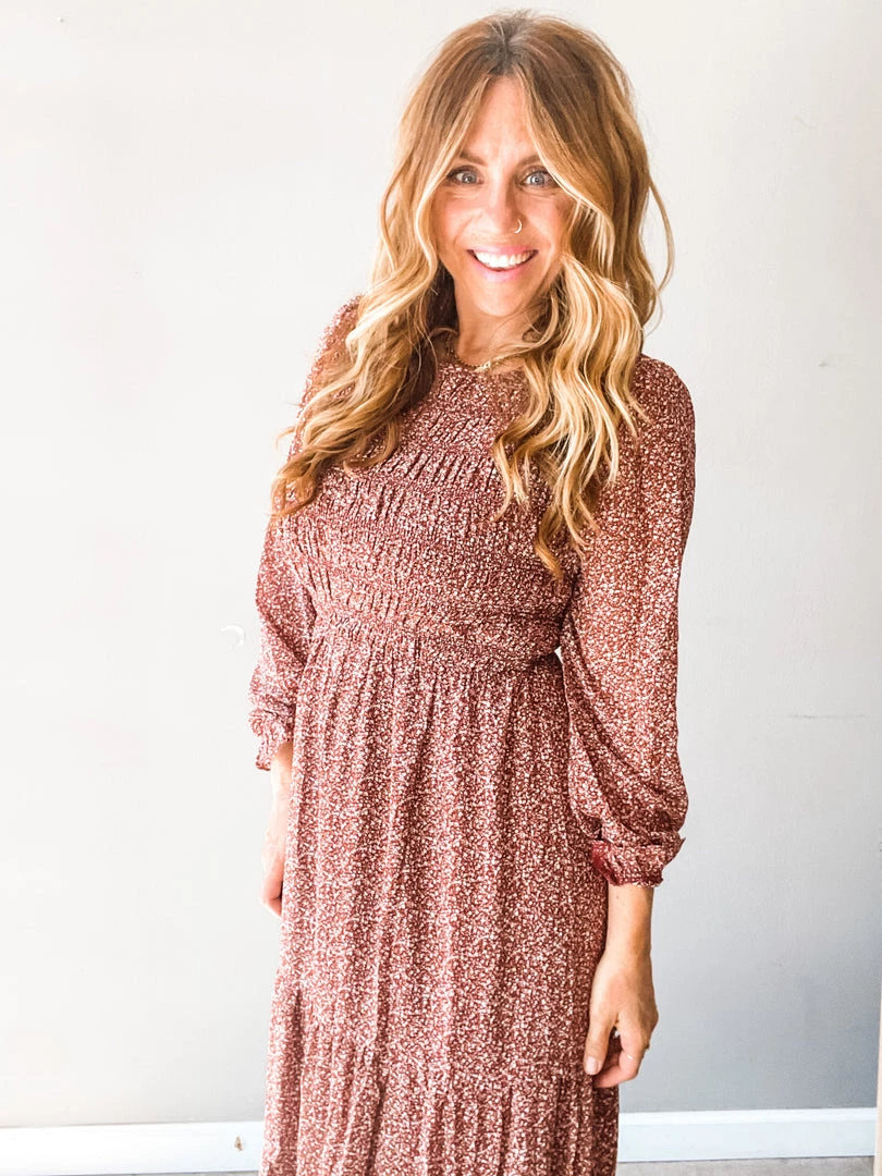 A perfect burgundy number that is the type of transitional piece you absolutely need in your closet. A flowy silhouette with a slightly fitted body. This tiered midi dress features blousy sleeves with shirred bust and back. The type of dress that looks like you spent forever getting ready but actually just threw on…..in other words our kind of piece. Keyhole details at back of neck with double lined body.
