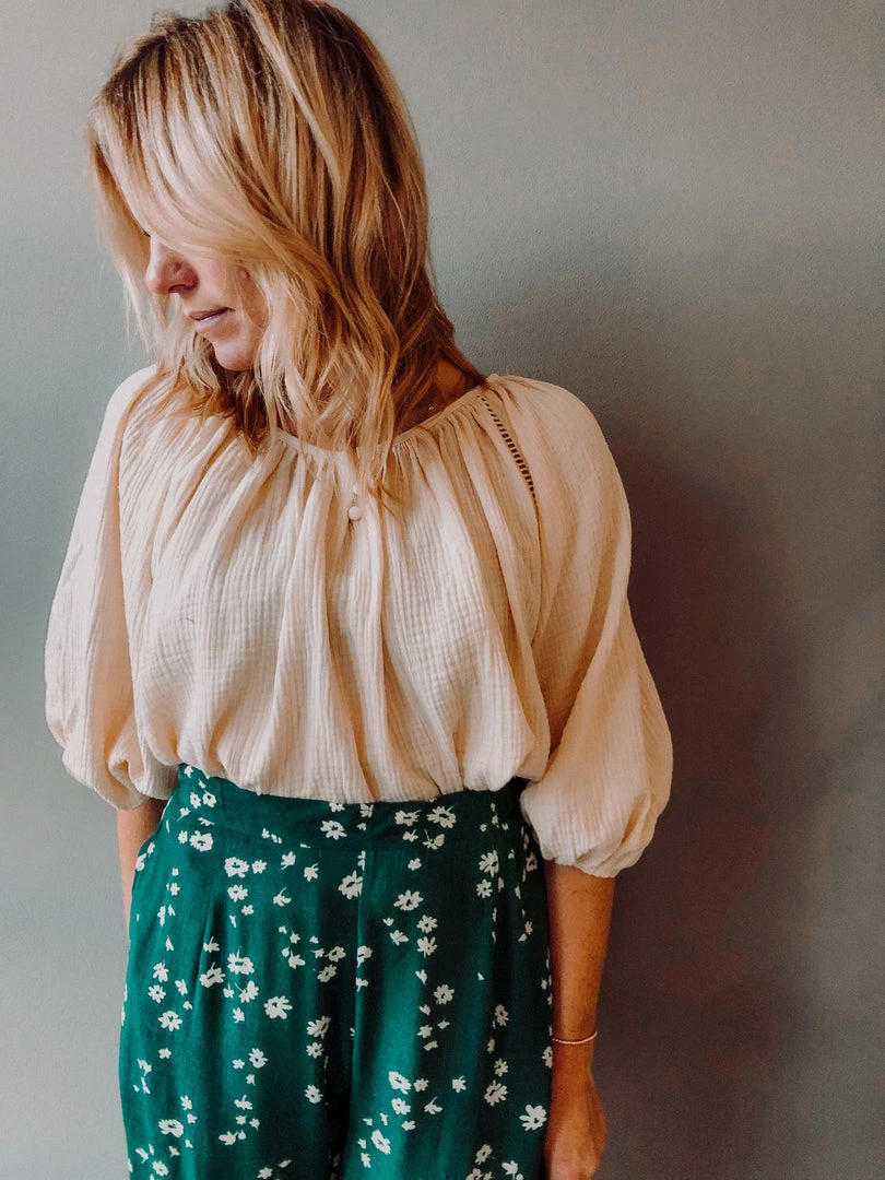 The Gypsy Soul Top is a gauzy, lightweight, flouncy blouse with balloon sleeves and a high button up neckline. We love this bohemian inspired piece tucked in with denim, cutoffs or a fun pant like our Ditsy Itsy Pant (pictured). A great transition top for spring and summer!!!