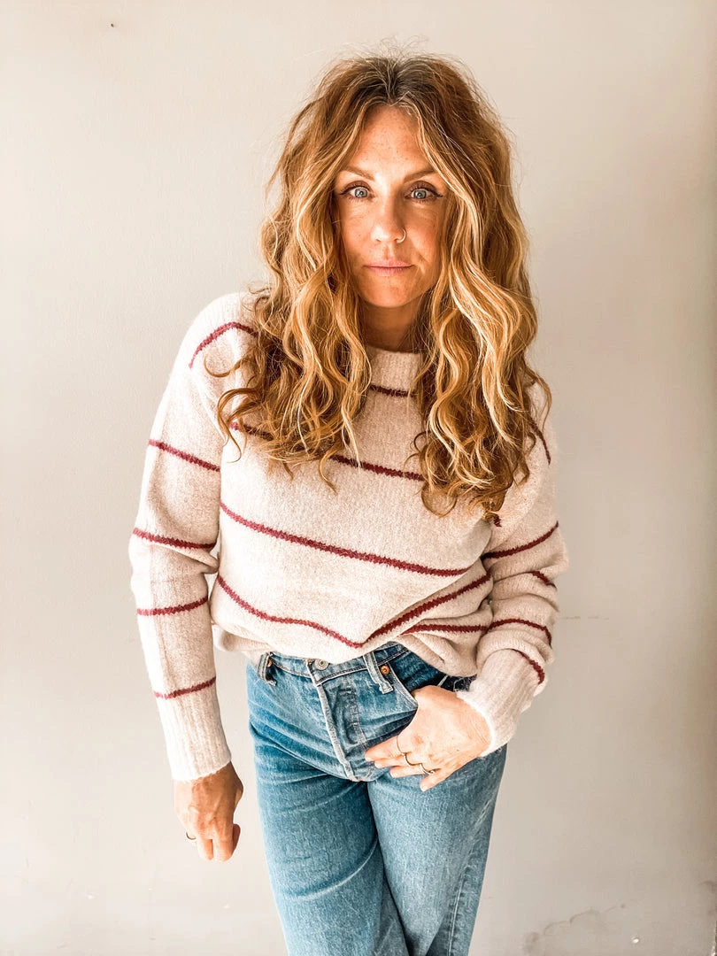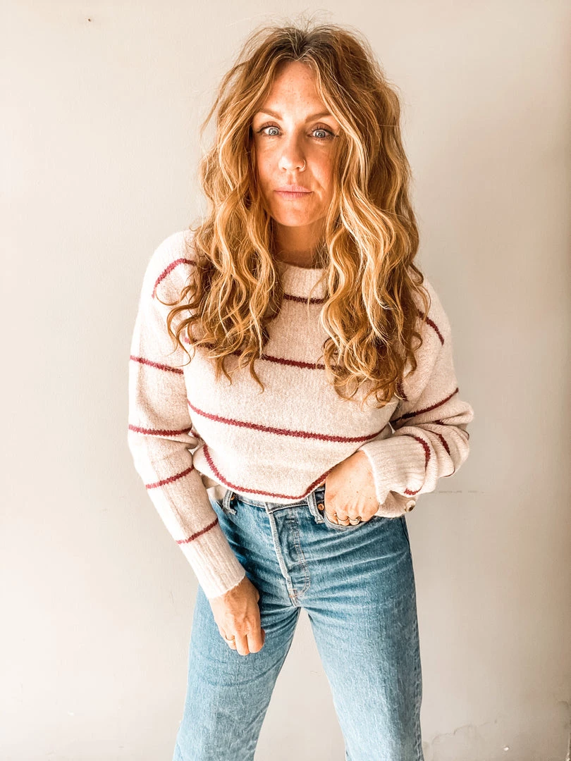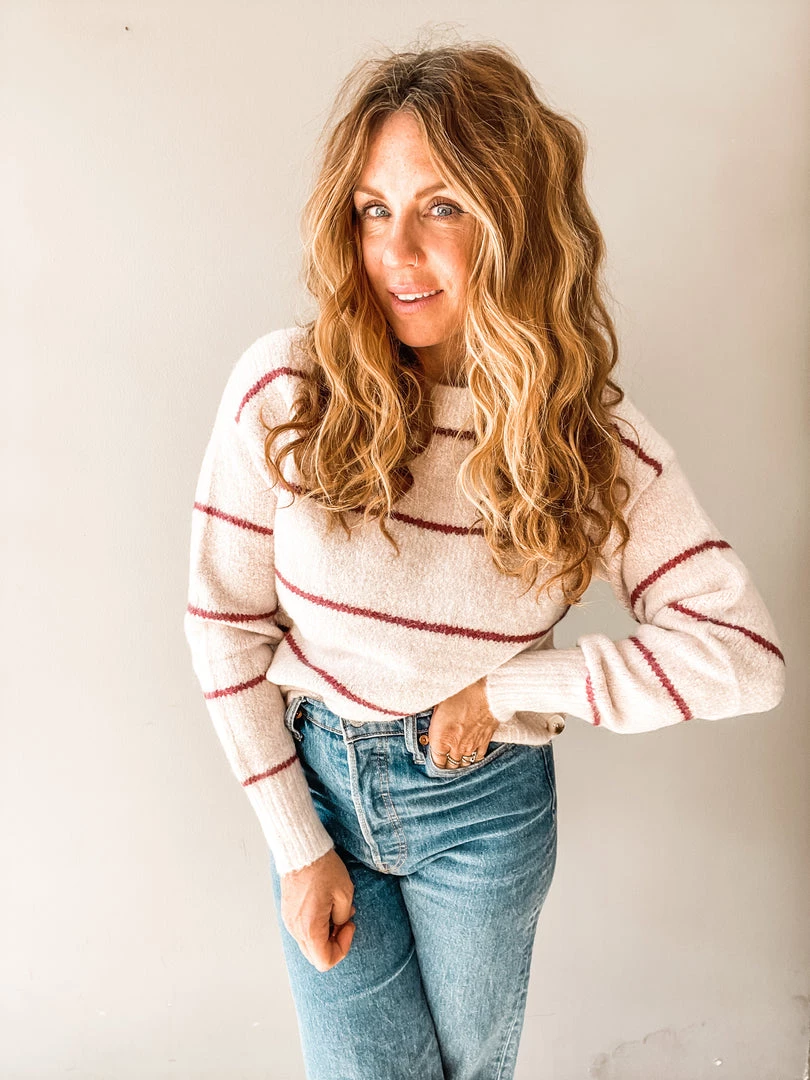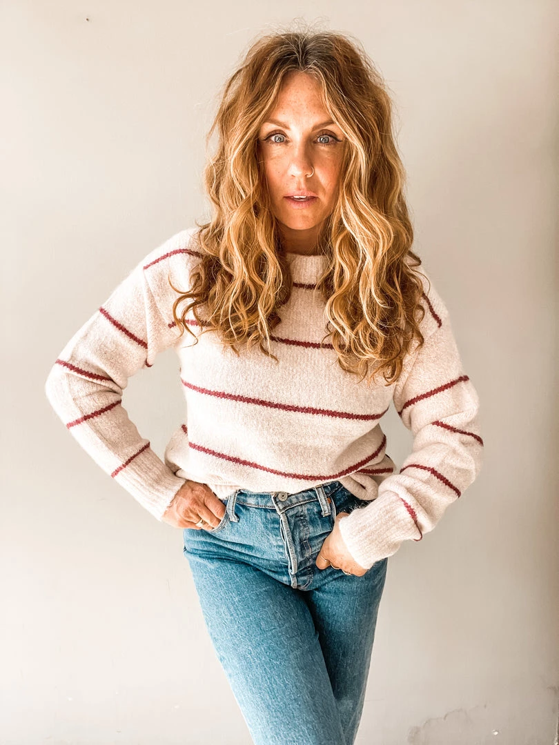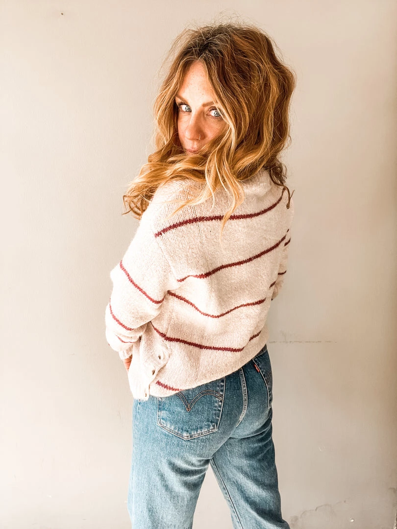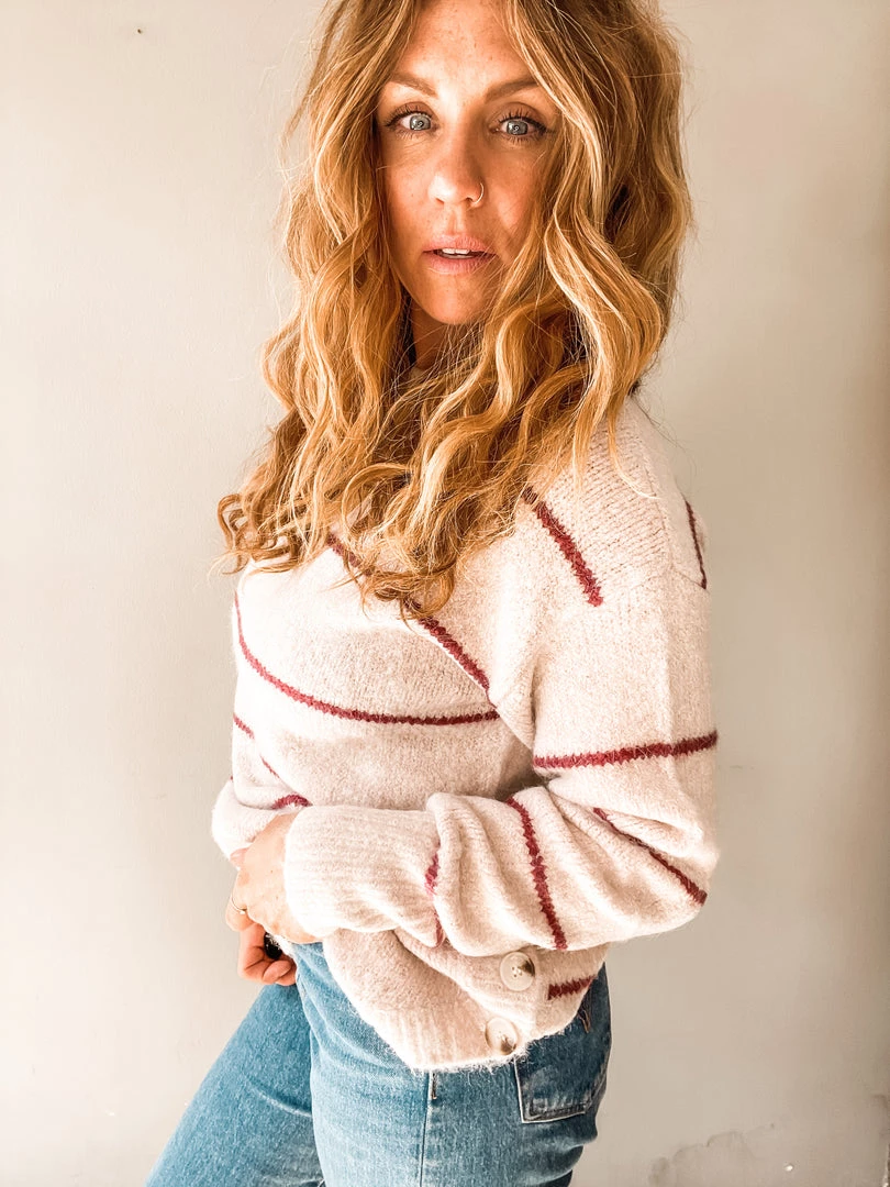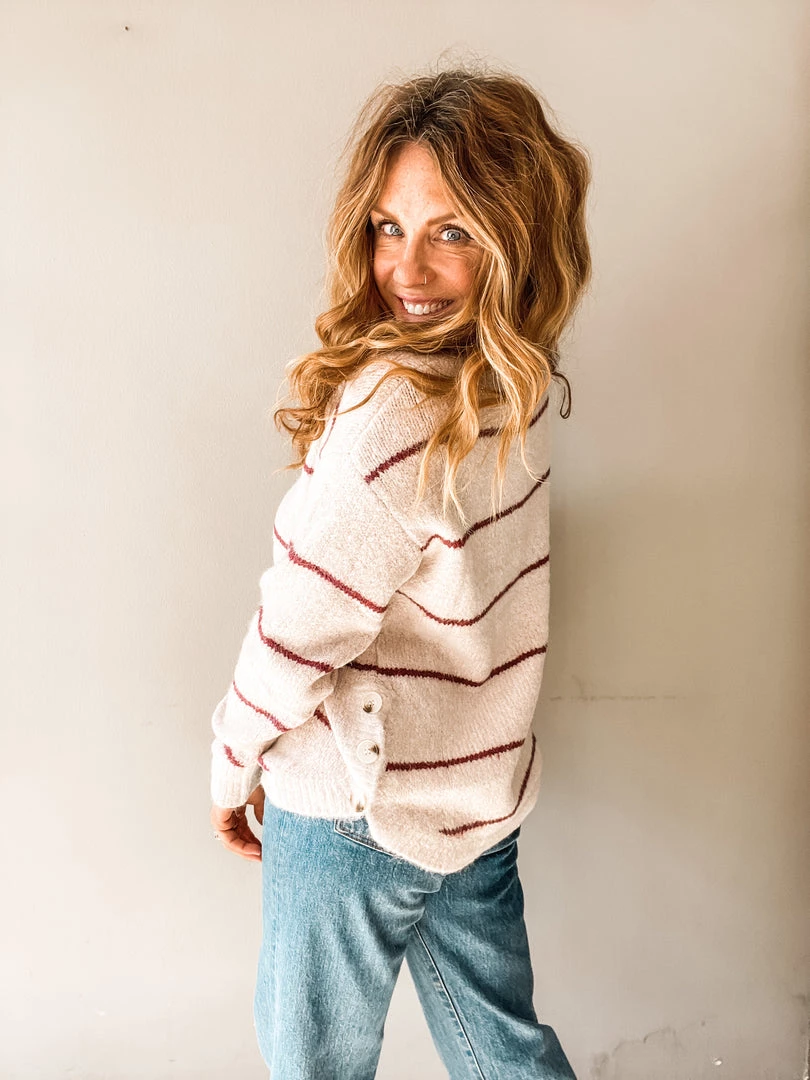 The Higher Love Striped Sweater is a super loose fitting and longer silhouette sweater in a dusty rose striped print. We love the side button details of this cute and easy classic Fall/Winter staple. Tuck it in or rock it long and loose for a more casual vibe!