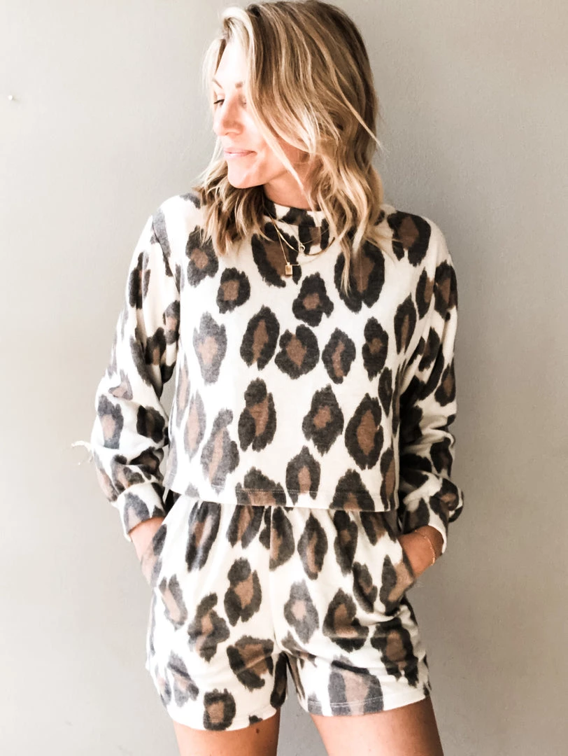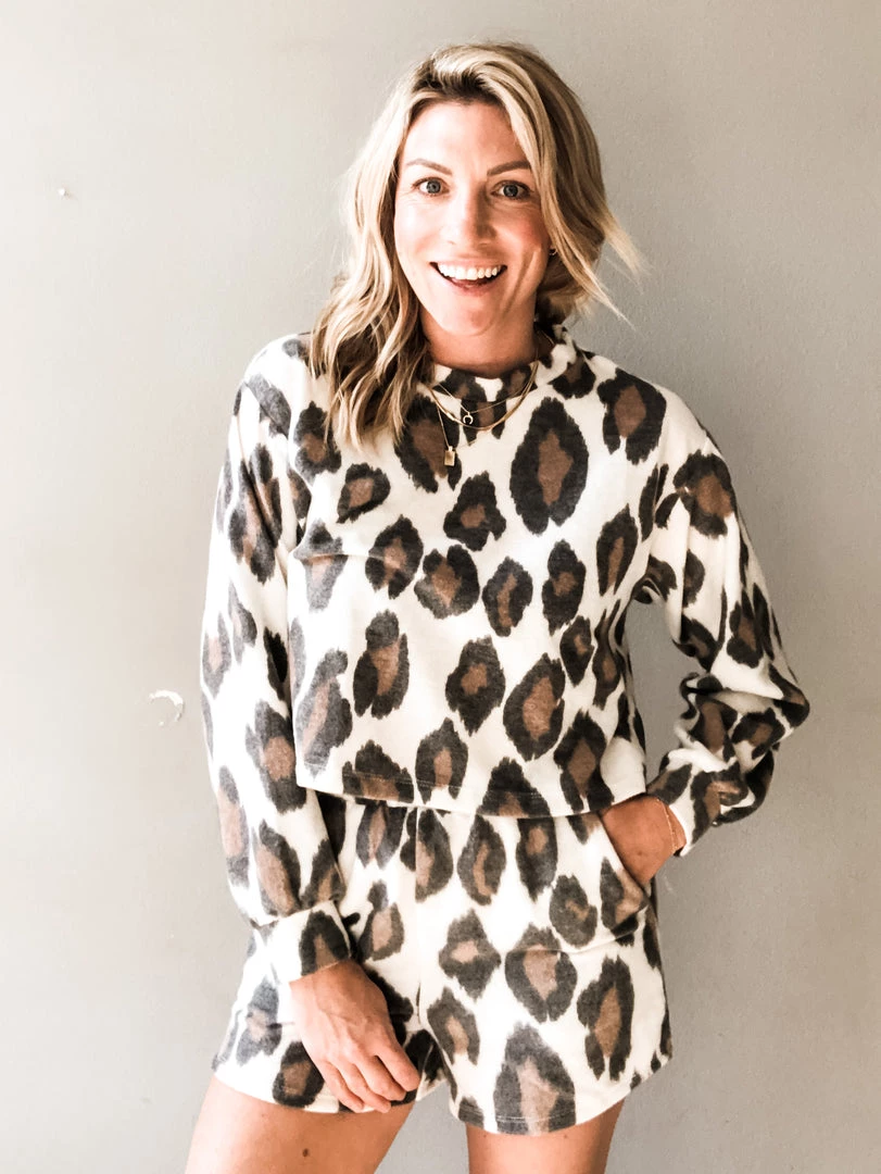 An all over leopard print short in a super soft, light weight knit. With an elastic waist and side pockets, thiese pull on shors are the ultimate in lounge wear, worn solo or paired with the matching pullover. Versatile and easy to wear. Perfect for a gift!