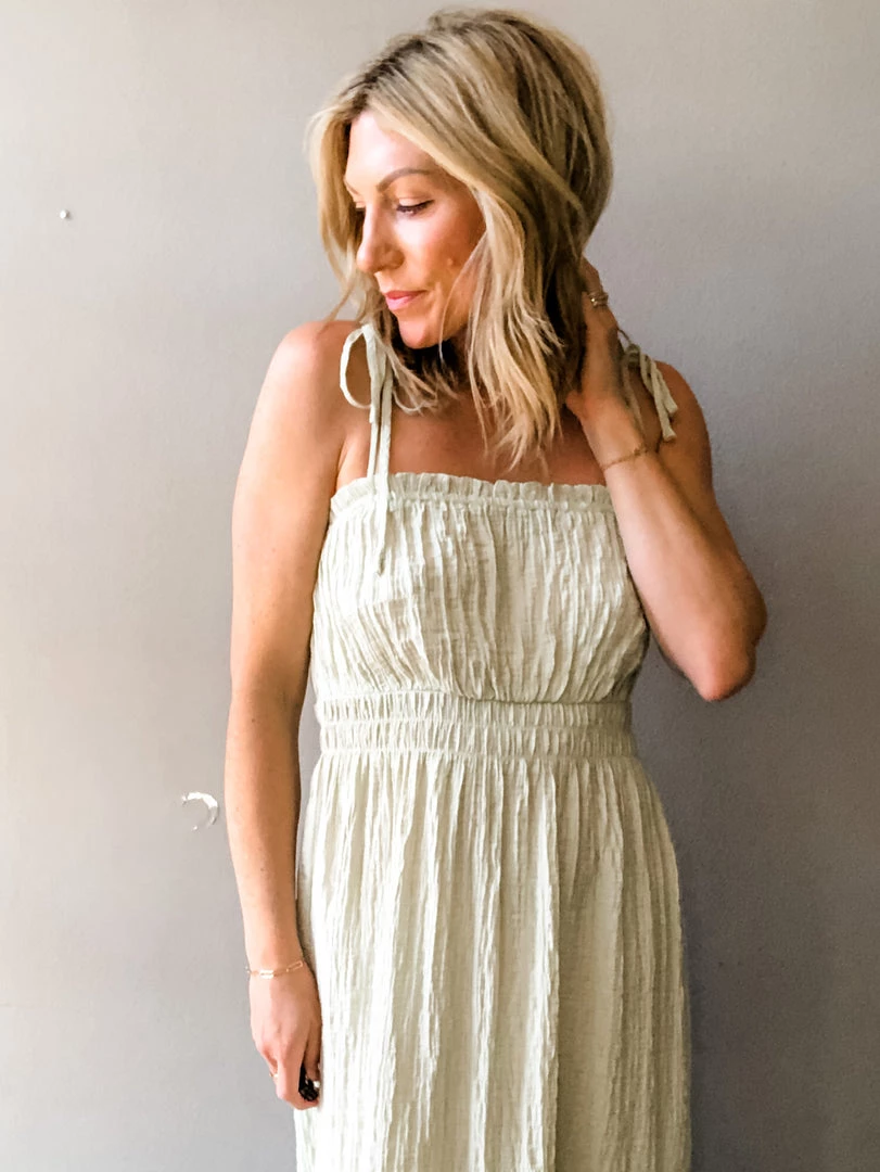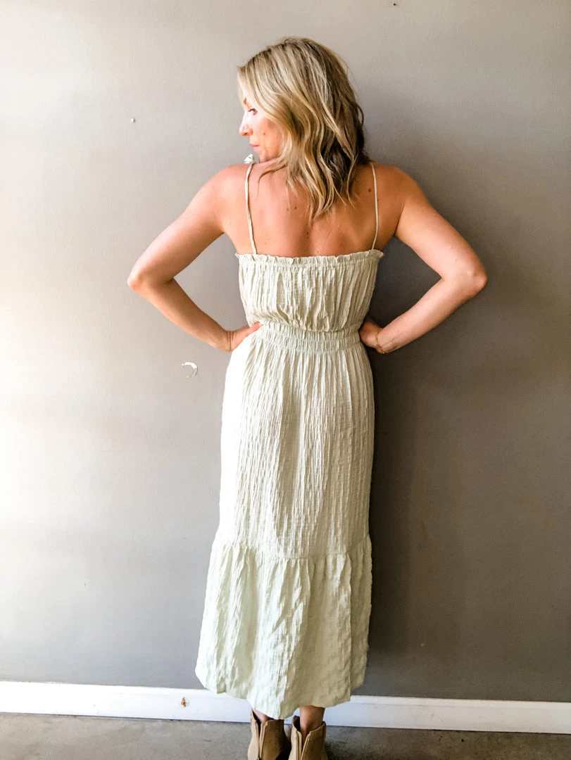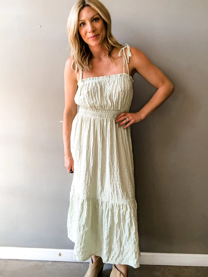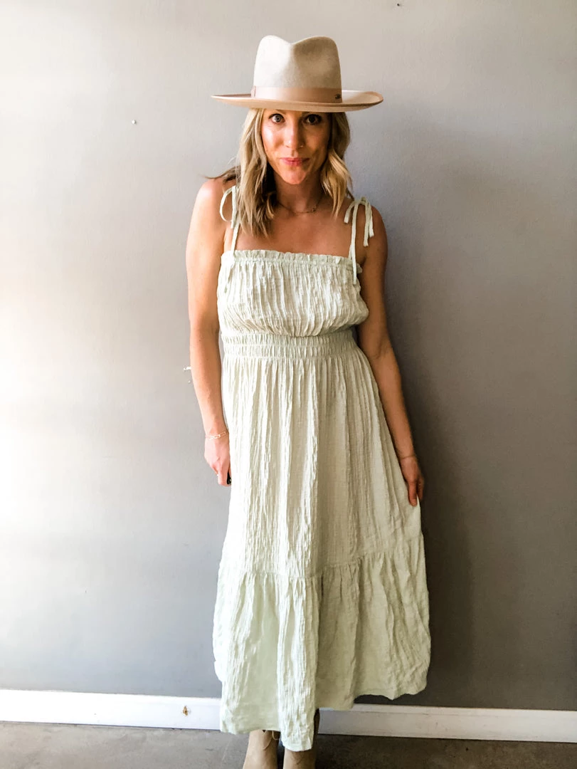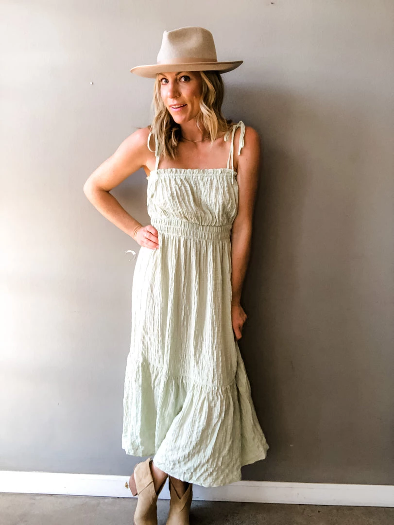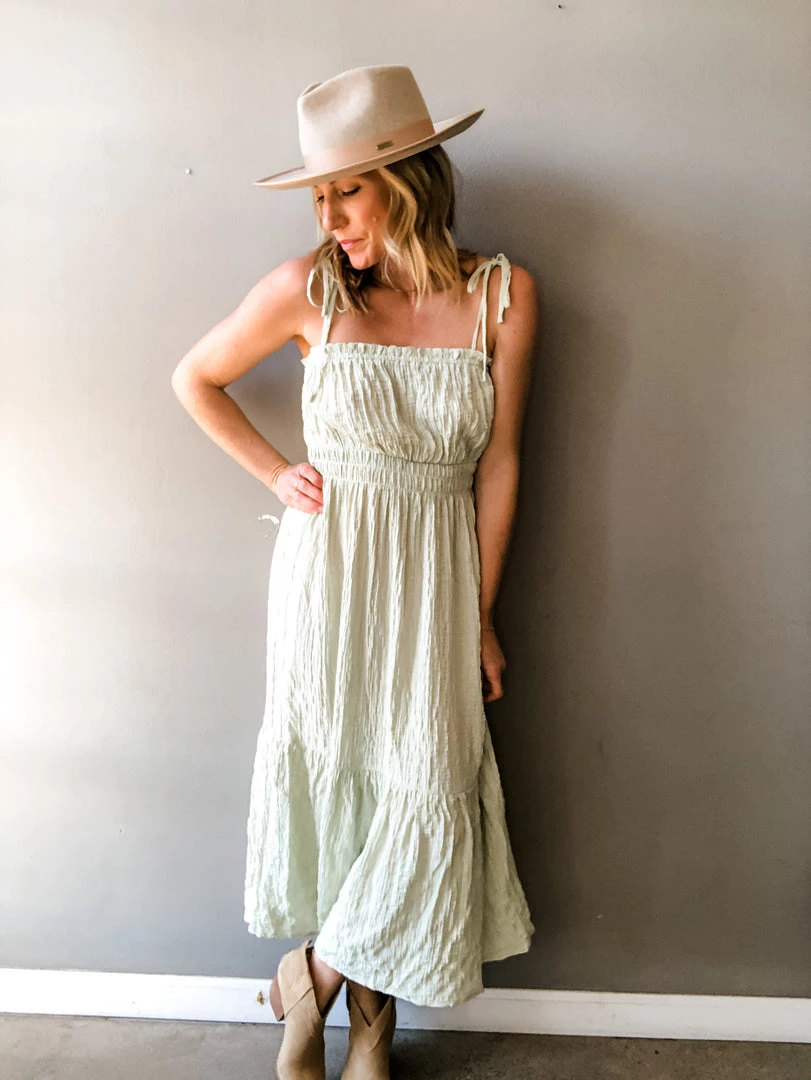 Loving on this flowy, crinkle midi dress in beautiful muted green colorway. With a boho vibe, this dress has adjustable tie shoulder straps, a straight across neckline with elastic and ruffle trim, a tiered skirt and elastic waist. Paired with the Arrow Bootie and a Gigi Pip hat to cap off the look. A great fit for any body style!