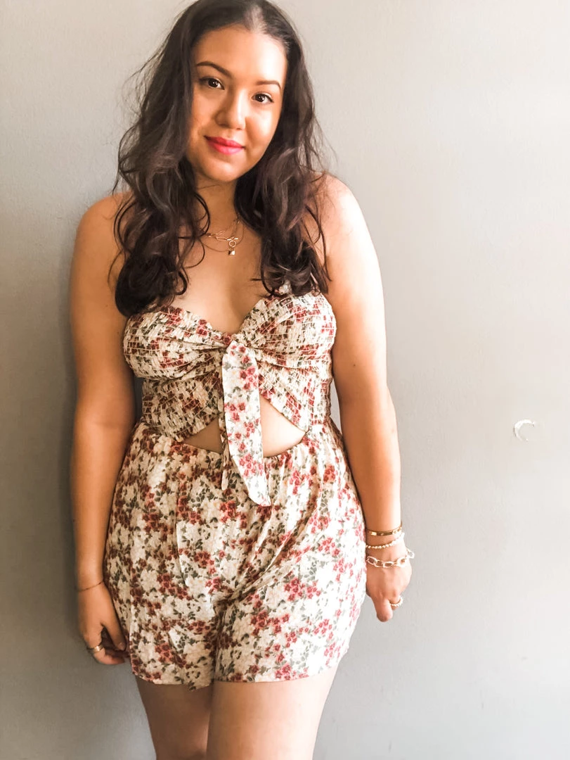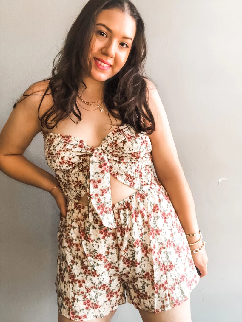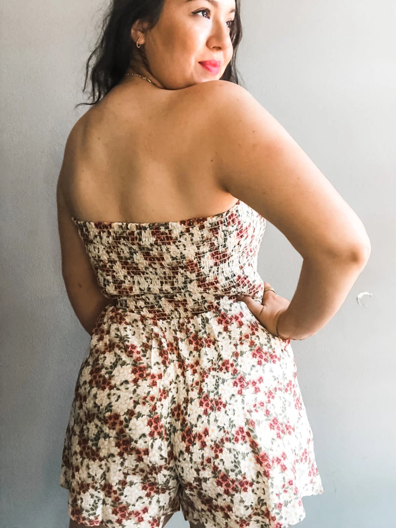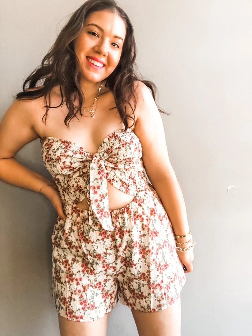 The sweetest little garden romper with strapless style and tie at the bust. A great peek a boo cutout in the waist with a higher rise short. We love this with sandals or sneakers on a hot day or dressed up for a fun summer night out!