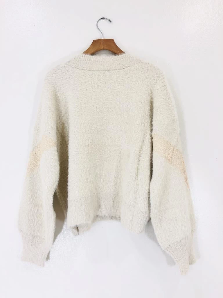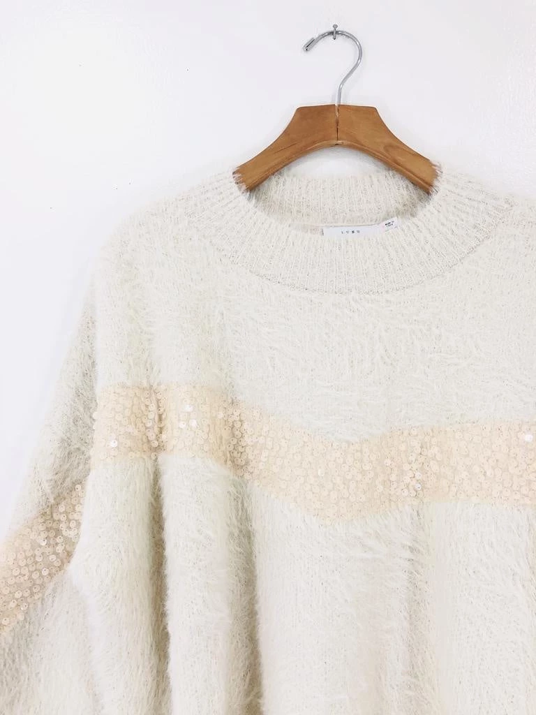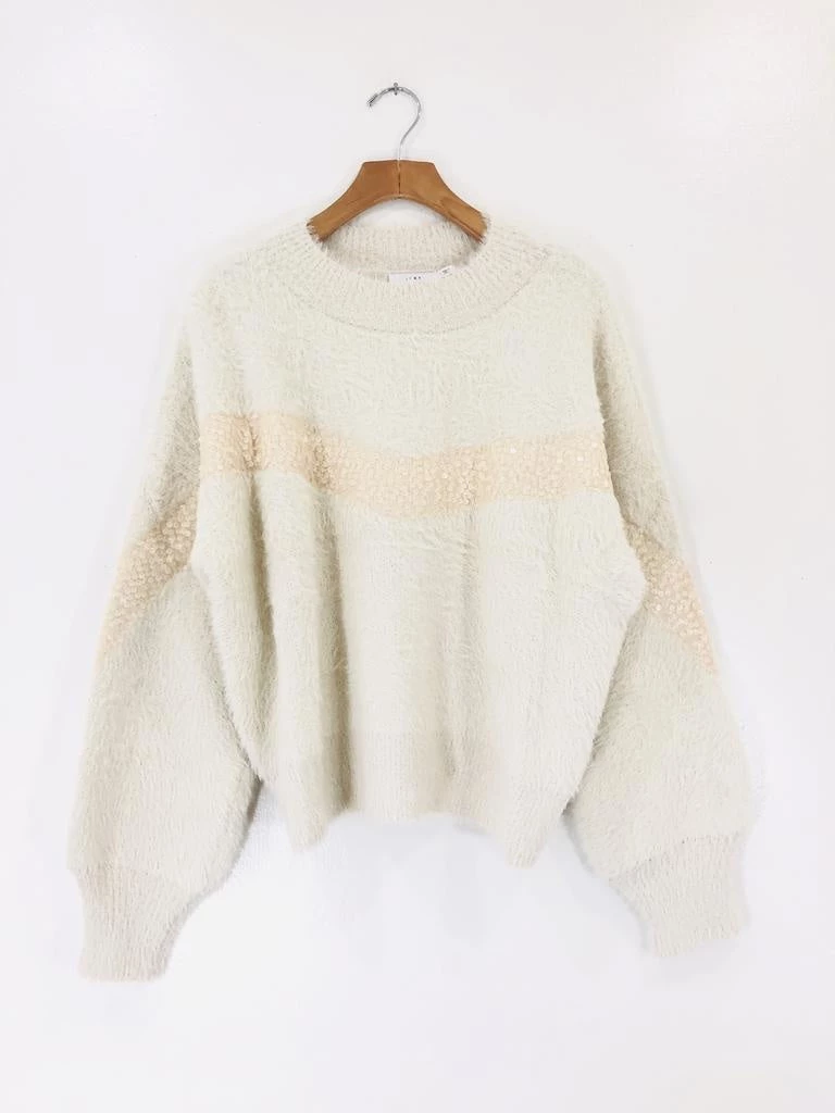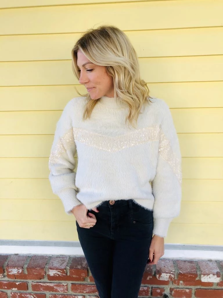 The coziest pullover sweater with a little flare we love. The Holly sweater is fuzzy and soft with a sequin detail across the chest and arms. Dress her up for any occassion or play it casual with some sneaks.