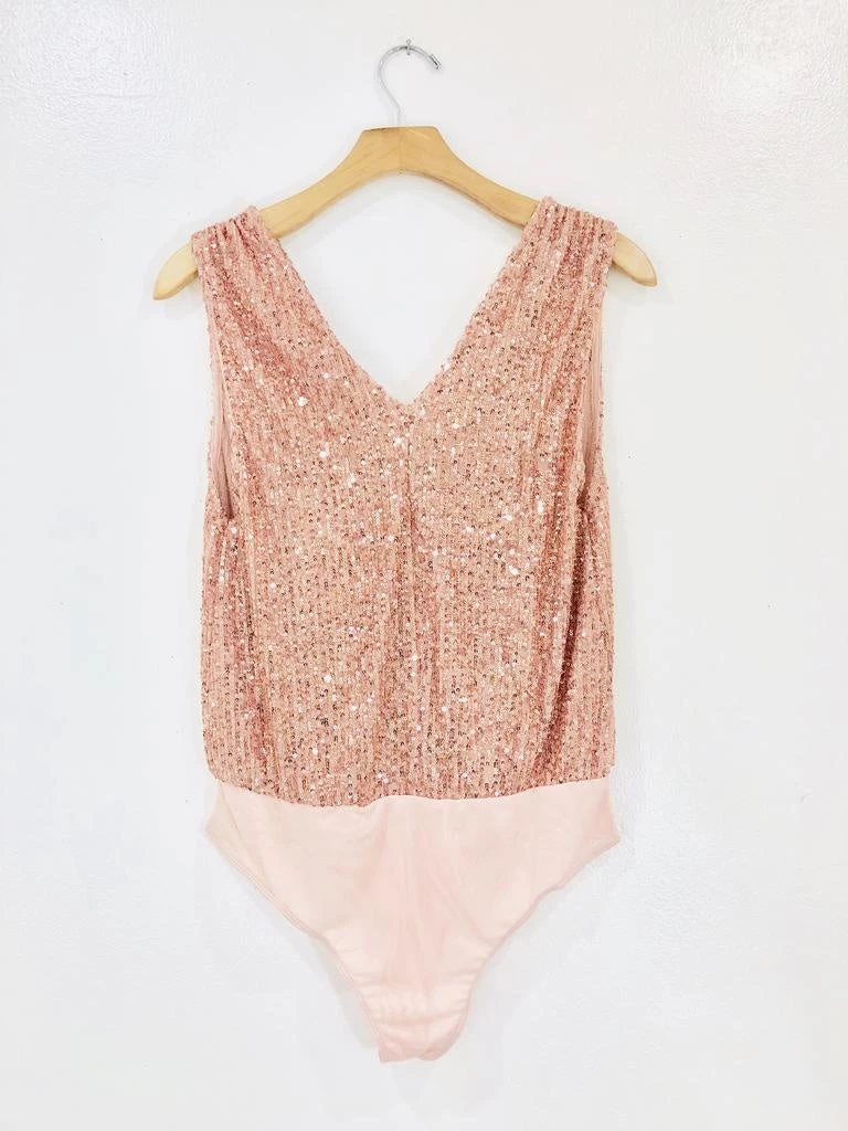 Holy Holiday! This sequin bodysuit is exactly what your closet needs this holiday season! A plunging neckline, thong cut bottom and rose gold sequin make this bad boy a showstopper.