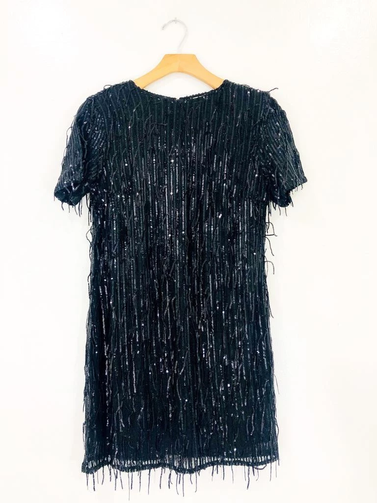 Whatever you’ve got planned babe, do it in sequins. We love this fun update on a classic LBD style. This shift dress features short sleeves with hidden zipper at the back and fringe sequin details that give us some roarin’ 20s vibes.