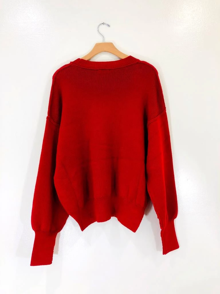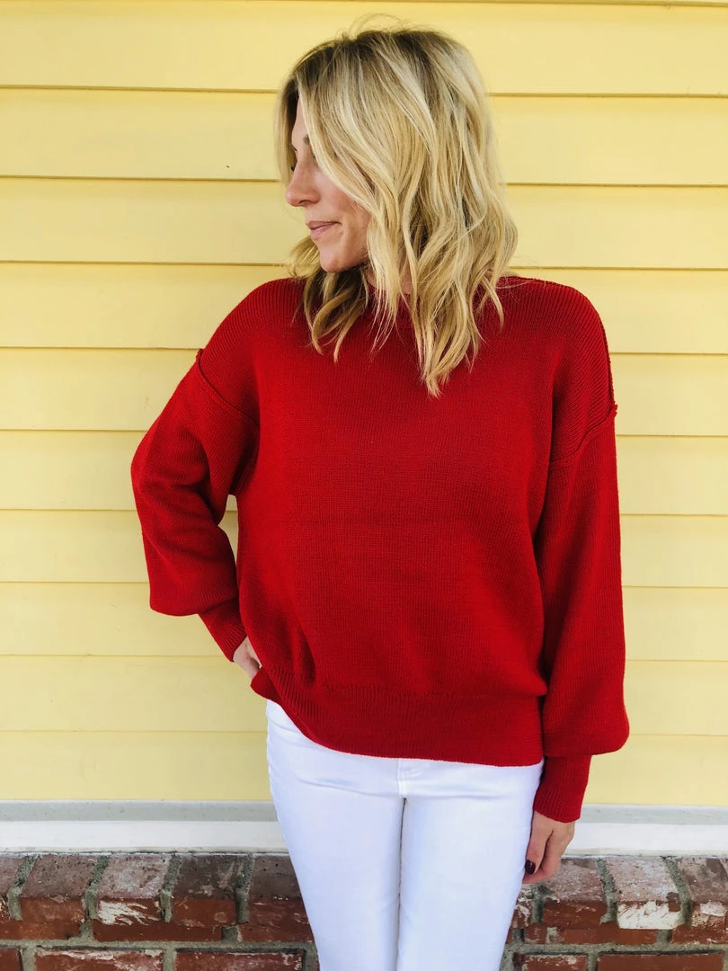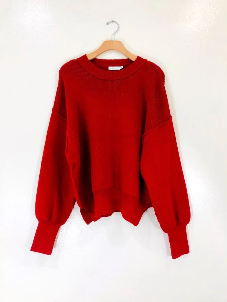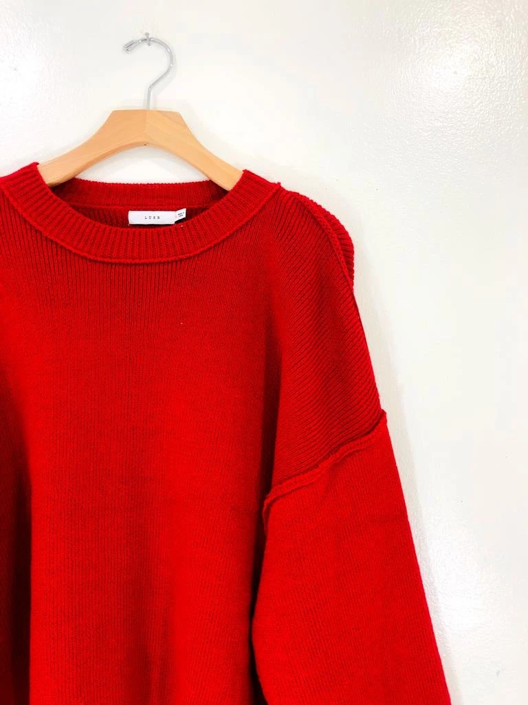 A loose fitting knit sweater with exposed seams and tiny side slits on the sides. A great everyday sweater thrown on with jeans or easily dressed up.