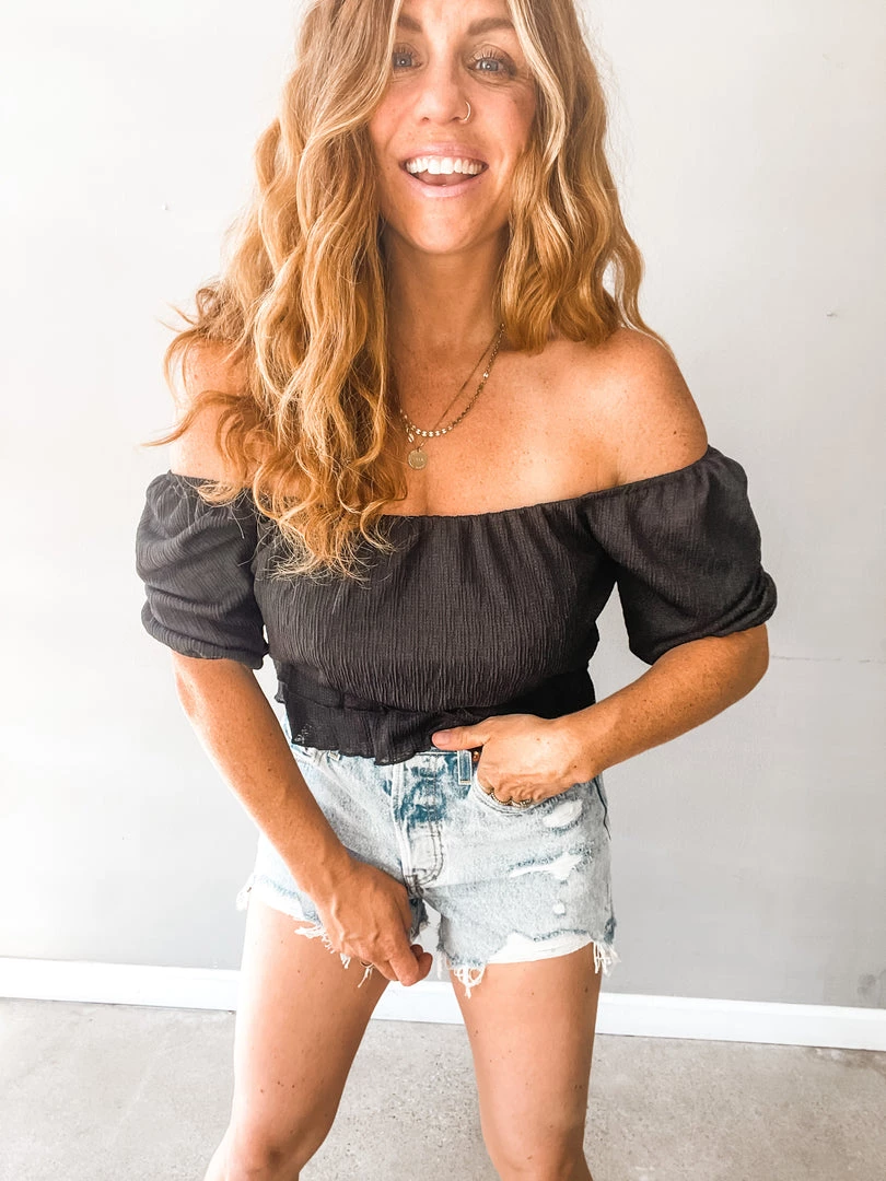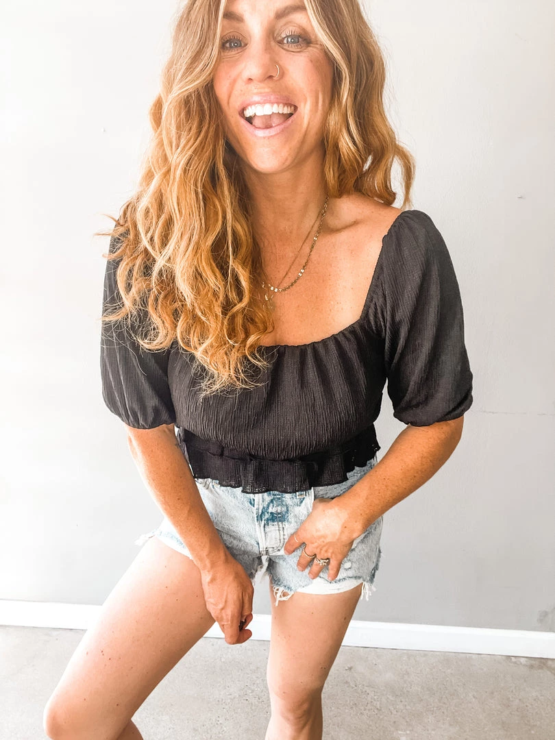 The Maria Ruffle Crop is such a cute and easy little crop top with shoulders that can be worn down or up, tucked in or out! A staple that can easeily be worn braless and nobody will know but you!
