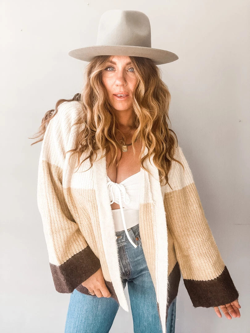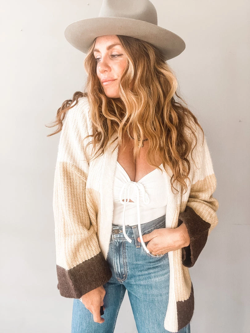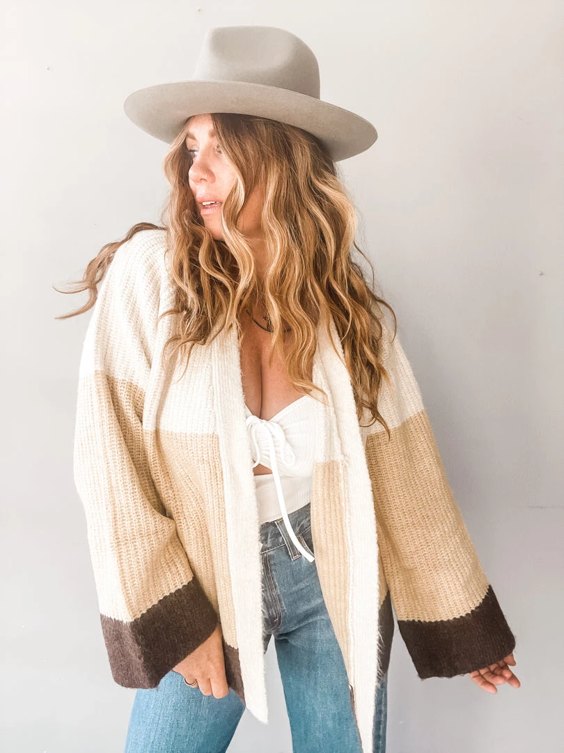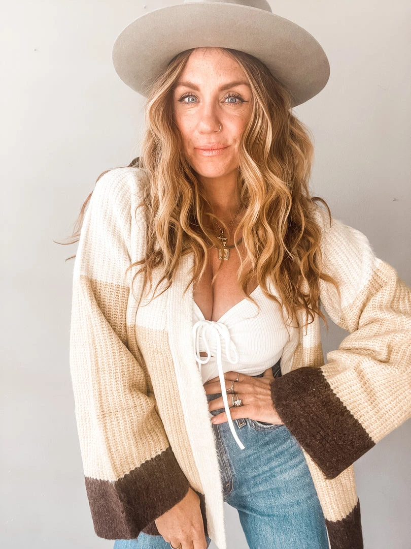 The Meet you at the Cabin Cardigan is all our favorite neutral tones bundled together in the perfect cozy cardi!!! Love the chunky striped details of this soft knit, open style cardigan. The loose bell sleeve makes it seem effortlessly feminine and chic. Love it paired with your favorite tee or tank and denim.