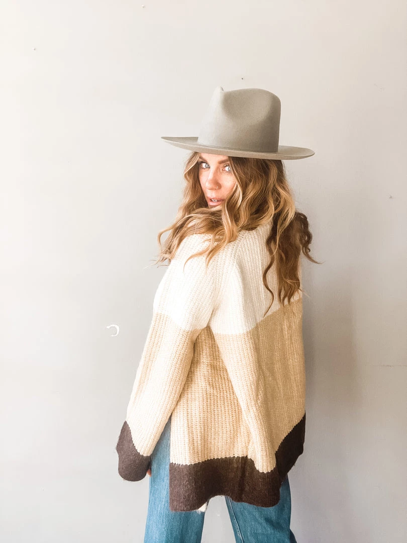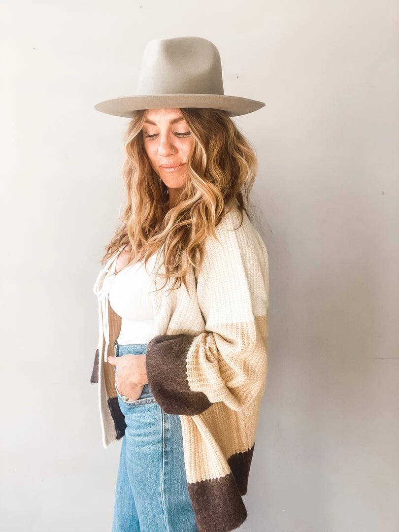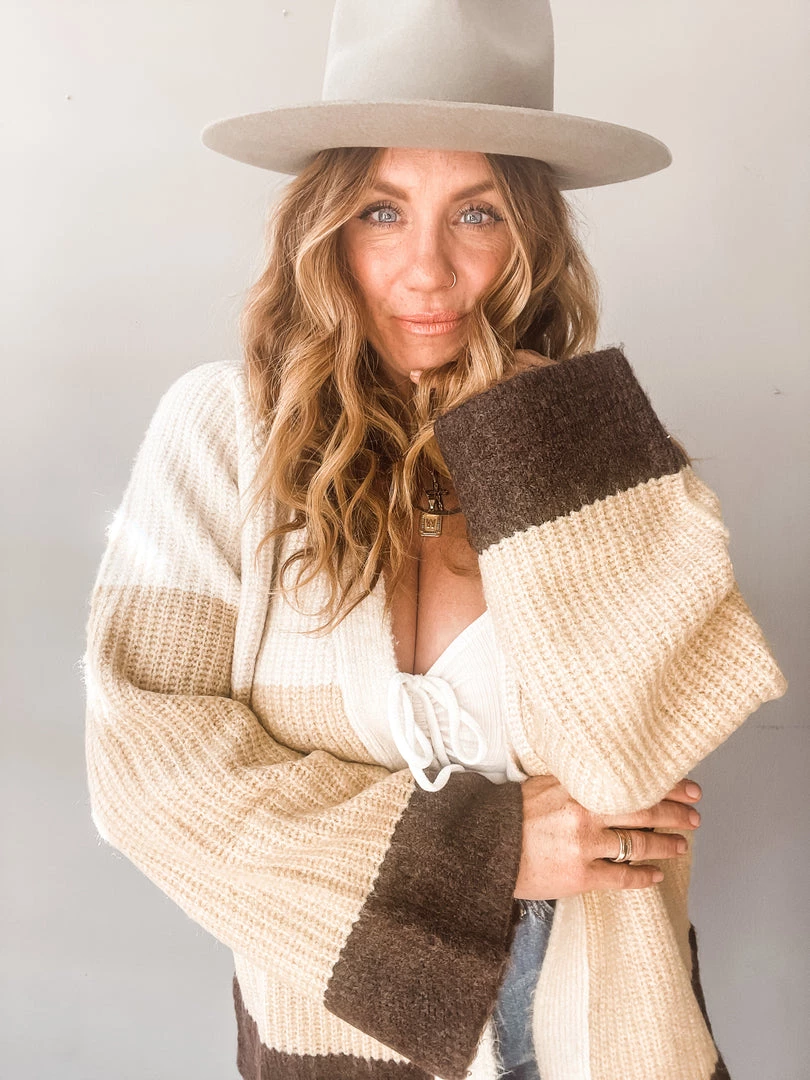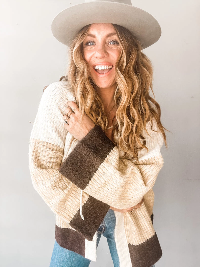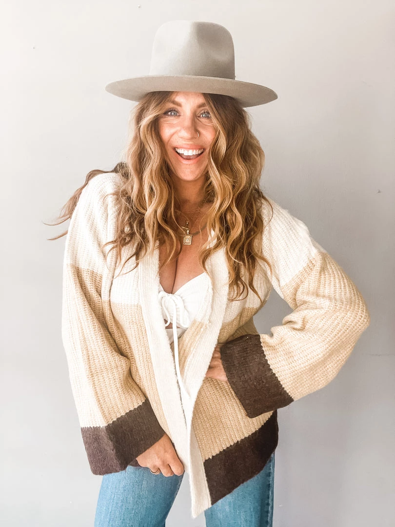 The Meet you at the Cabin Cardigan is all our favorite neutral tones bundled together in the perfect cozy cardi!!! Love the chunky striped details of this soft knit, open style cardigan. The loose bell sleeve makes it seem effortlessly feminine and chic. Love it paired with your favorite tee or tank and denim.