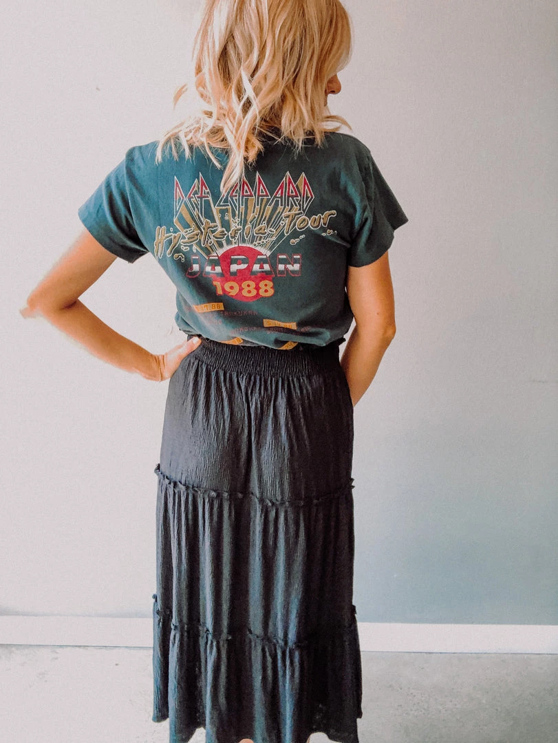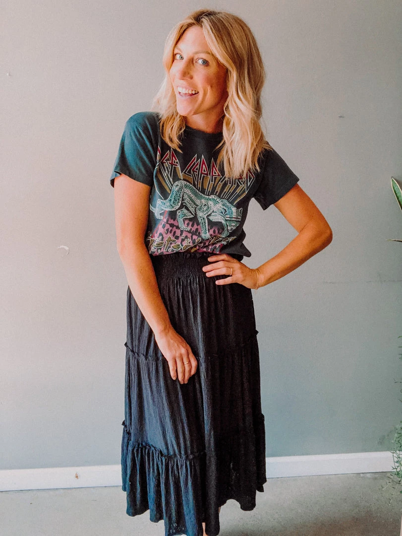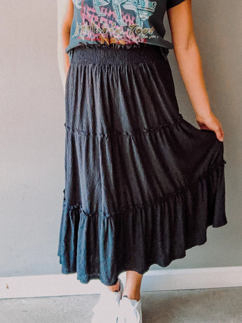 A tiered, gazuy midi skirt with elastic waist. Pair with a crop or your fav graphic tee for a casual look or dress her up for the office or a night out. A great staple black midi skirt that can be worn so many ways.