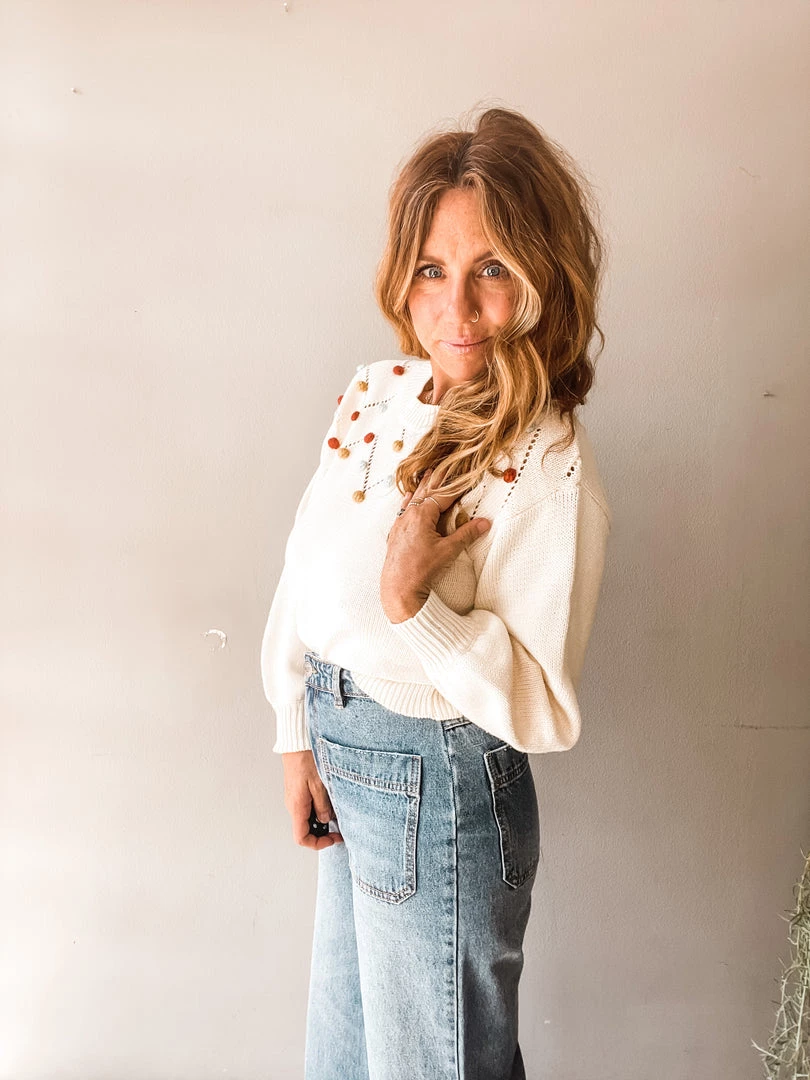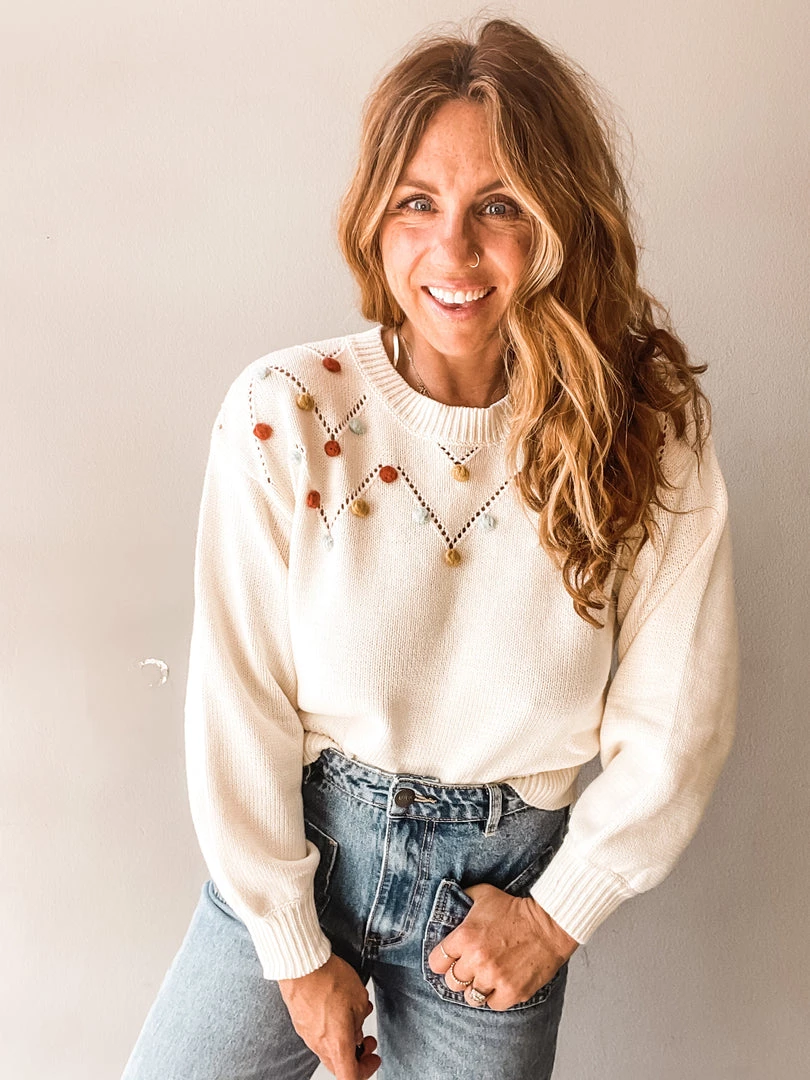 Take your basic ivory sweater and give her a little feminine twist and you’ve got the One The Dotted Line Sweater. Complete with sweet silhouette and jewel toned pom poms across the chest. A slightly tailored fit that keeps all the attention on the finer details of this knit. Banded wrists, neckline and hem with open knit chevron design on the front chest.