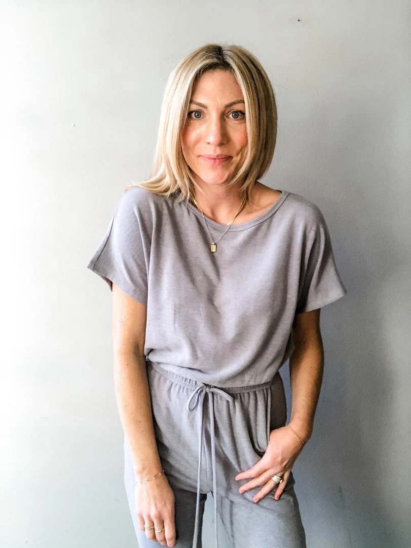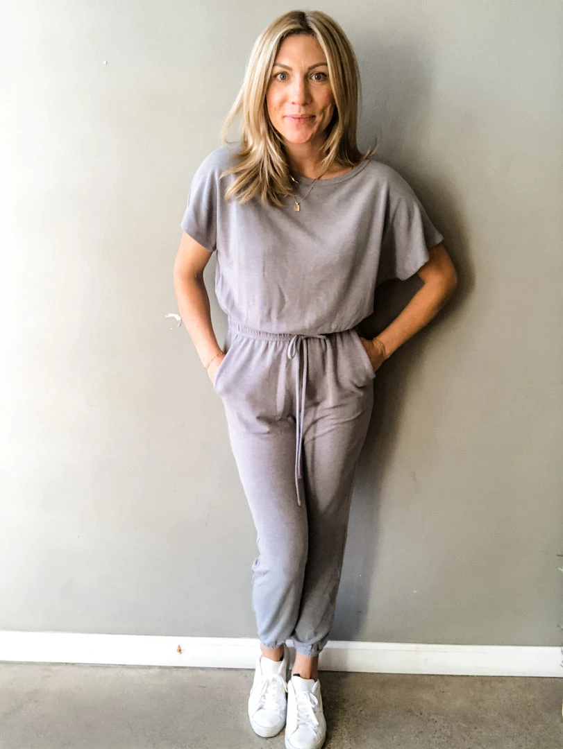 A cozy short sleeve jumpsuit with drawstring waist, pockets, key hole button closure at the back and elastic jogger style hem at the leg. Perfect for staying home and lounging in style or for travel days. Easy to pair and wear, plus super comfortable!