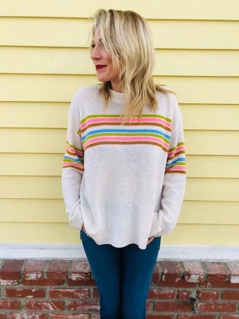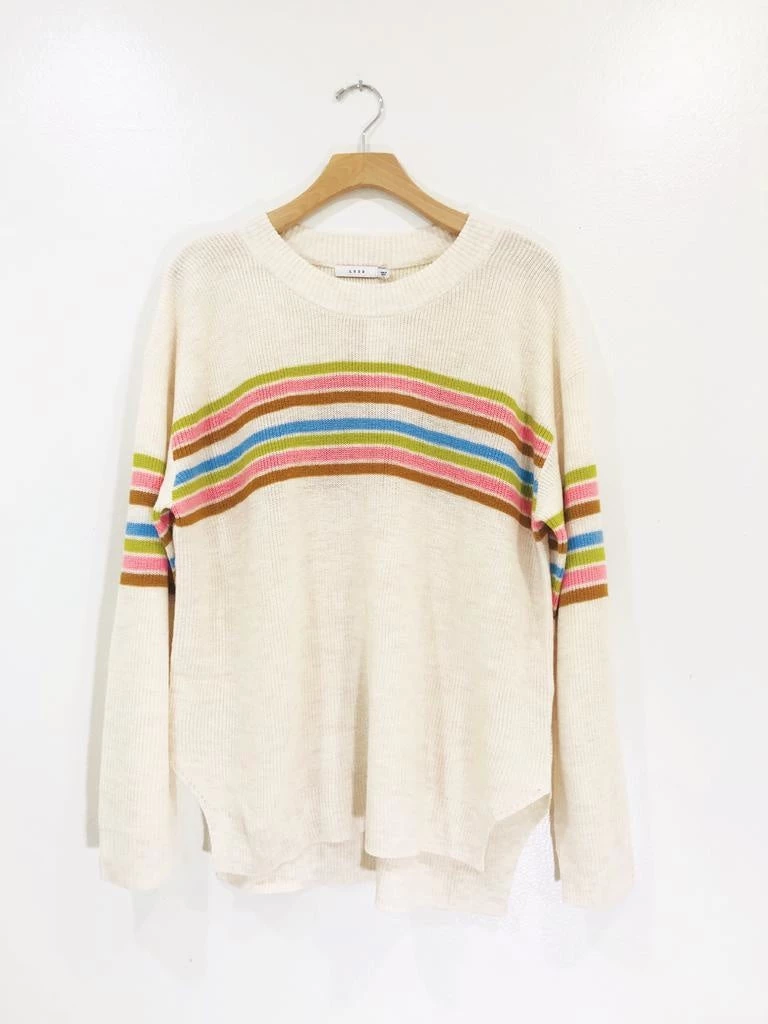 We’ll choose a retro sweater any day! Especially one as cozy as this pastel striped number. This ribbed pullover fits loose throughout with its crew neck and split cut sides.