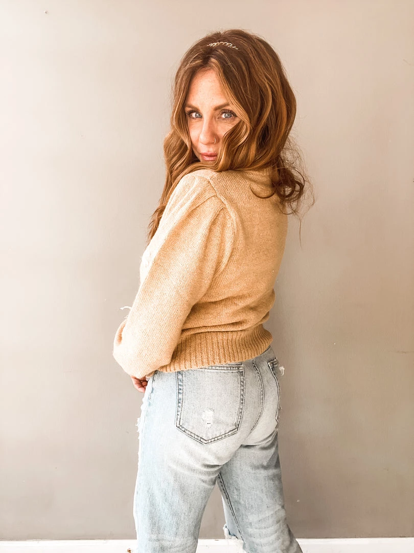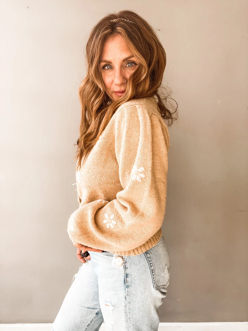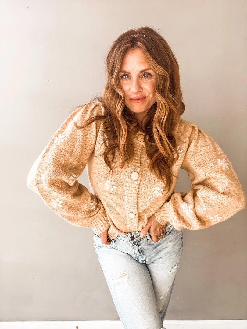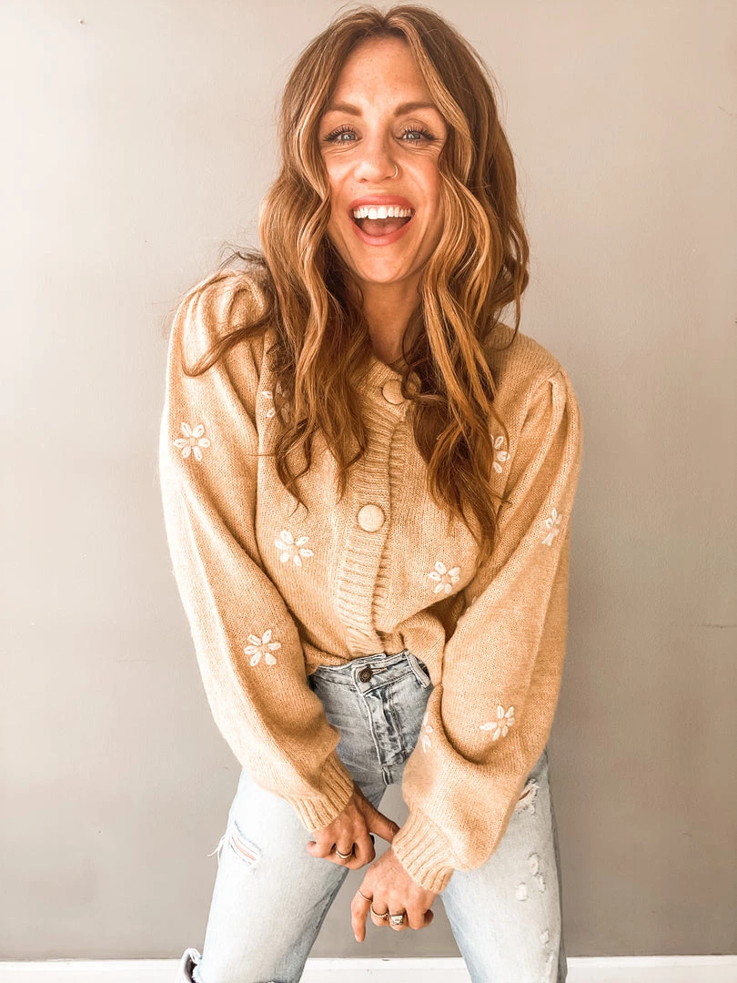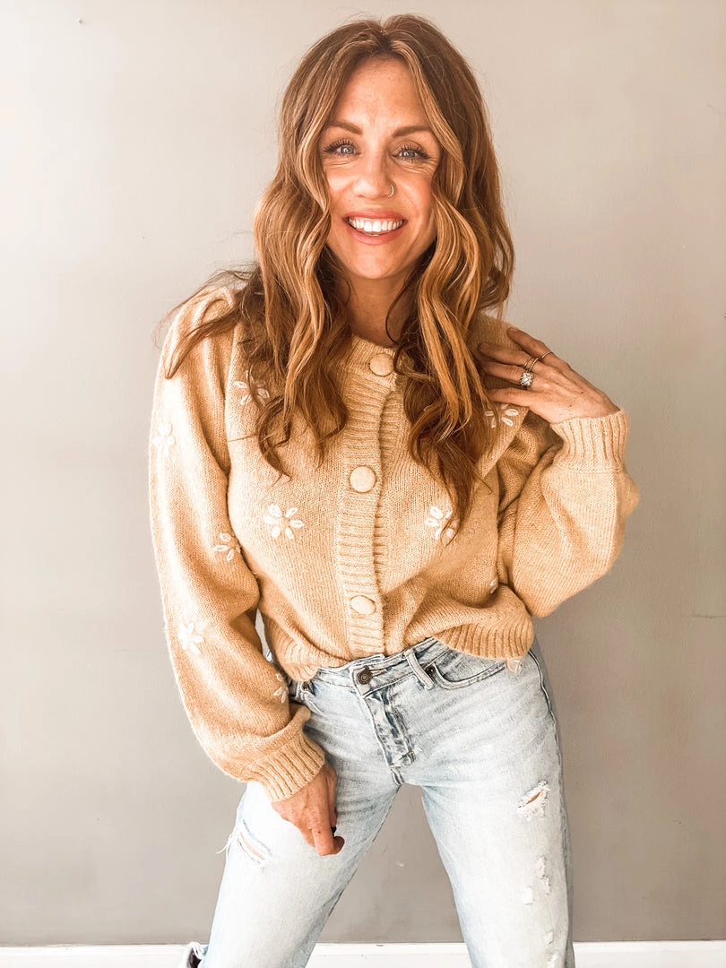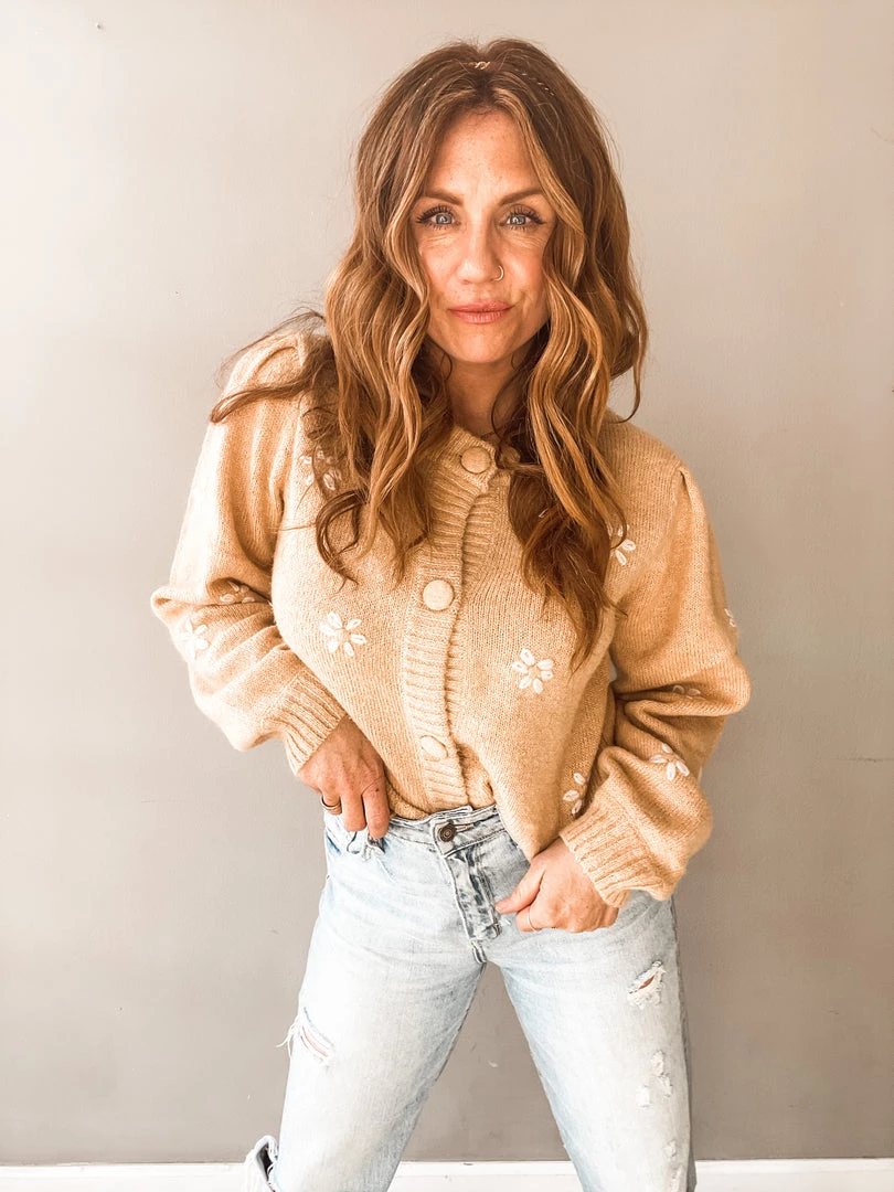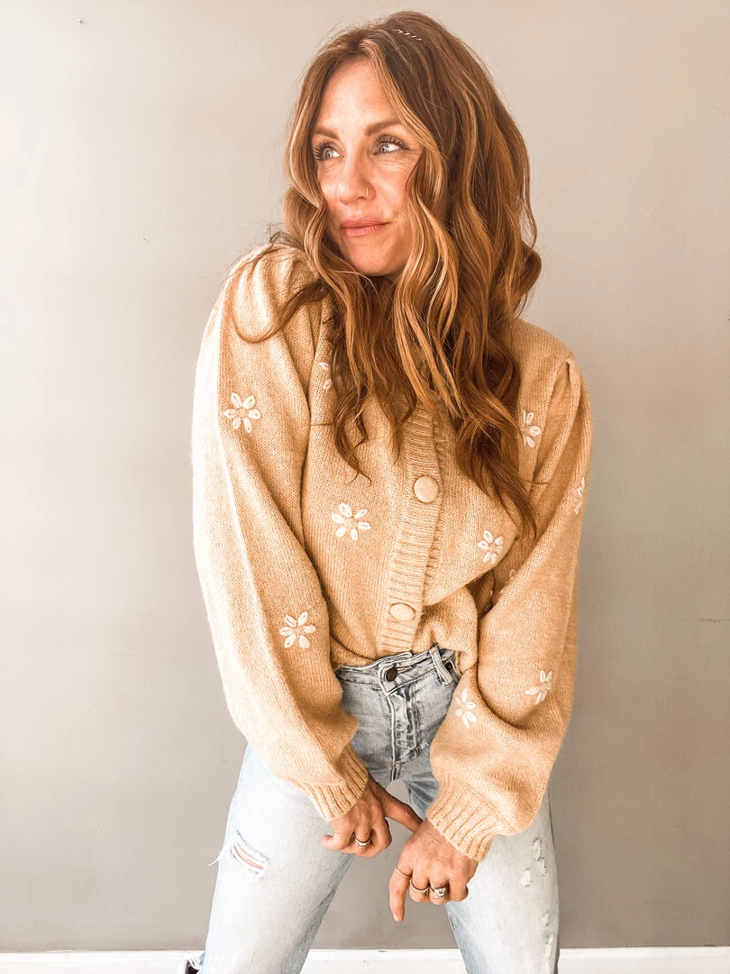 The Sandy Embroidered Cardigan is the cutest button front cardigan with flower details and slight puffed sleeve for a super feminine and fun cropped cardigan that can be worn open or closed!