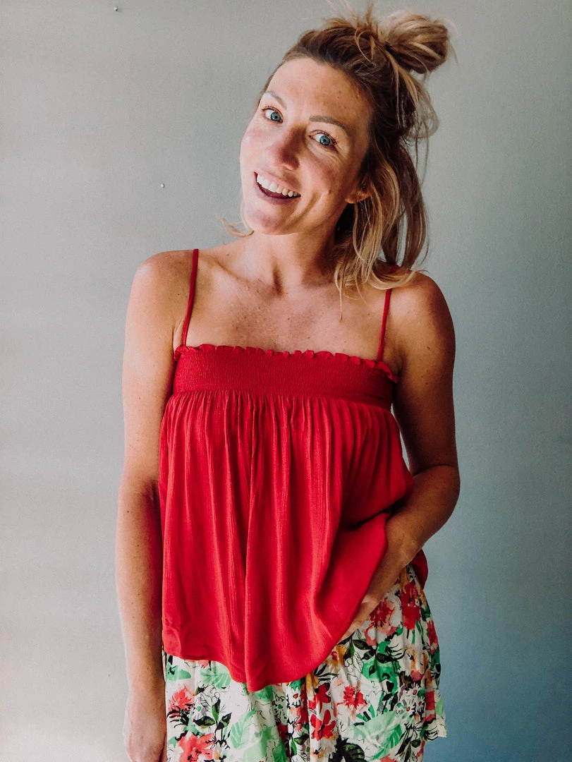 A loose fitting cropped cami with smocking and adjustable straps. An easy summer top that can be worn with your fav cutoffs for a casual look we love.