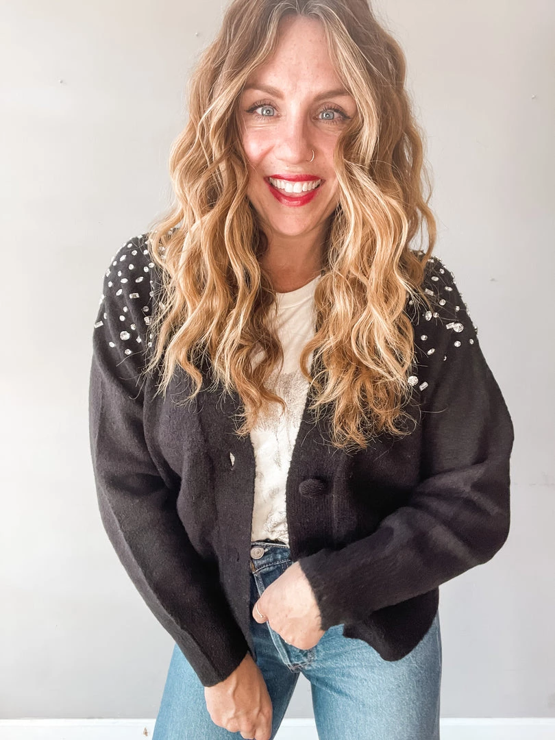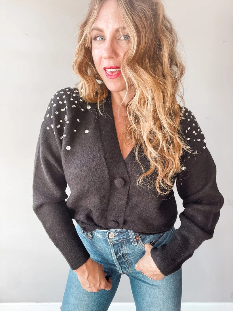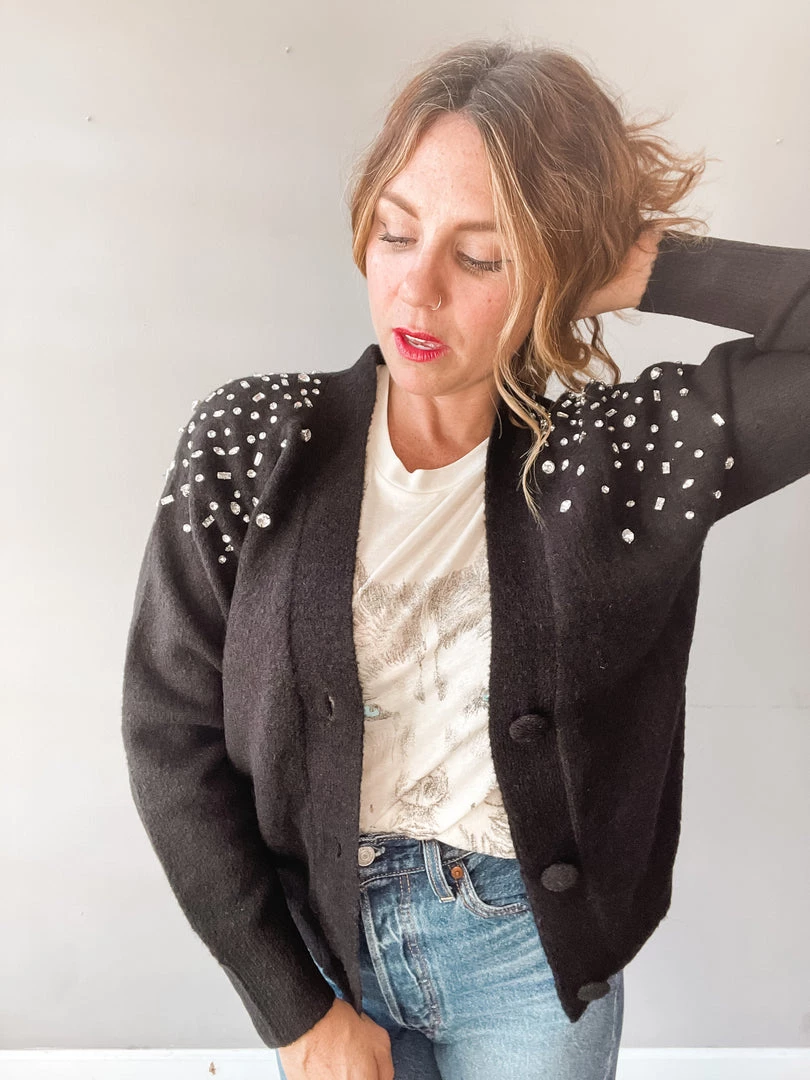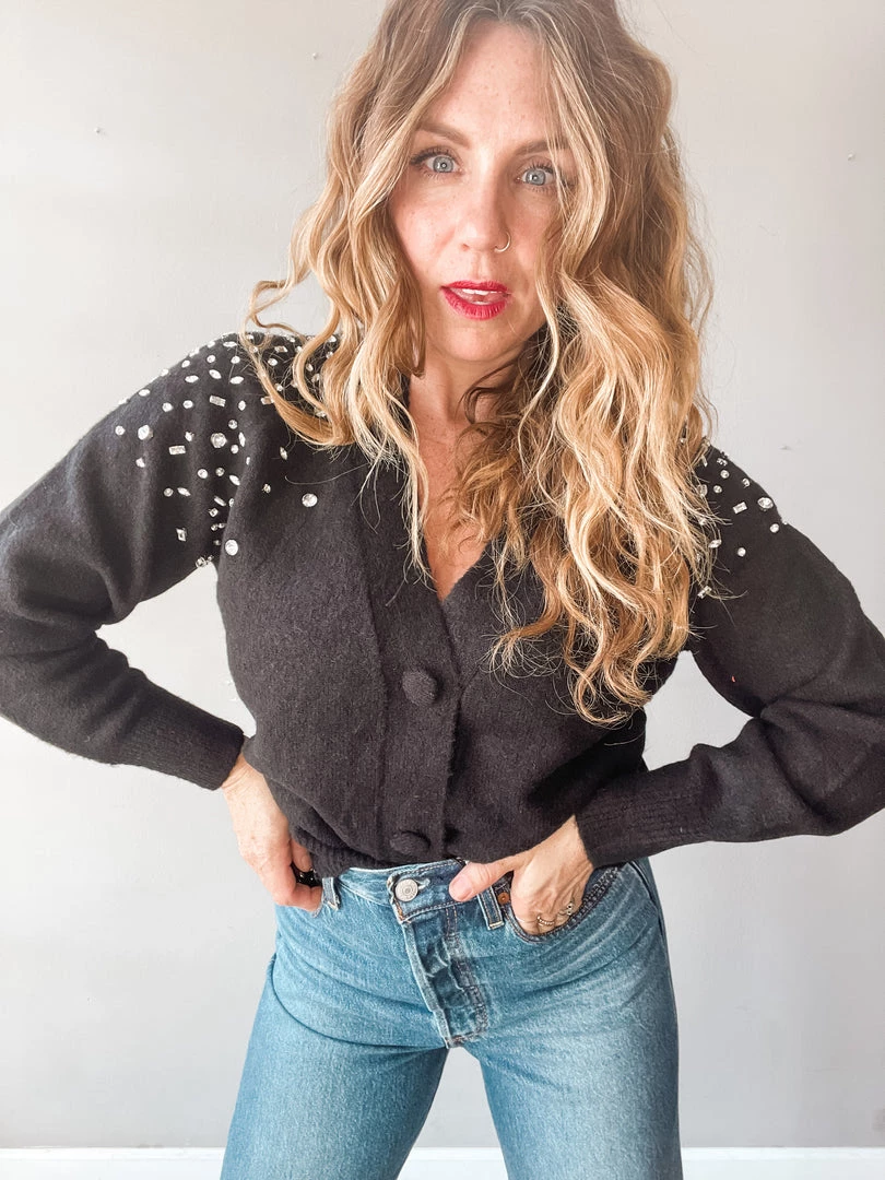 Obsessed with this new super cozy cardigan with fun and fem rhinestone jewel details on the slightly puffed sleeve!!! I loved this chic sweater buttoned and tucked in but also so cute worn over your fav tees and tanks! Slightly cropped and somewhat fitted.