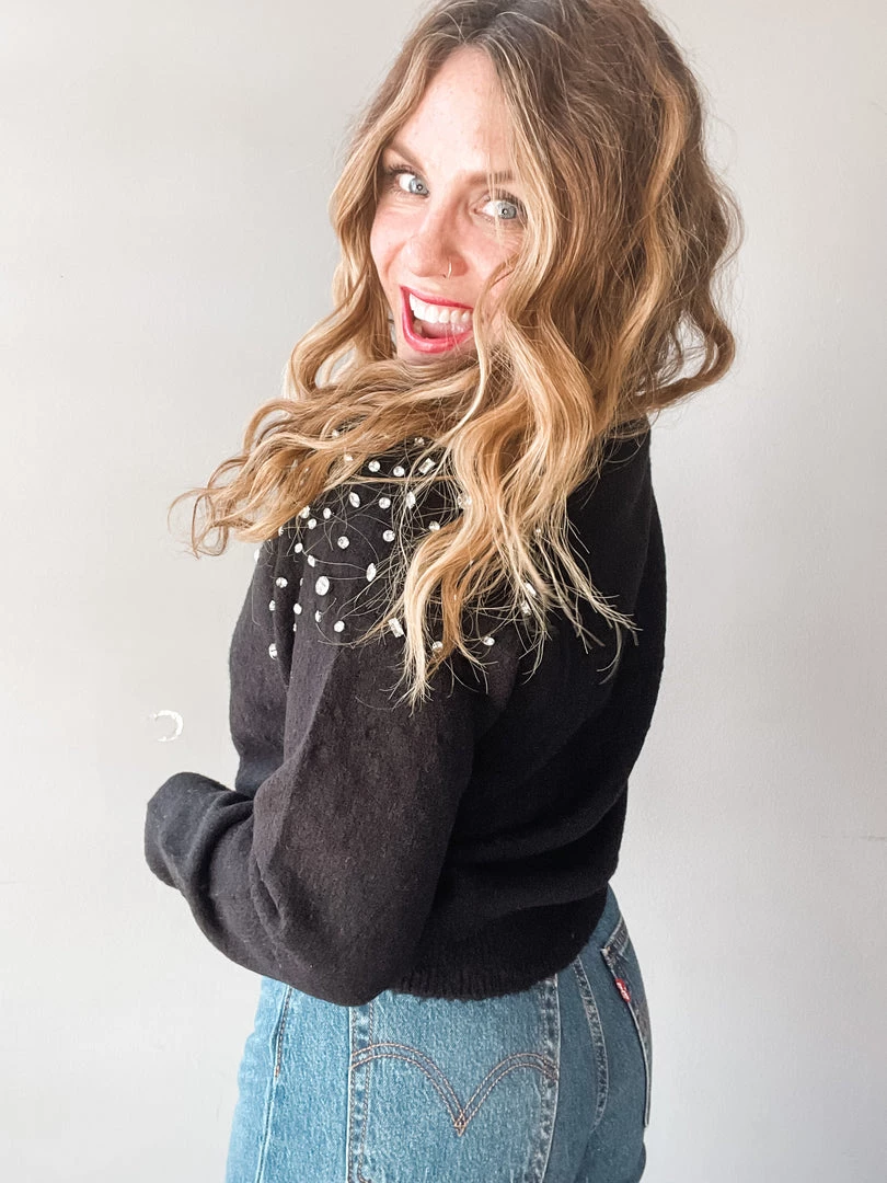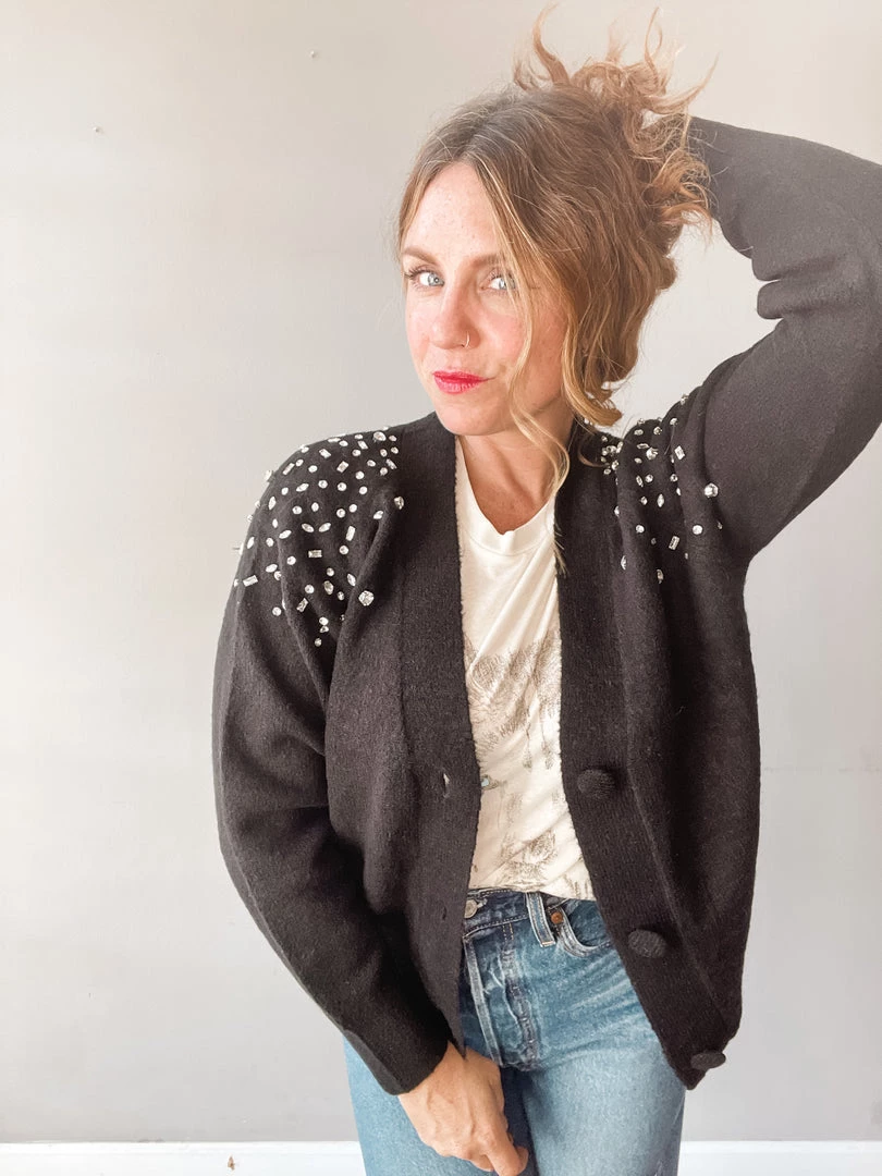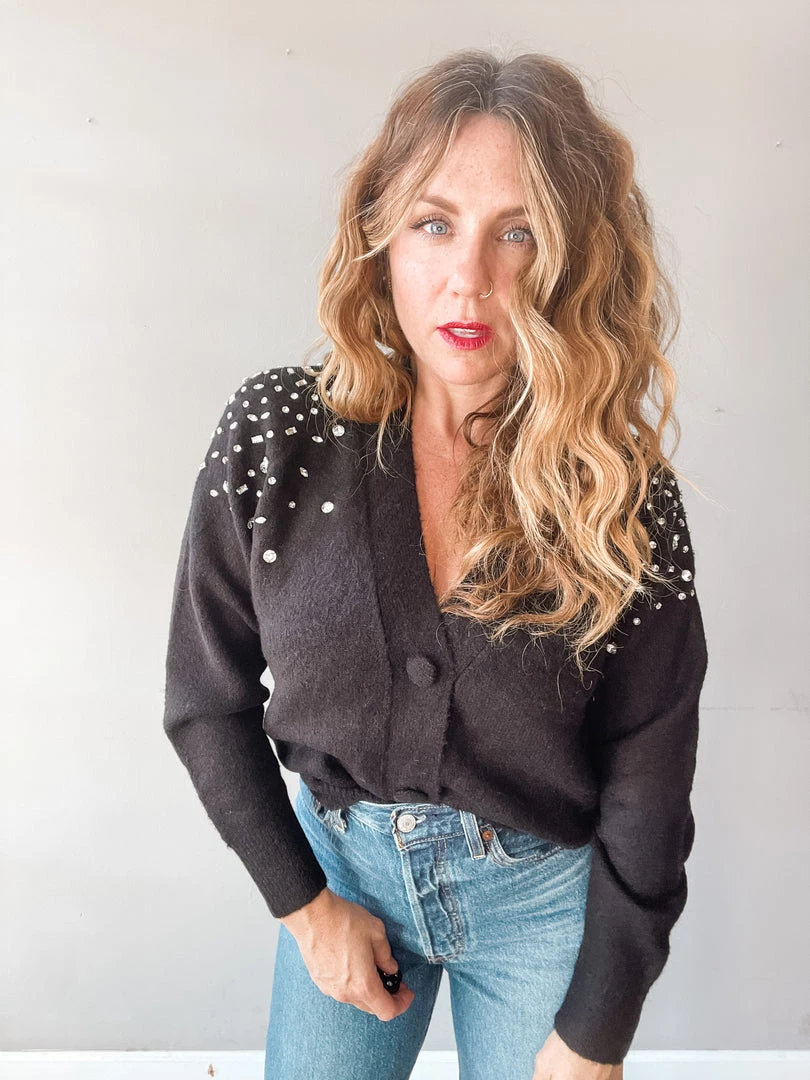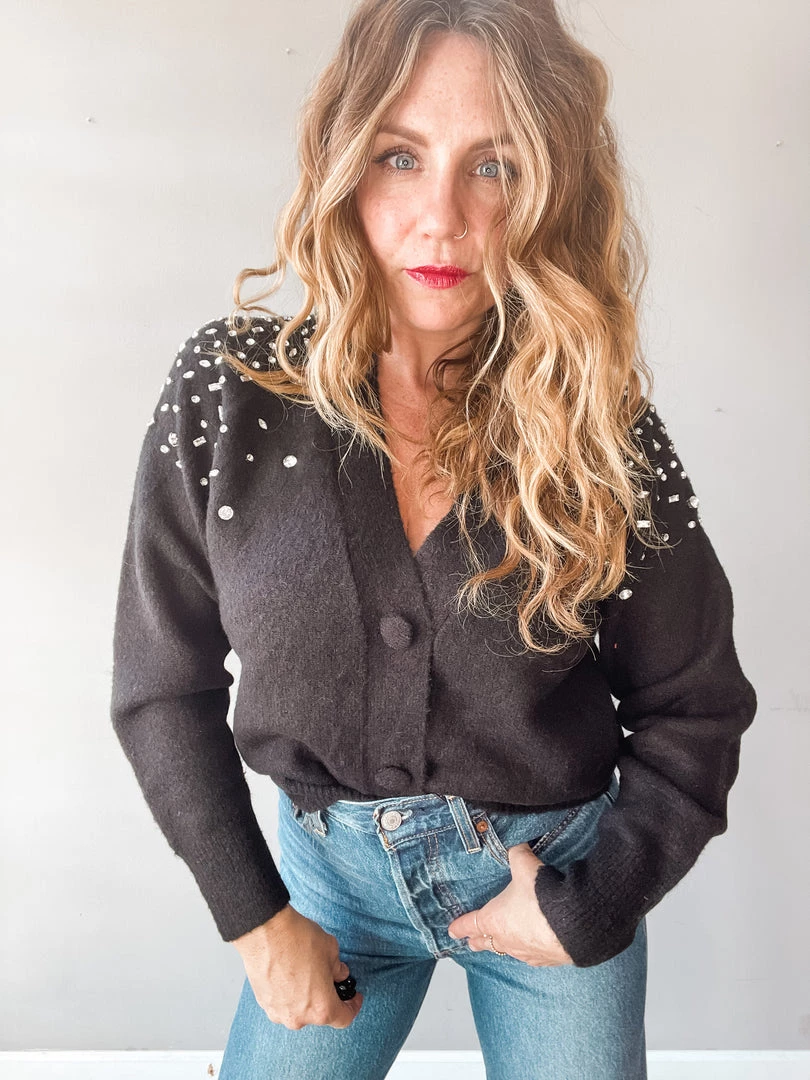 Obsessed with this new super cozy cardigan with fun and fem rhinestone jewel details on the slightly puffed sleeve!!! I loved this chic sweater buttoned and tucked in but also so cute worn over your fav tees and tanks! Slightly cropped and somewhat fitted.