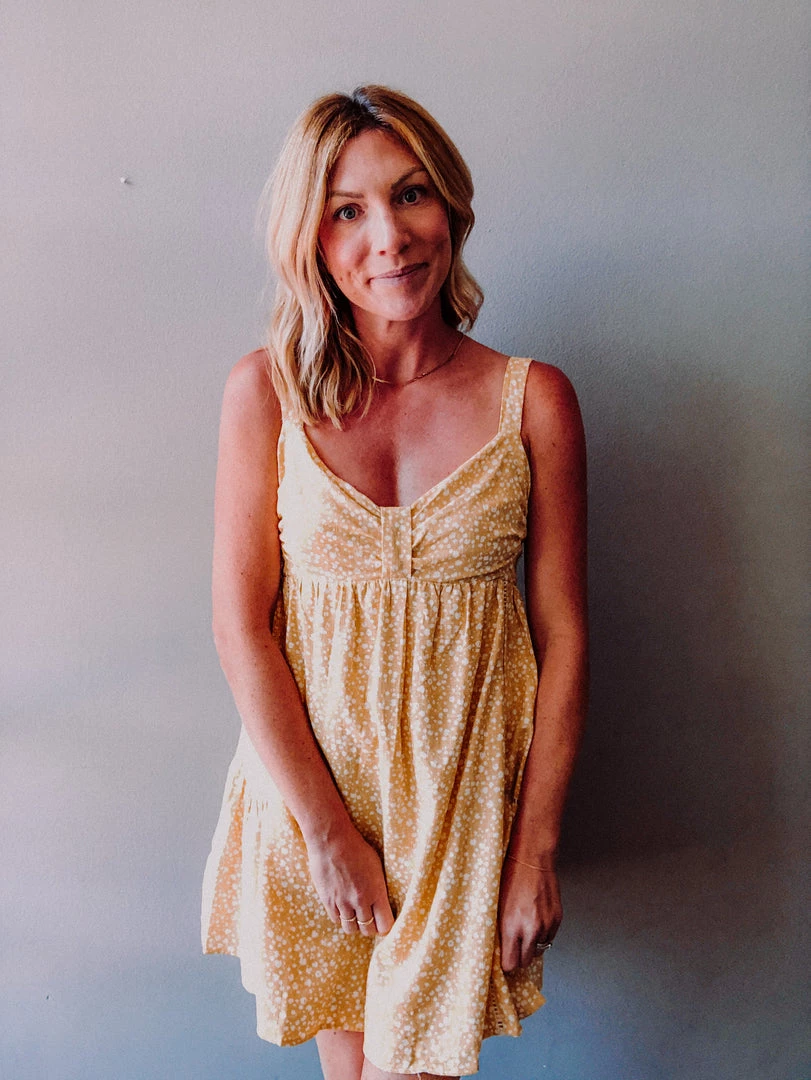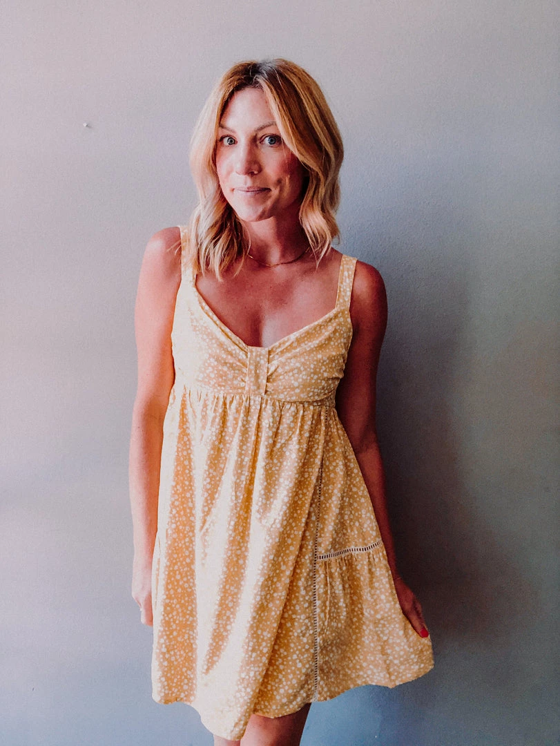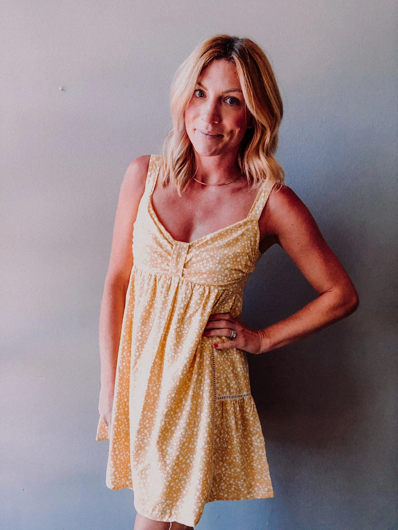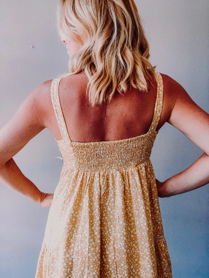 A perfect sunny summer dress for all the beautiful days ahead. A short floral dress that can be worn for backyard hangs with a pair of slides. Smocked back and loose fitting, lined skirt.