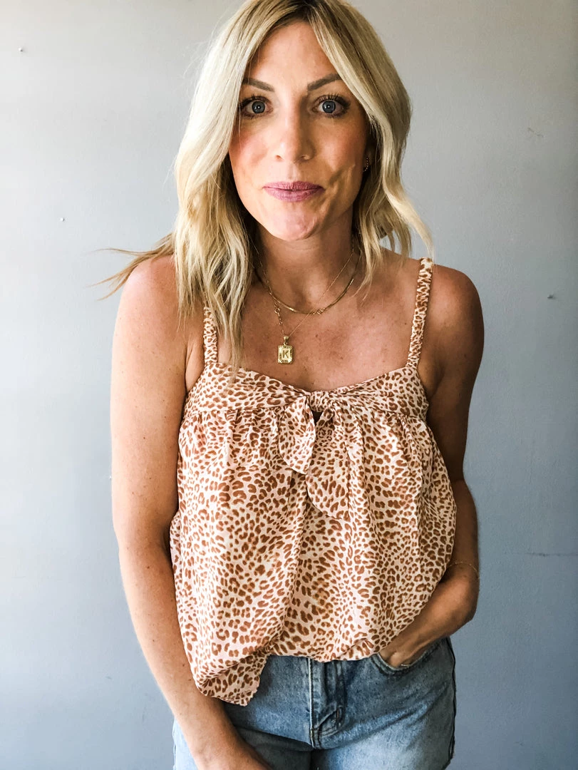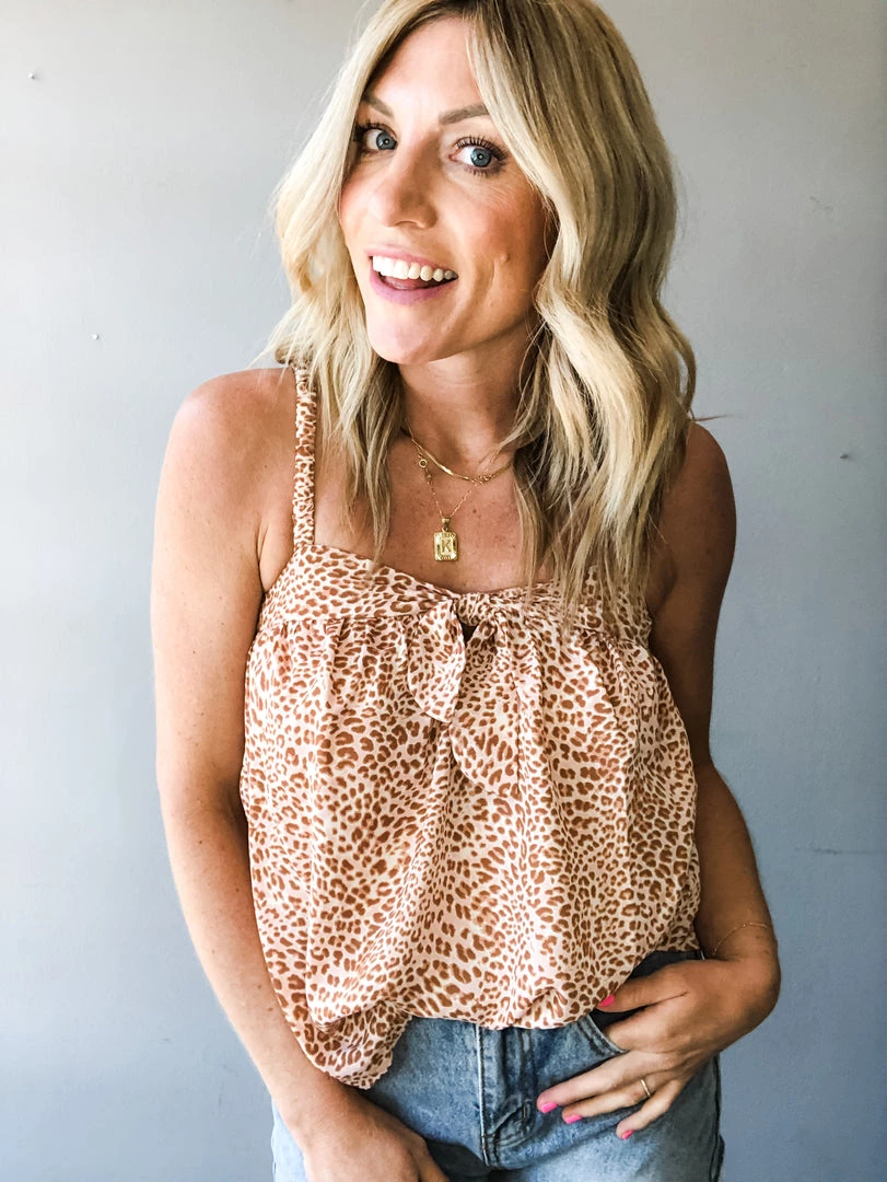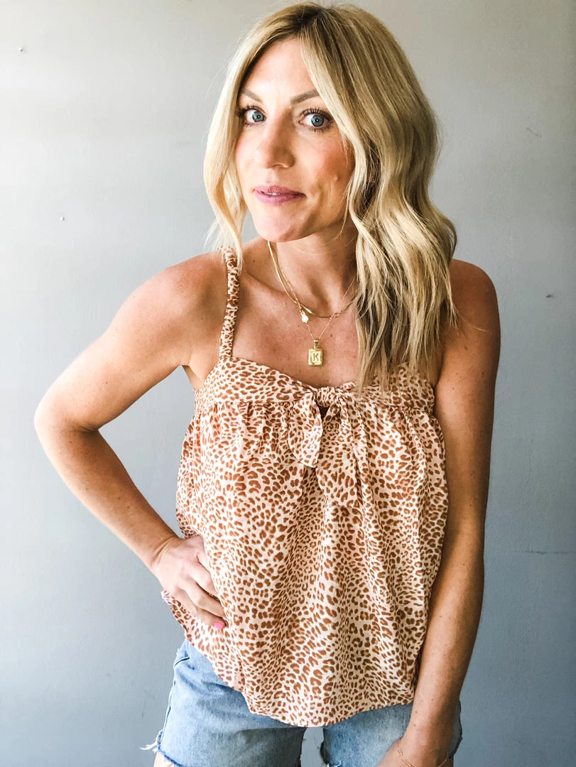 A loose fitting tank with tie front, smocked back and elastic shoulder straps. An easy top to wear for a night out paired with your go to denim.