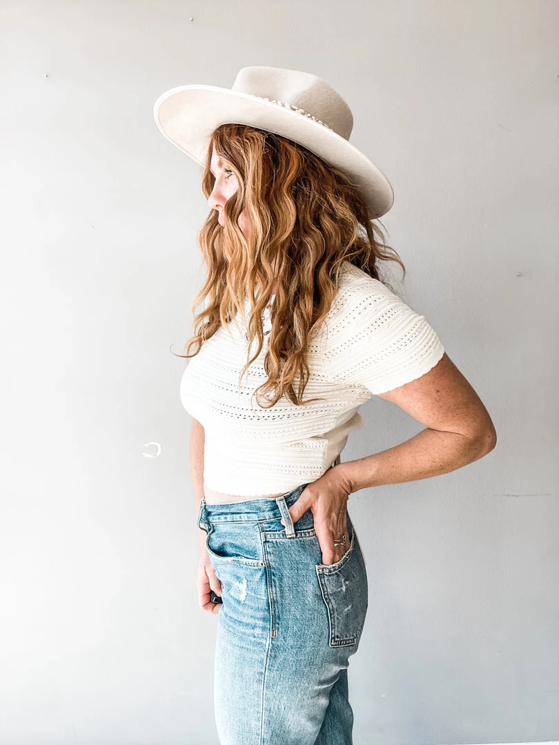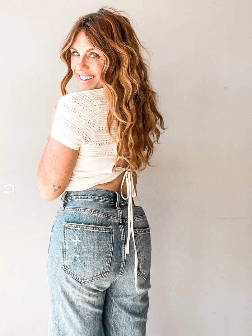 The Taylor Tie Back Knit Top is so dang chic, we can’t stand it. This super comfy creamy sweater style top is a fitted babydoll from the front, and open tie back from the back. Love this paired with your favorite vintage levi’s or worn with a great maxi skirt!!!