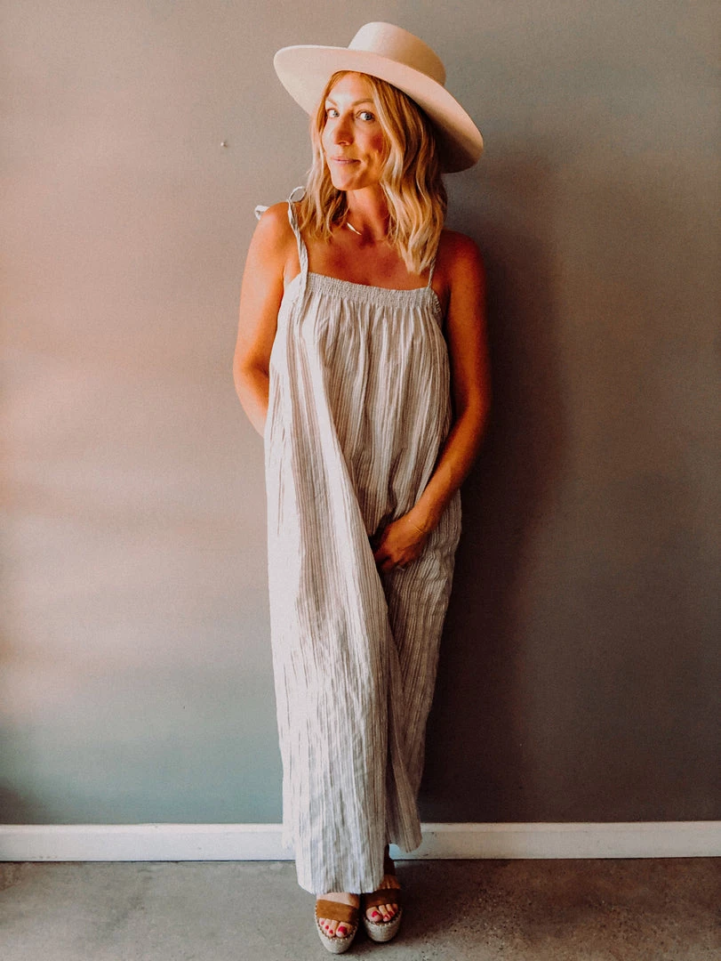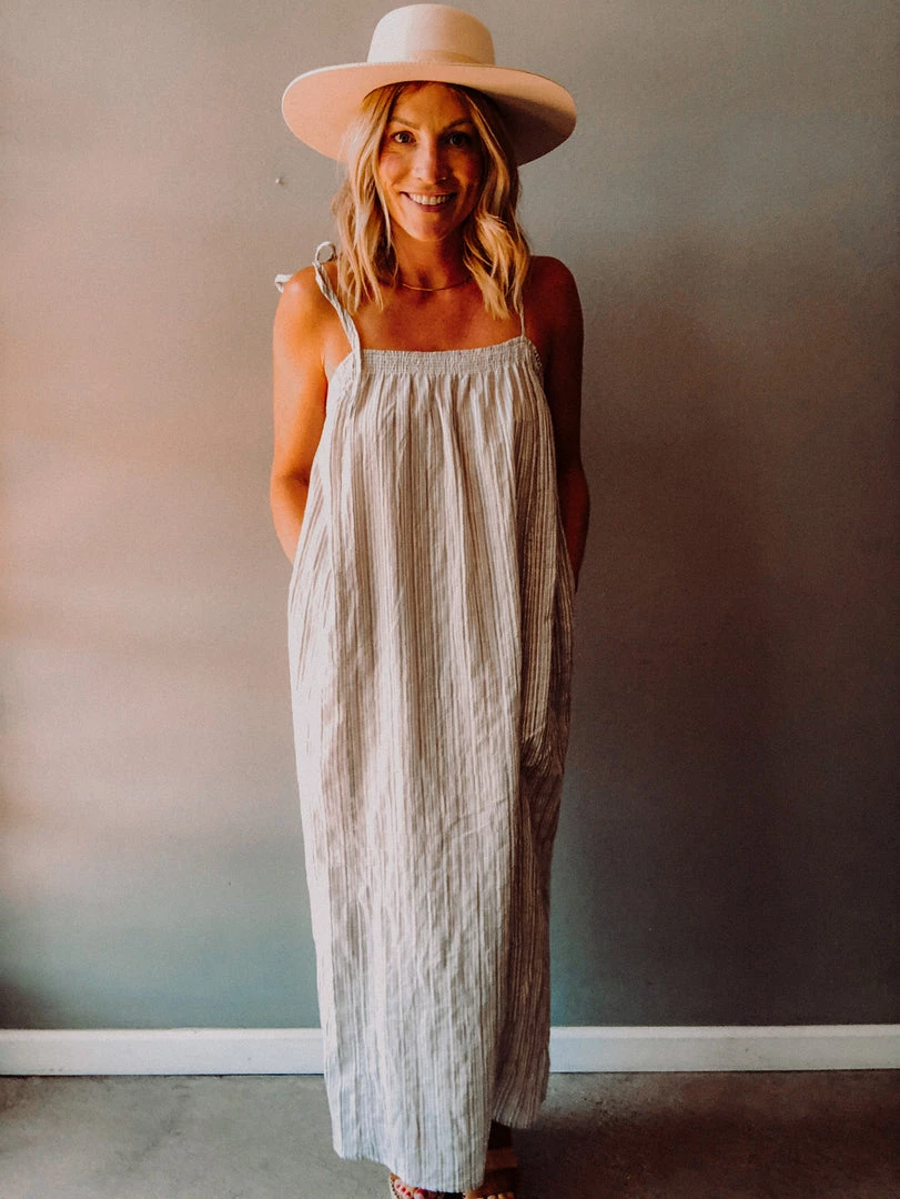 The willow dress is perfect for warm summer days. Easy enough for lounging in the backyard barefoot or throw on with slides and hit the pool. We also love it dressed up with wedges for a day date. Oversized fit with smocked detail across the chest, adjustable tie straps over the shoulders and left side slit.