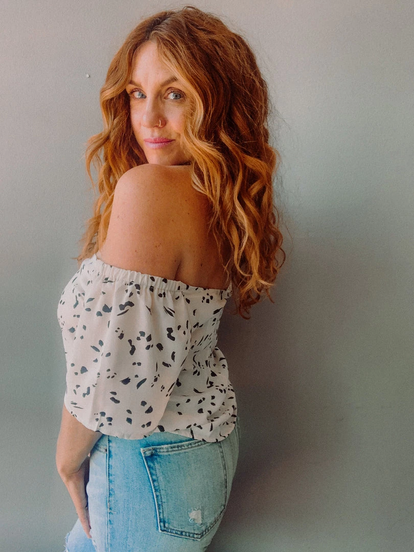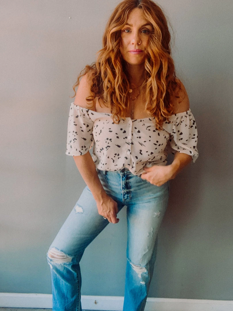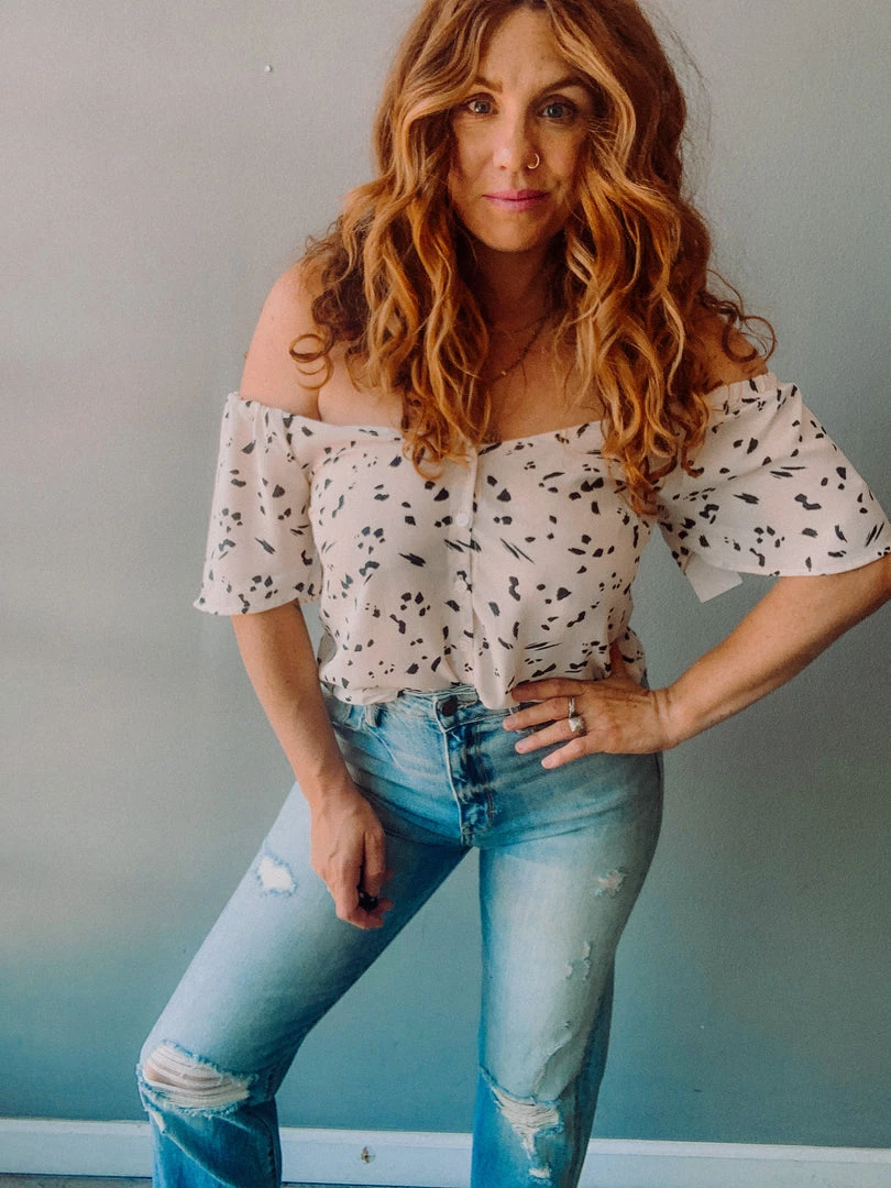 A flutter sleeve, button front cream top with black speckles. This loose fitting top is versatile, it can easily be taken from work to play. We love it tucked in with high waisted jeans.
