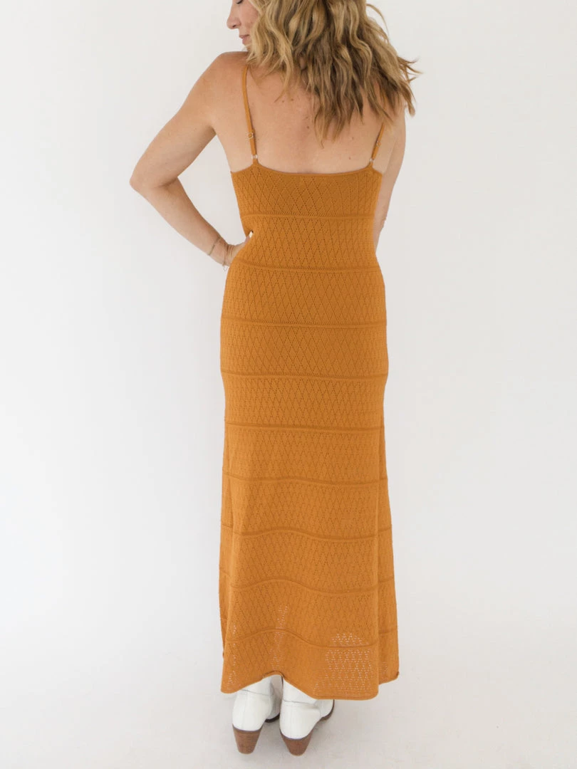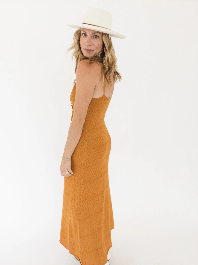 This gorgeous knit maxi dress comes in a rich caramel color and features a triangle top, a keyhole tie at the front, and spaghetti straps. It’s lined, weighted, and breathable. We think it’s perfect for a summer event or when you want to dress it up a little.Â