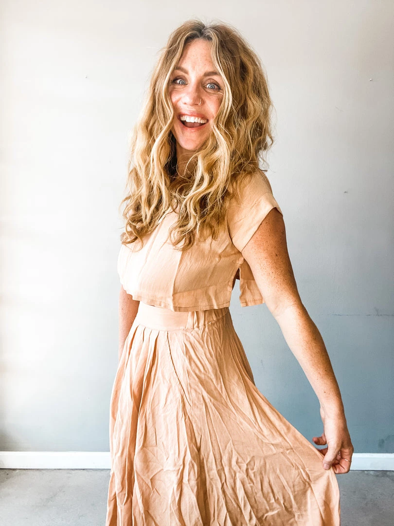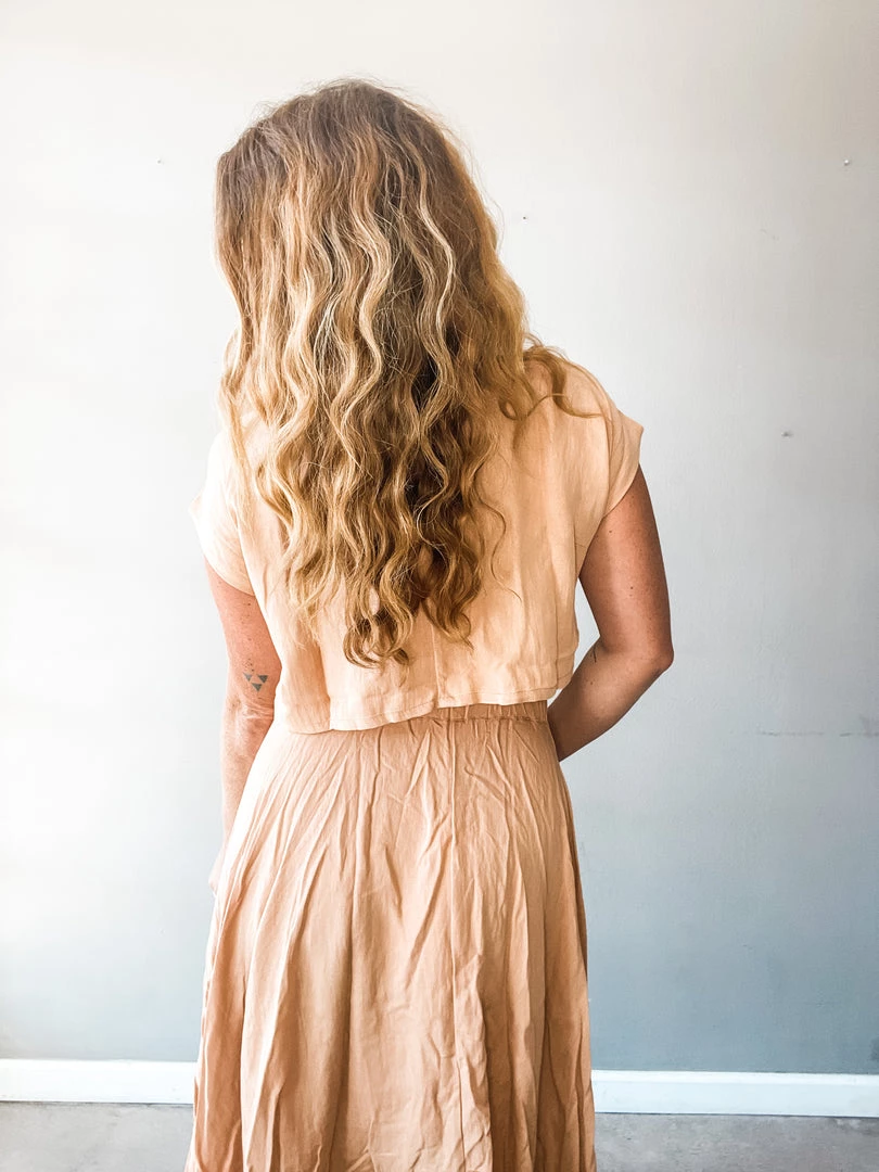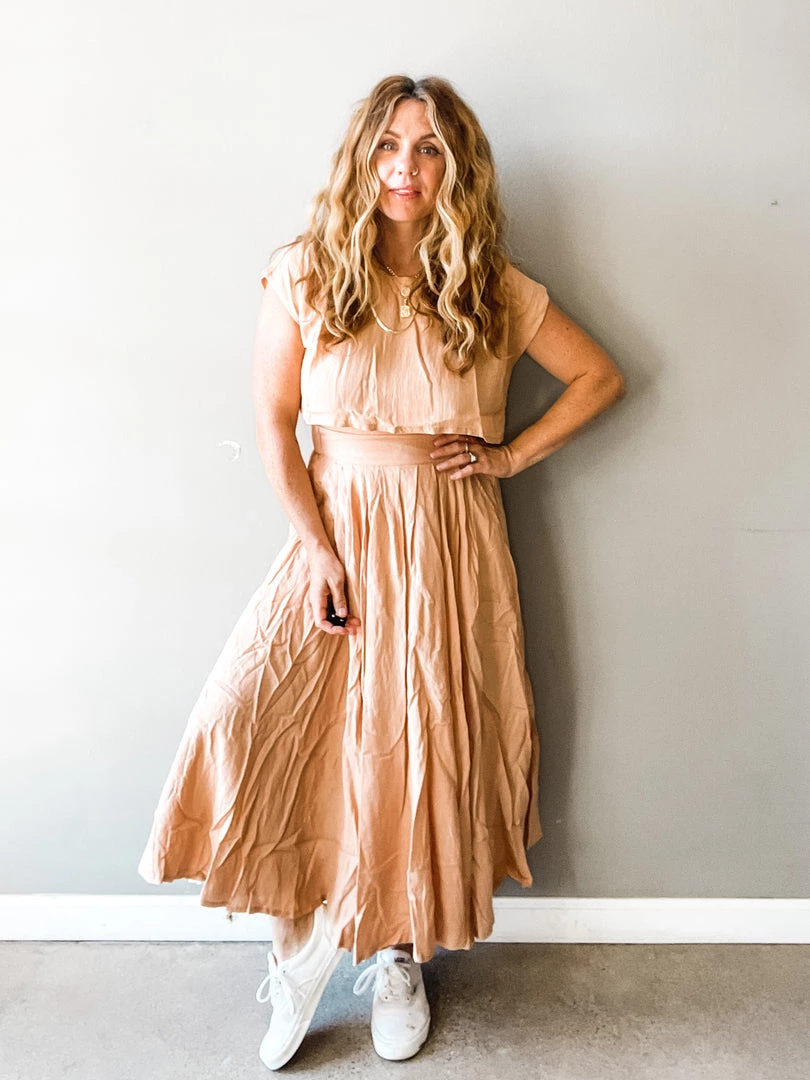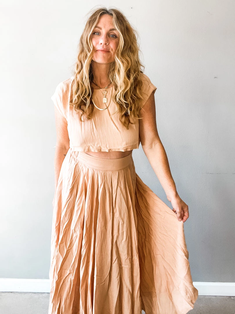 The Boardwalk set features a feminine crop top with matching midi skirt. The skirt has an elastic waistband and pockets! Wear as separates or as a matching set. Dress it up with a heeled mule for a weekend brunch, or try pairing with sandals or your favorite sneakers for a stroll down the boardwalk. Sold as a set.