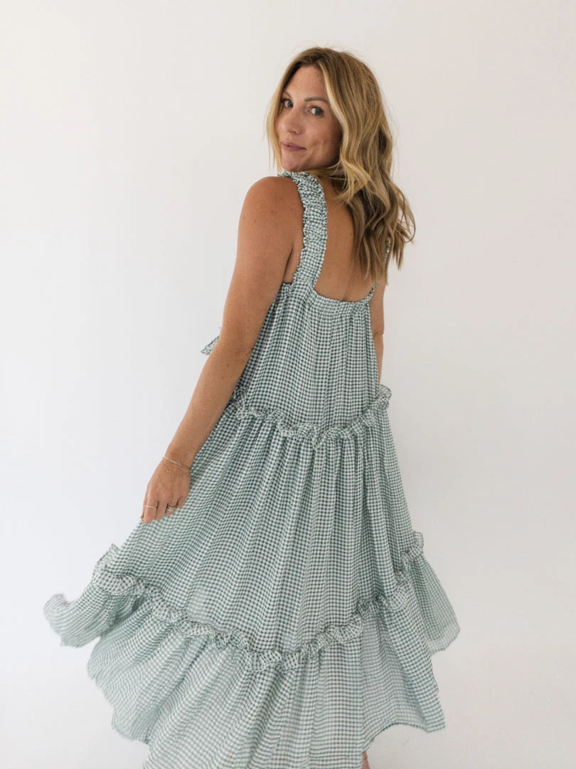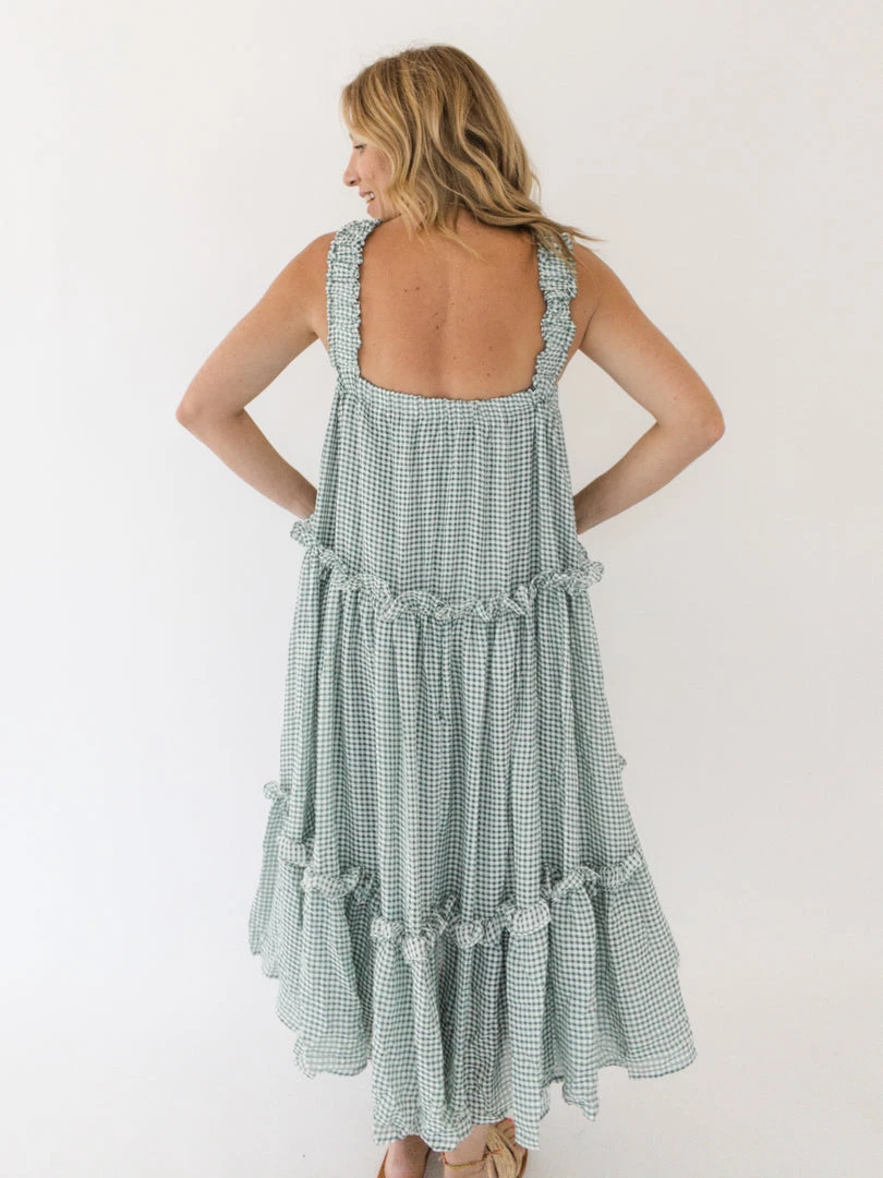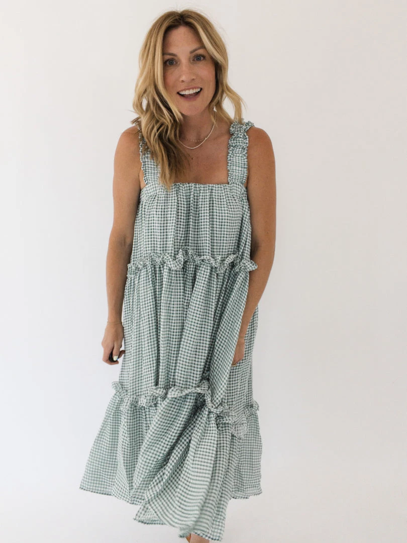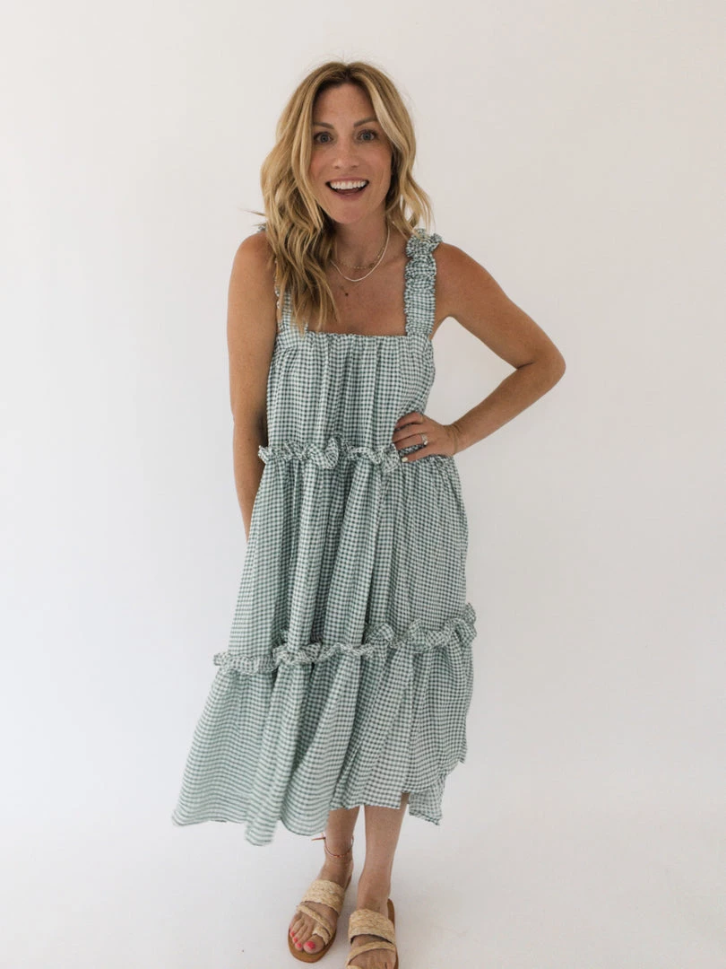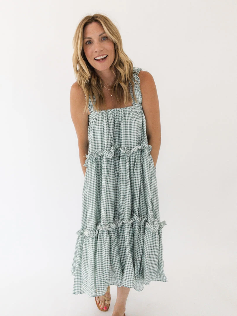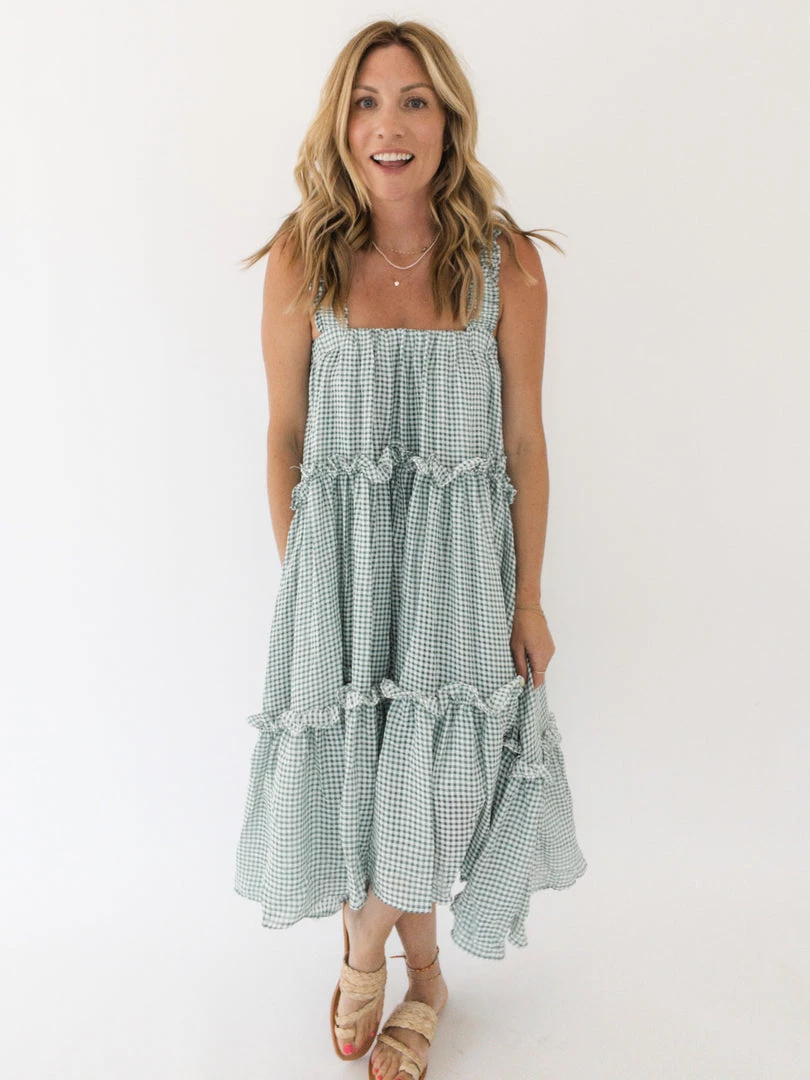 A checkered high low tiered ruffle midi dress with ruffled straps is sweet as can be. Pair with sneakers or a cute sandal for an easy summer dress.