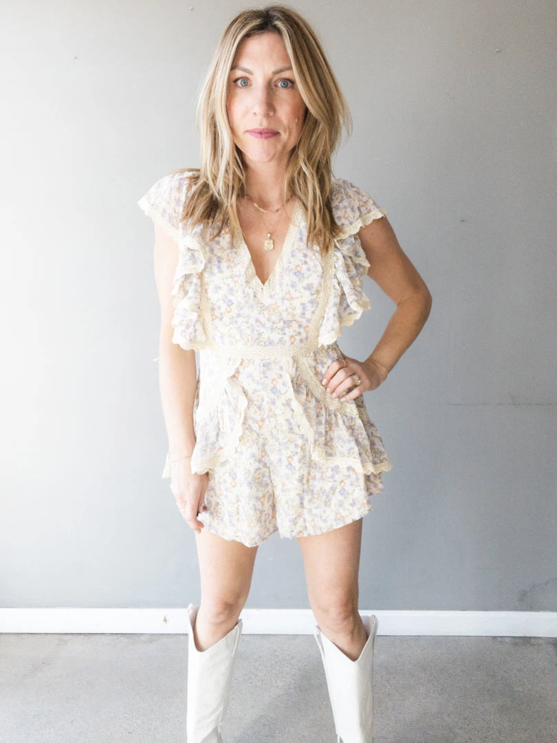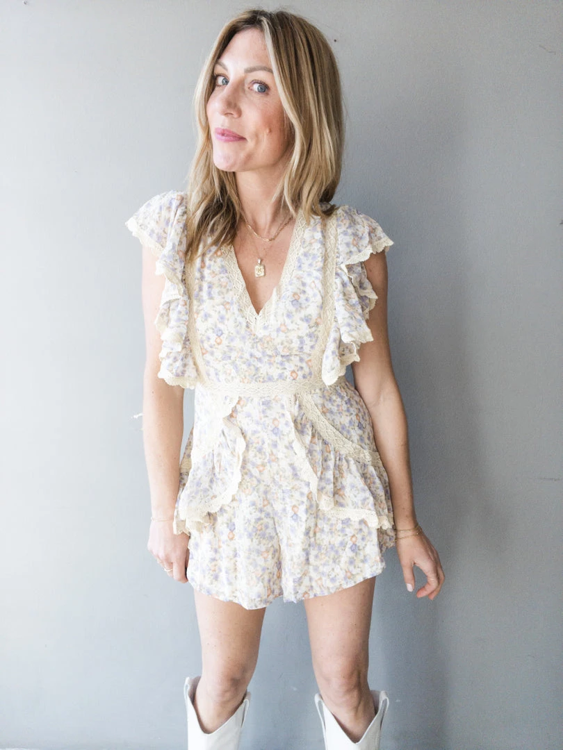 An all over floral romper with all the ruffle and lace details a girl can dream of. This short romper is so perfect for spring. In a cream, yellow and blue floral, this romper has ruffle trimmed sleeves with a lace inset, v-neck and ruffle along the hips of the short. Lined and with a zipper closure at the back. A great fit and a sweet feminine romper for all your upcoming outings this spring.