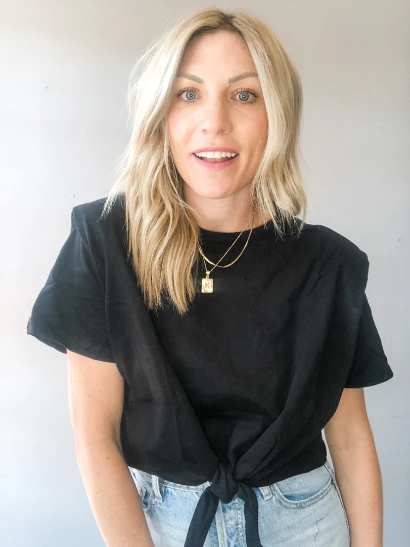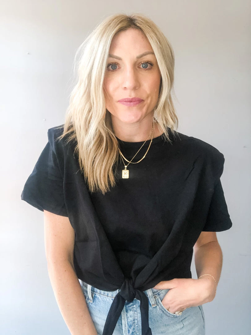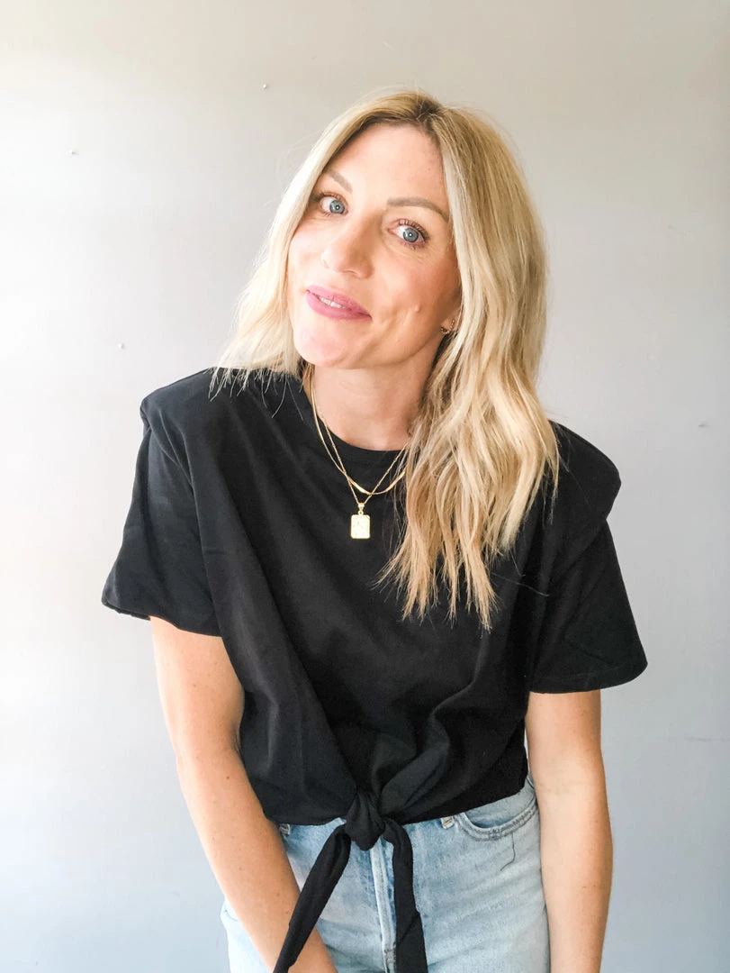 A cropped crew neck tee with front tie and shoulder pads for a fun fashion forward look. Pair with denim and take her on a night out for a casual look twisted up a notch.