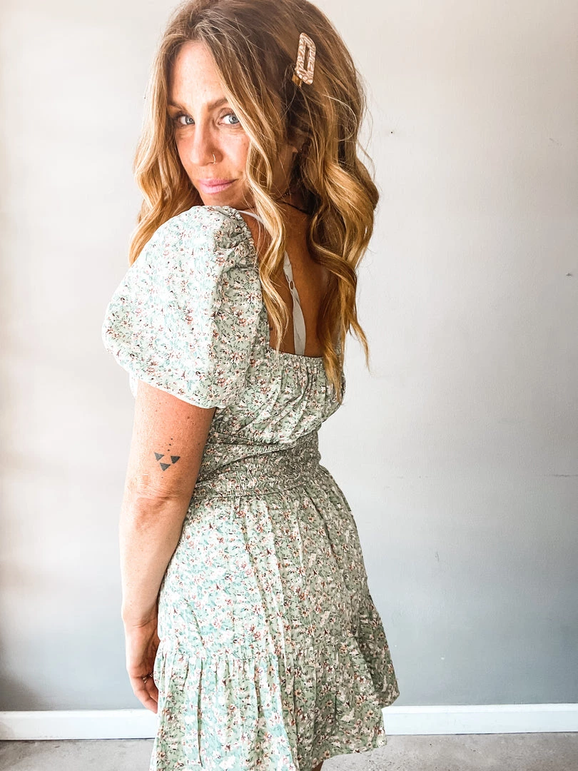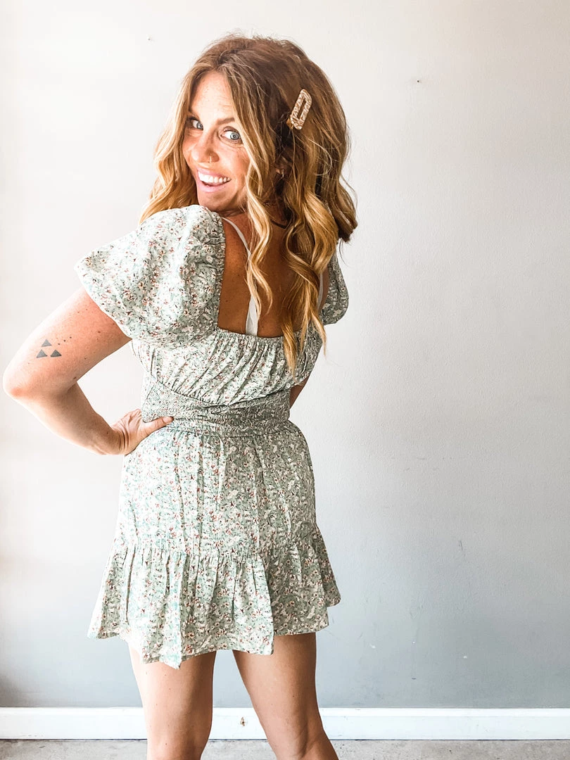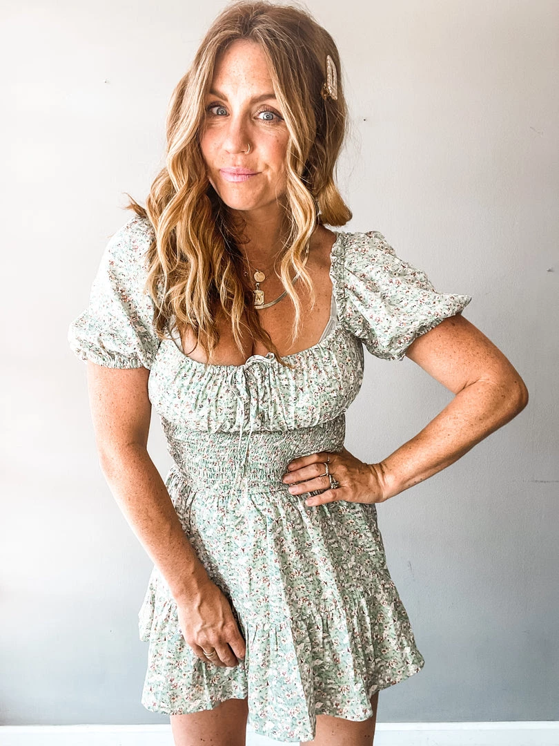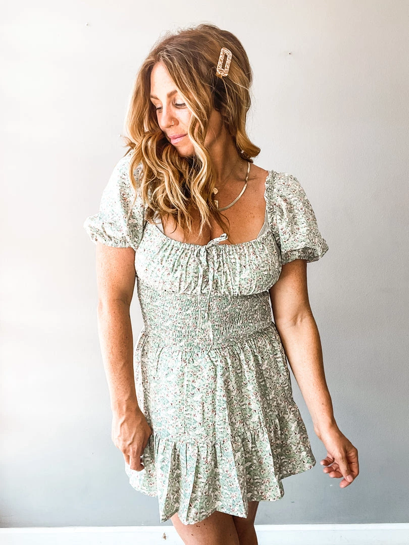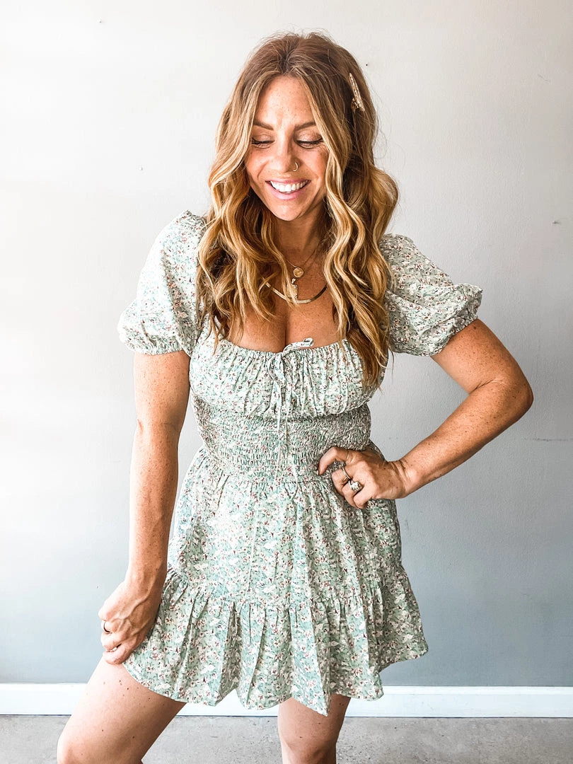 A floral mini dress with balloon sleeves, smocked mid section with center front tie. Such a great little dress that is so versatile. Pair with sneakers. Layer under a denim jacket. Dress up for a special occasion. A great fit for various body types!