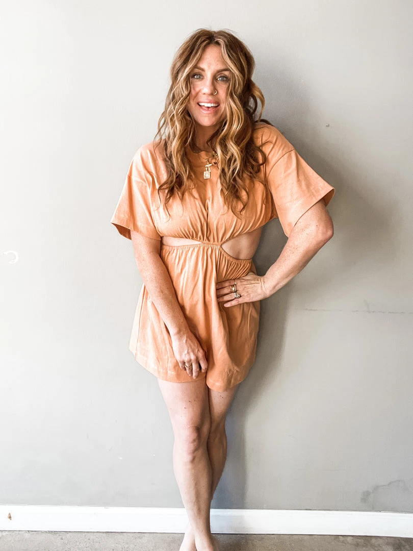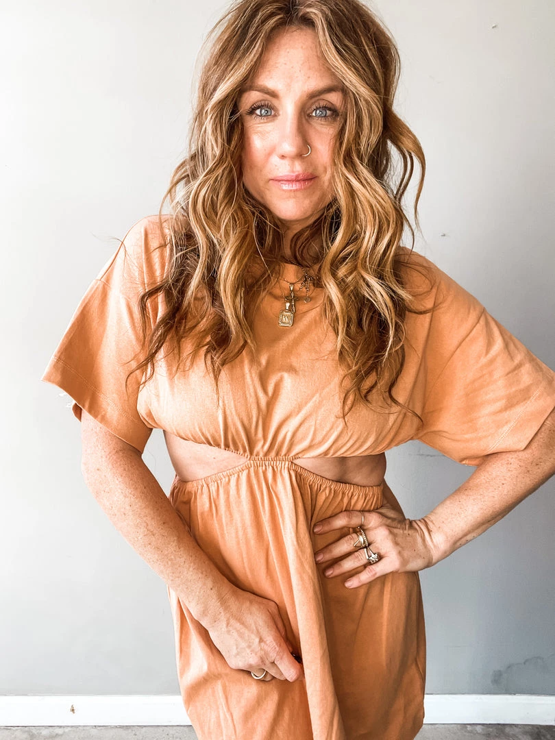 This mini dress takes your basic cotton dress and gives it a fun update!! This 100% Cotton mini is the perfect toss on piece!! Wear it over your swim or paired with sneaks or slides for some fun weekend plans. A classic crew neck, this short sleeve dress has cut out sides for a flirty peak of skin with an elasticated waistline for a stay-put fit.