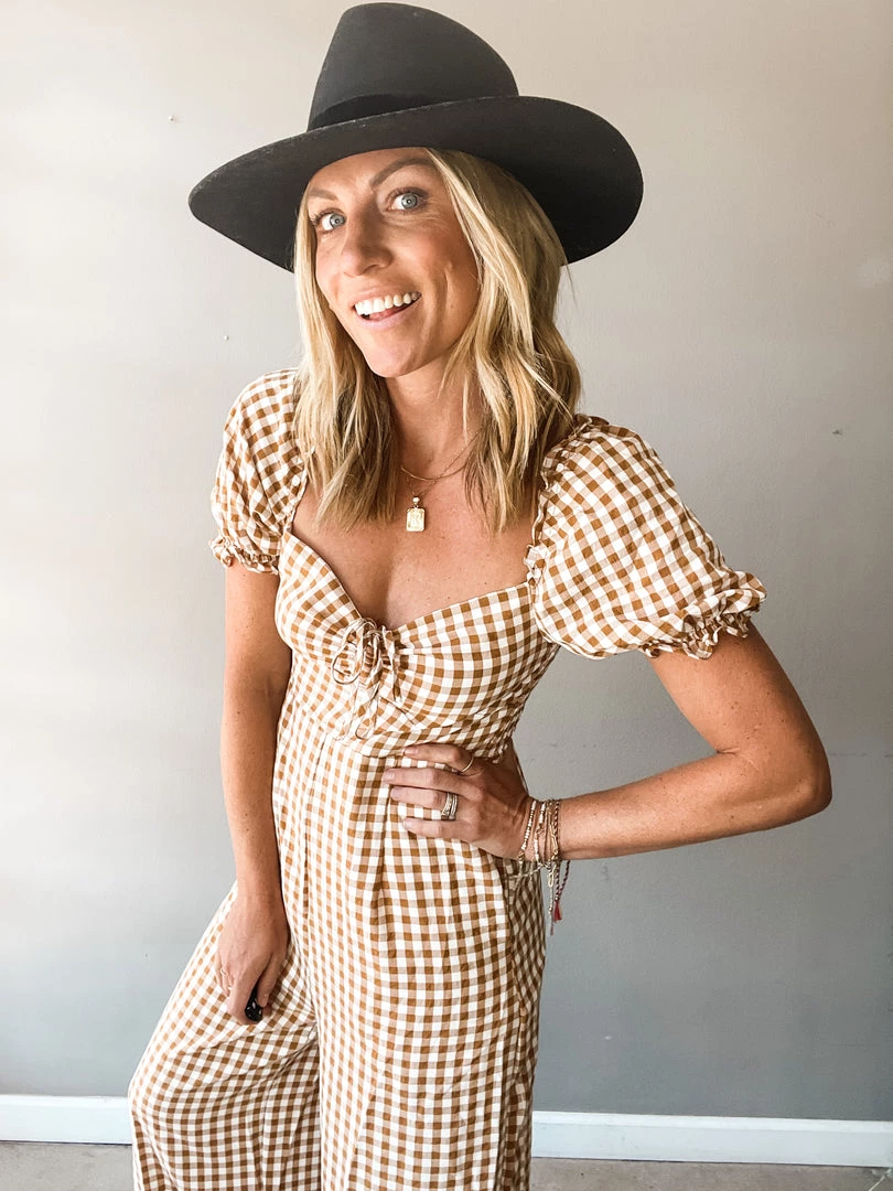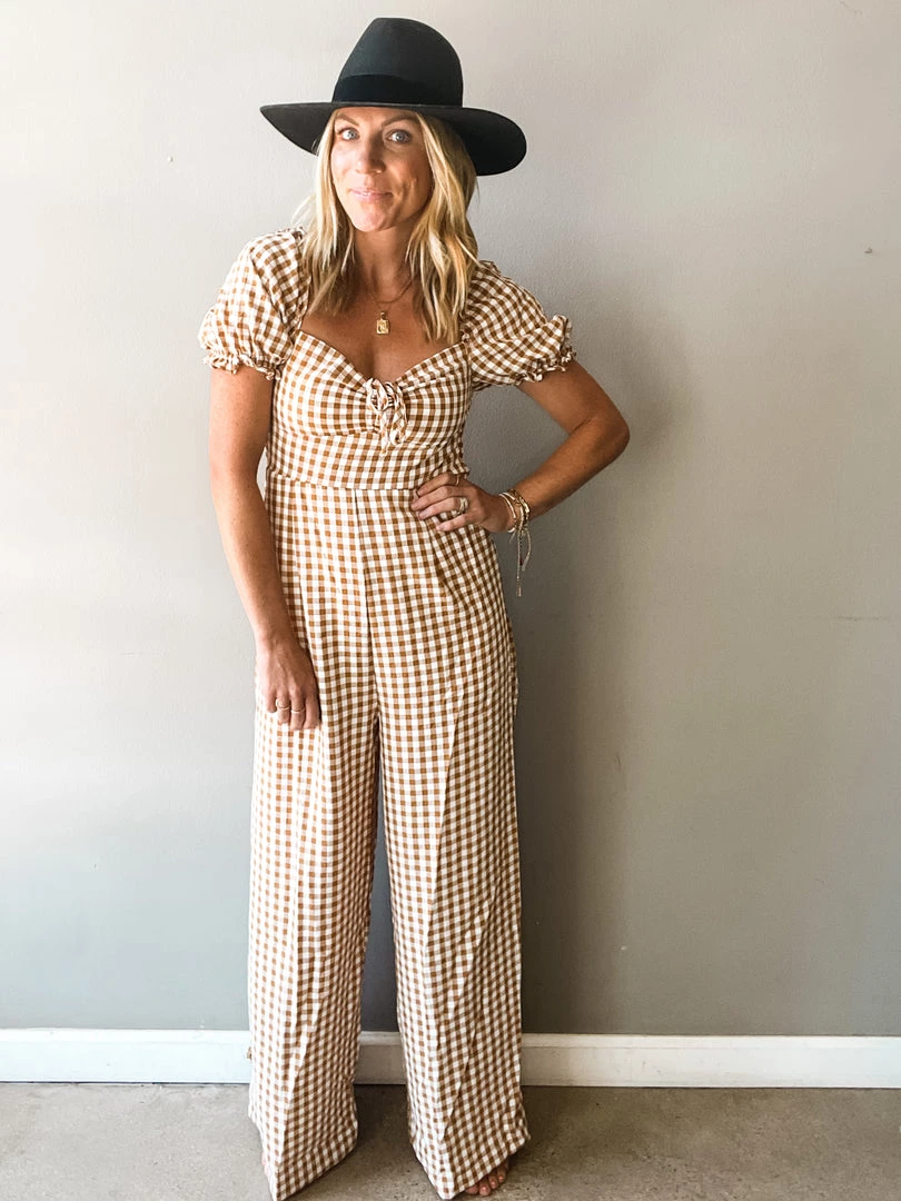 Ready to dance the night away in this gingham jumpsuit. Balloon sleeves, with long wide legs and center front tie. Back smocking with zipper closure. Love it paired with a heel or bootie and your go to wool hat.