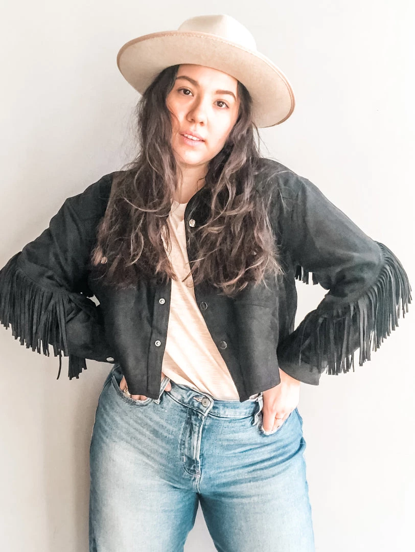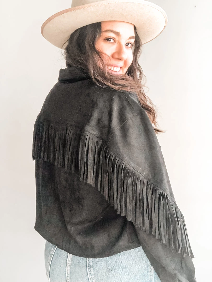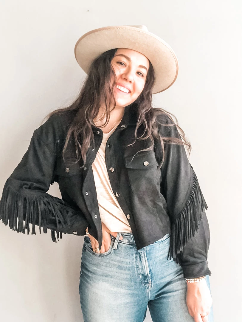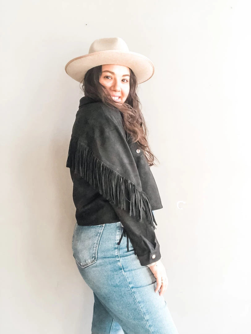 Feelin fine in Fringe!! This suede jacket is a cropped version of a classic western style fringe staple!! A long sleeve snap button closure jacket with double breast pockets and fringe through the back and sleeves. Dress is up or down, with jeans and a tee or tossed over any holiday midi. This jacket is so comfy on and has just a weighted fit to it keep it cozy and just the right amount of stretch for easy all day wear.